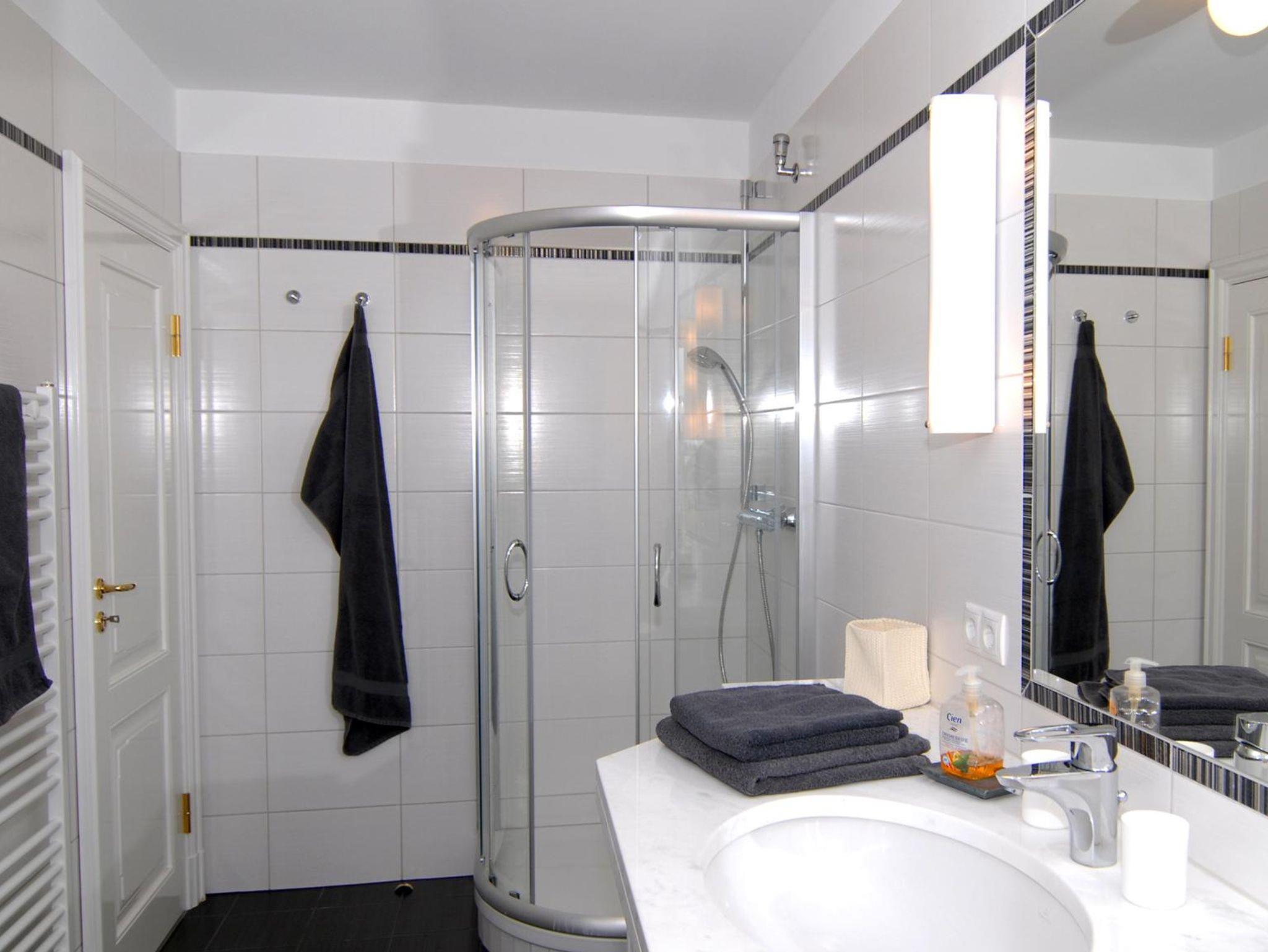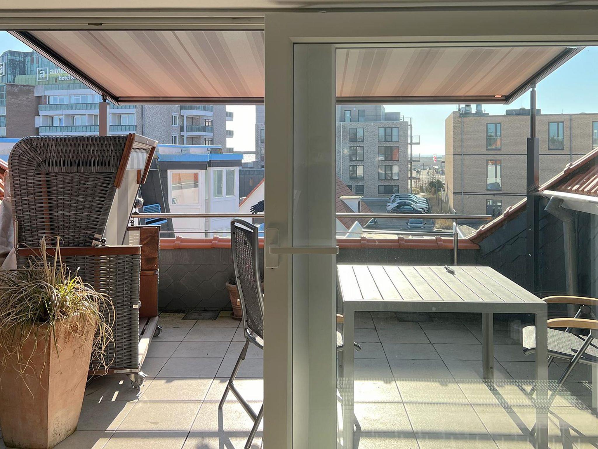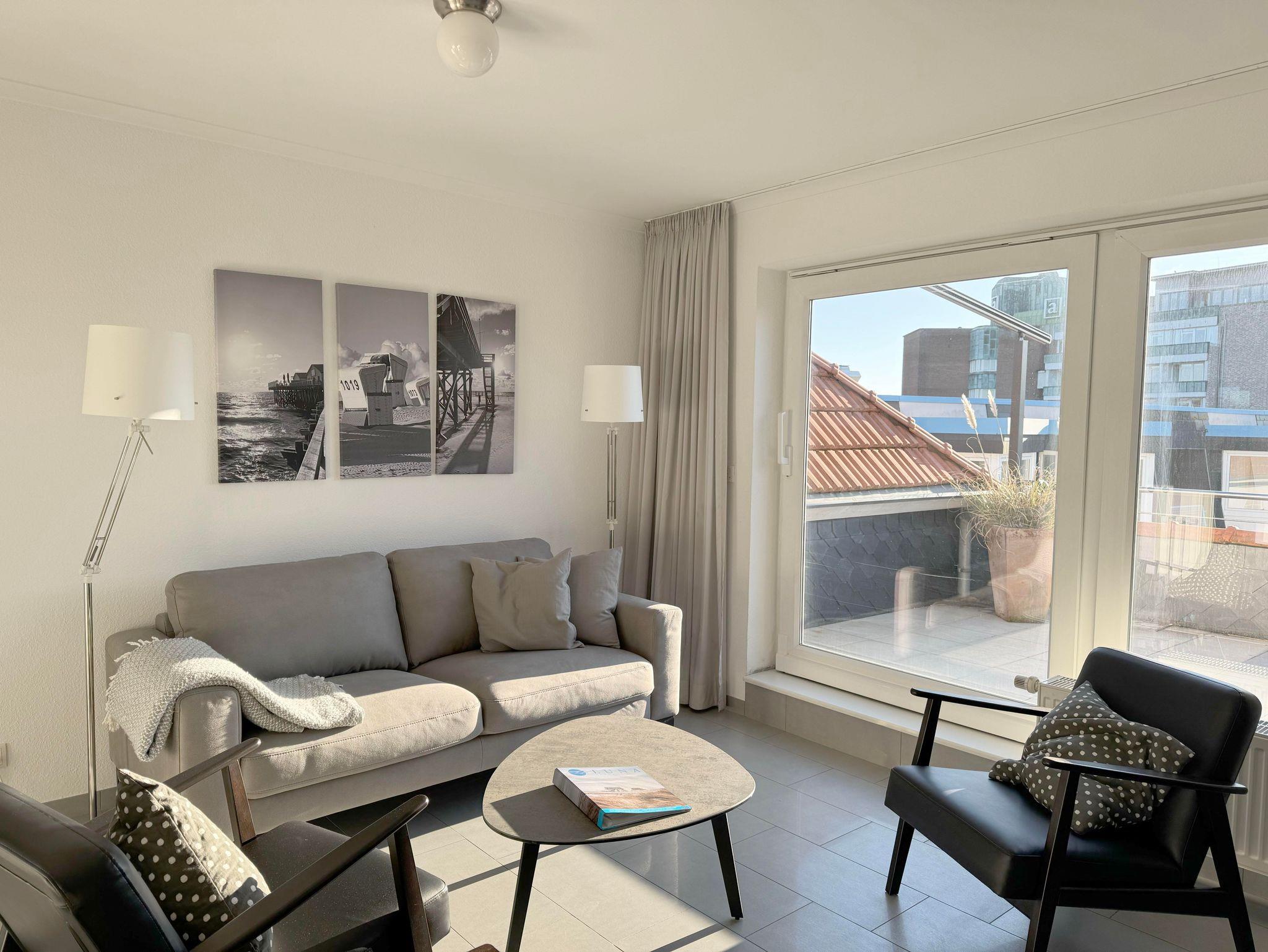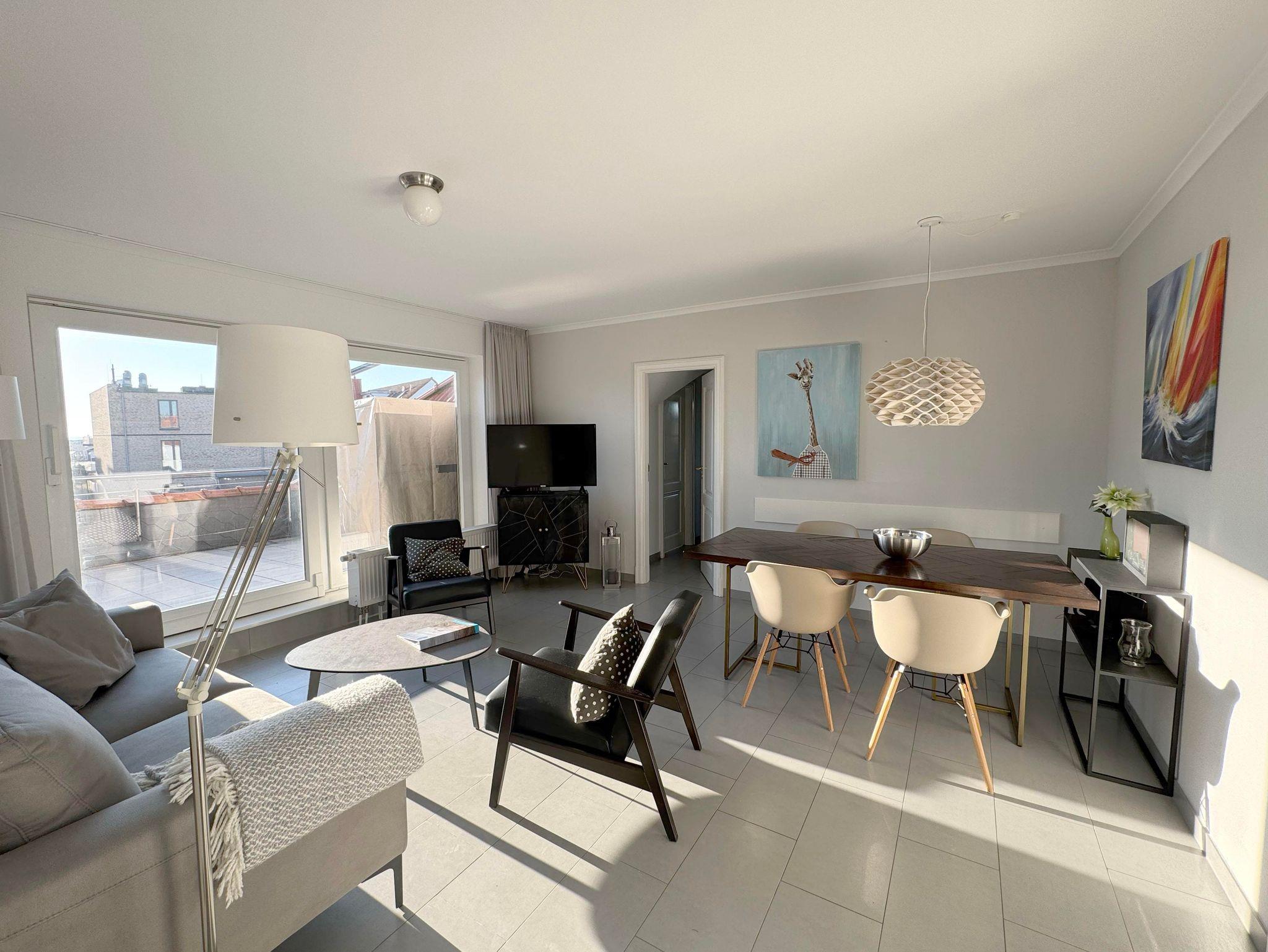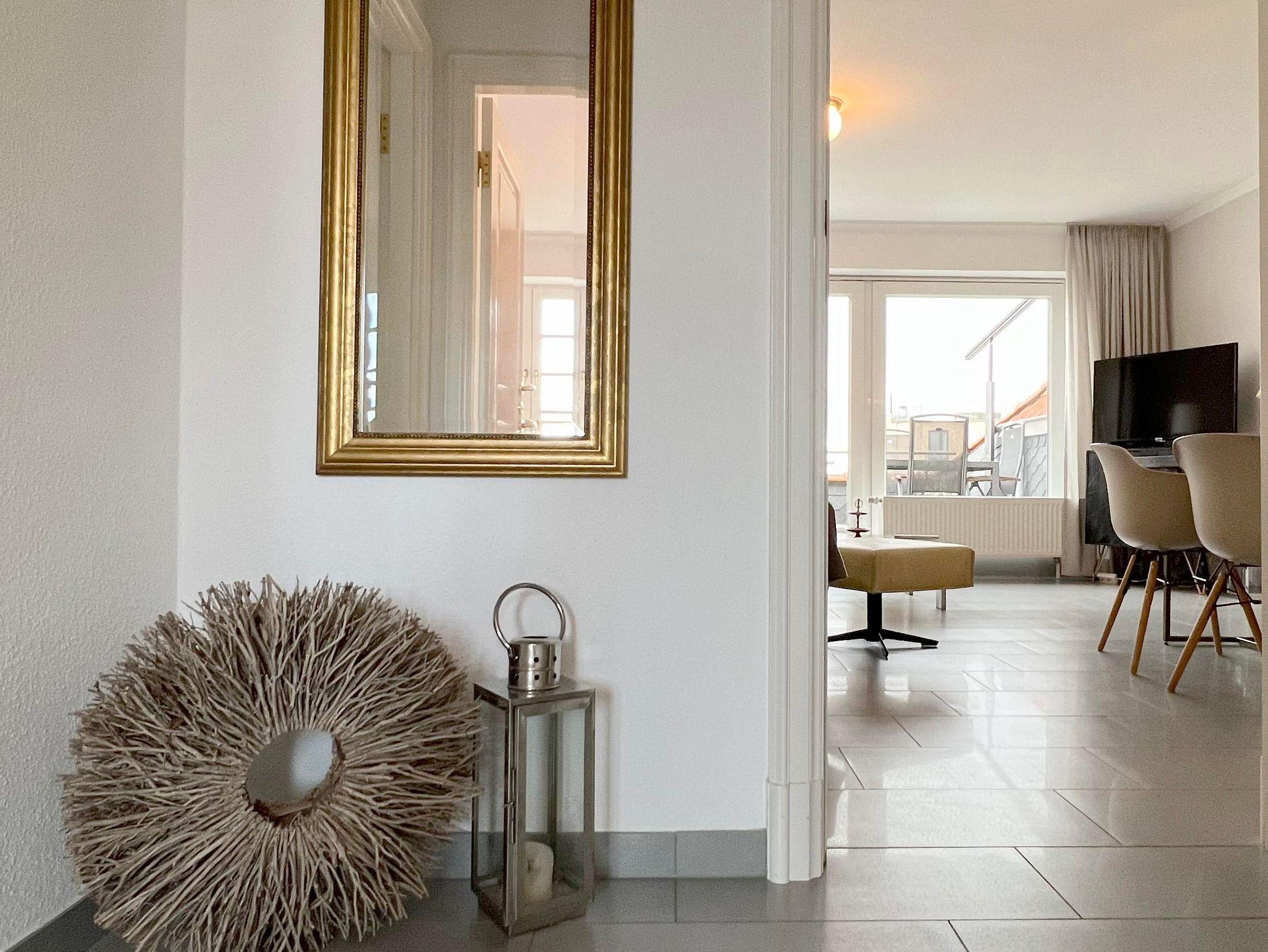 Moderne, exklusive mit 4 DTV Sternen ausgezeichnete Ferienwohnung im 2.Obergeschoss eines Geschäftshauses mit teilweise Meerblick und großer Dachterrasse für 2 - 4 Personen mitten im Zentrum.