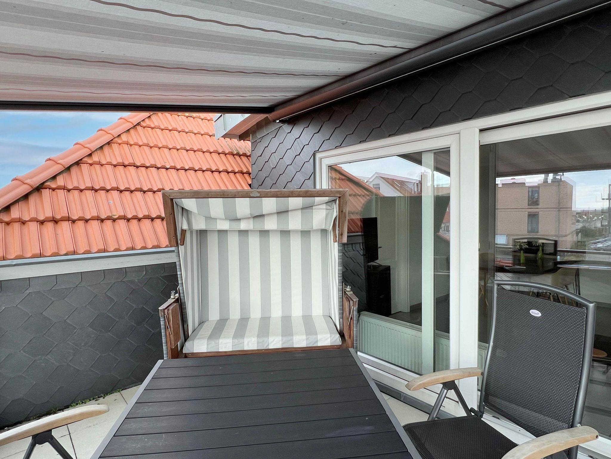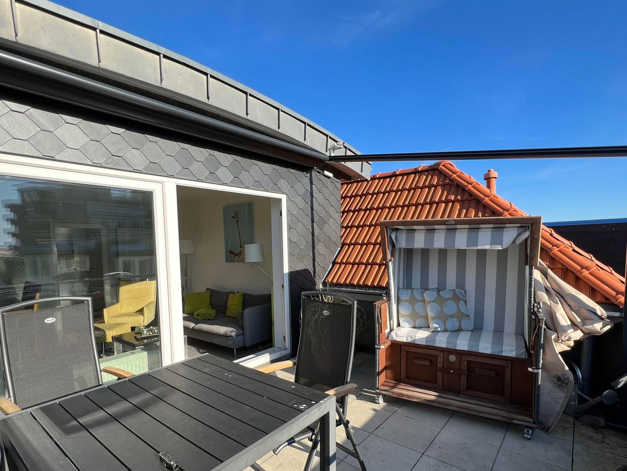 • Dachterrasse mit Gartenmöbeln und Strandkorb