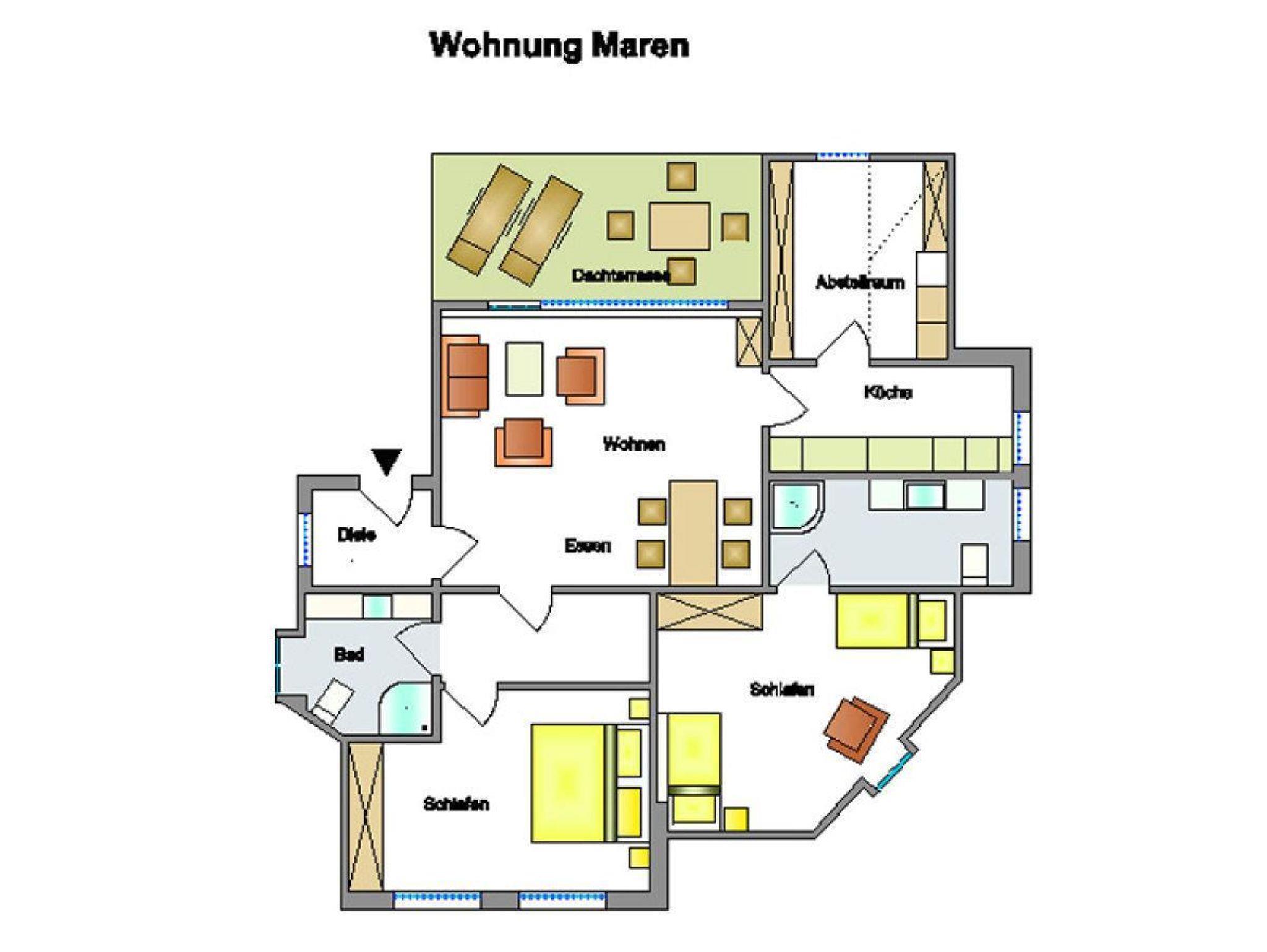 Eingangsbereich mit Garderobe, großzügiger, heller Wohnraum mit direktem Zugang zur Dachterrasse, Essecke, separate Küche mit Hauswirtschaftsraum, 1 Schlafzimmer mit Doppelbett, 2 Duschbäder , 1 Schlafzimmer mit 2 Einzelbetten.