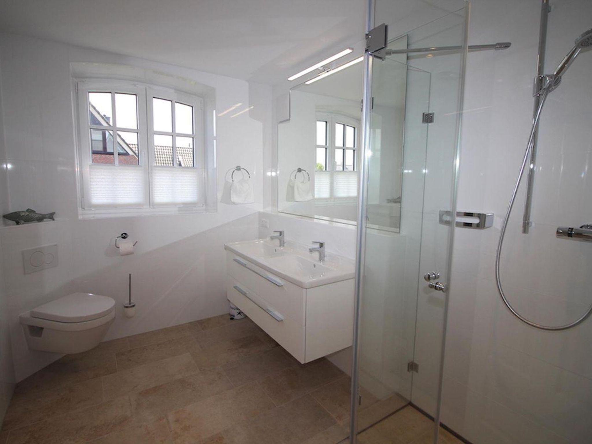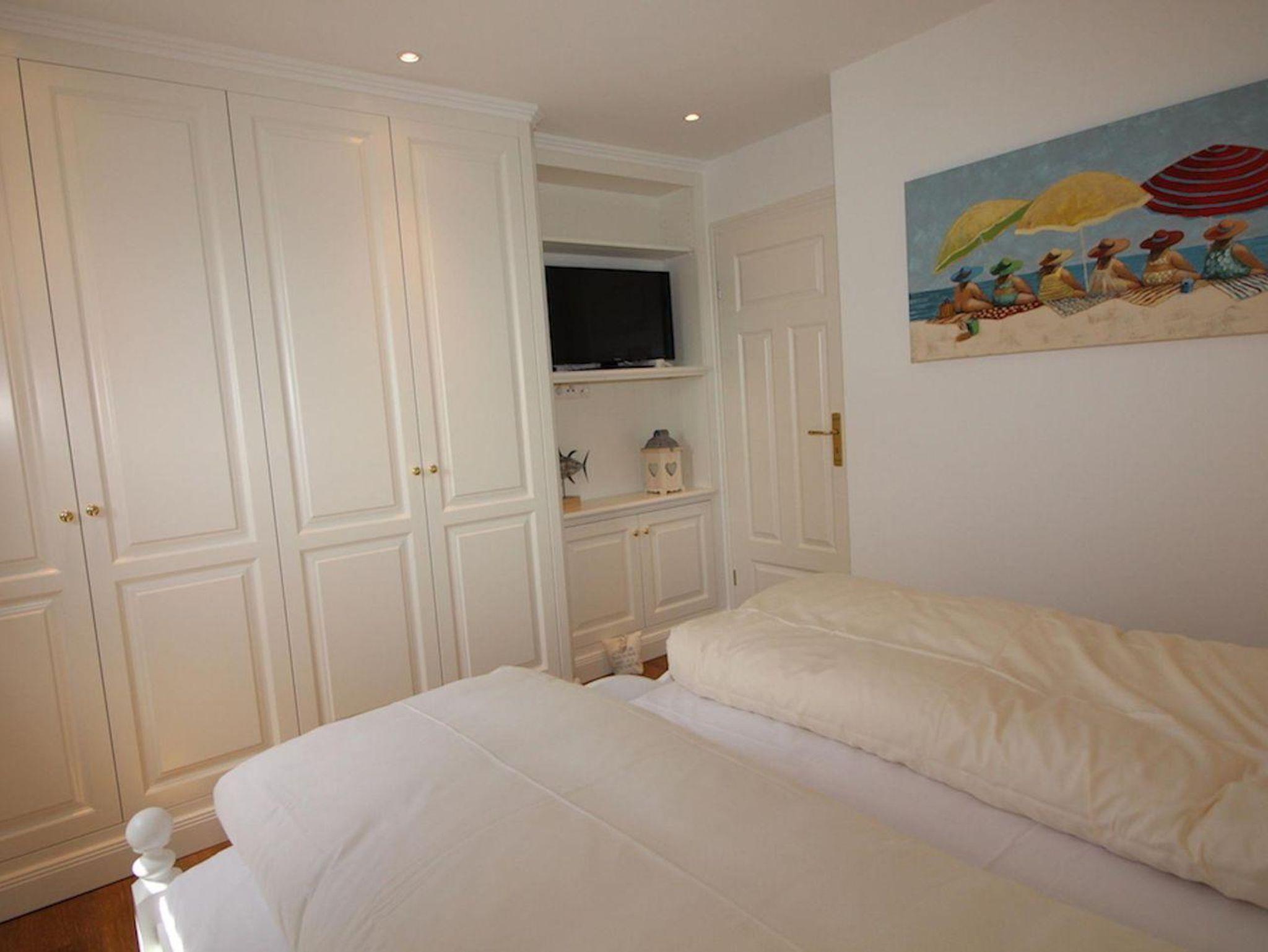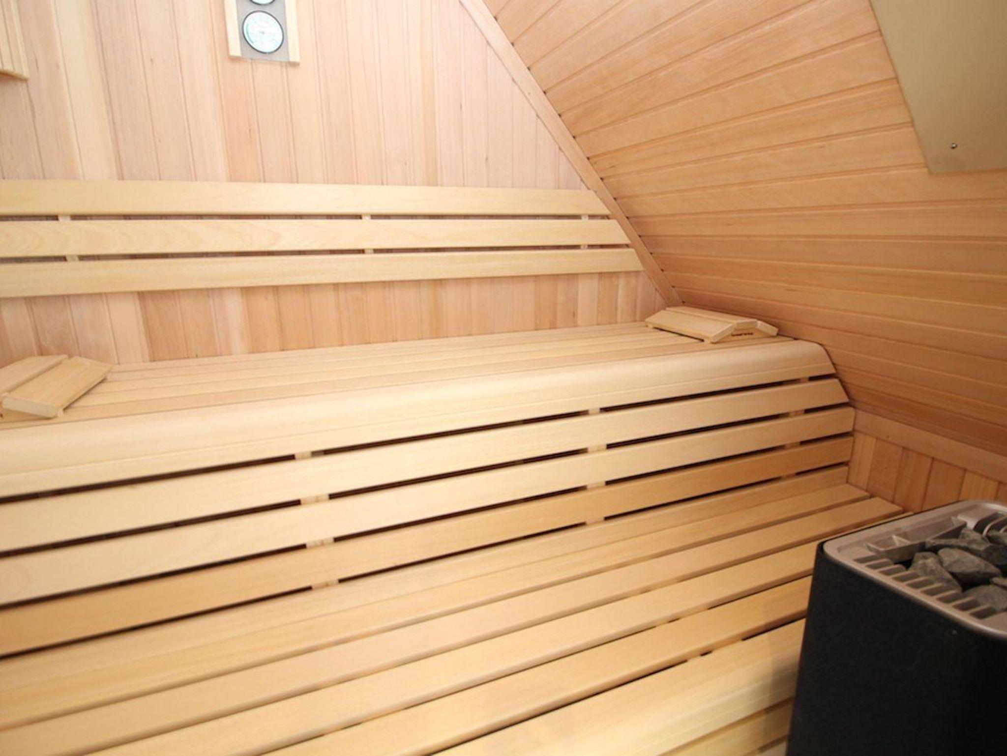 Über eine Holztreppe gelangt man in das mit Parkett ausgelegte Obergeschoss. Dieses verfügt ebenfalls über eine Fußbodenheizung. Die beiden Schlafzimmer, jeweils mit einem Doppelbett, sind ebenfalls mit TV ausgestattet. Einbauschränke gewähren Ihnen hinreichend Ablageflächen. Darüber hinaus befinden sich im Obergeschoss zwei weitere, geräumige Bäder mit Dusche. Für zusätzliche Entspannung sorgt eine Sauna mit Sternenhimmel.