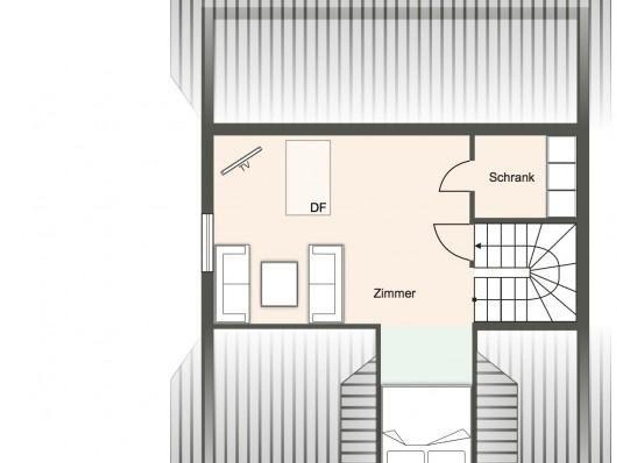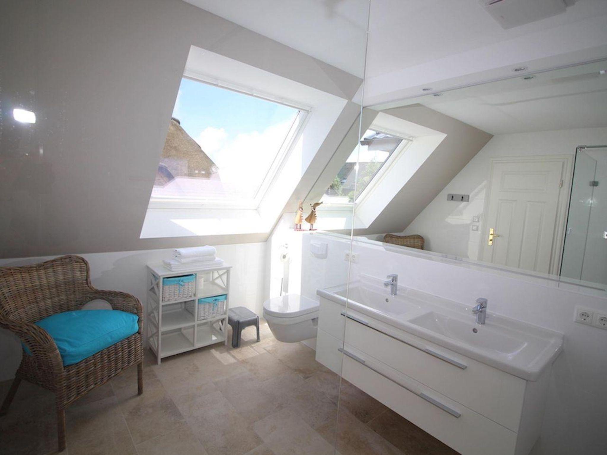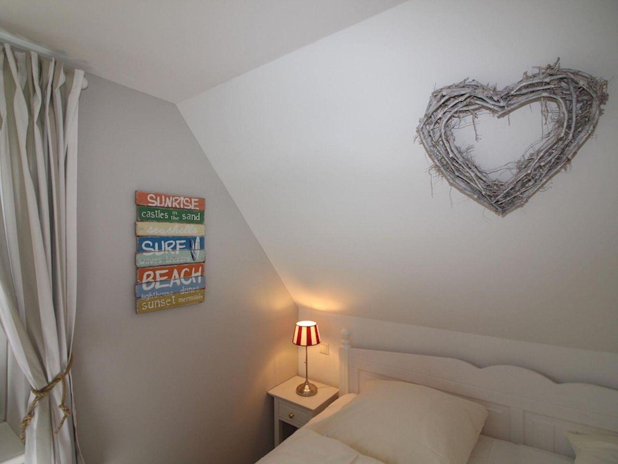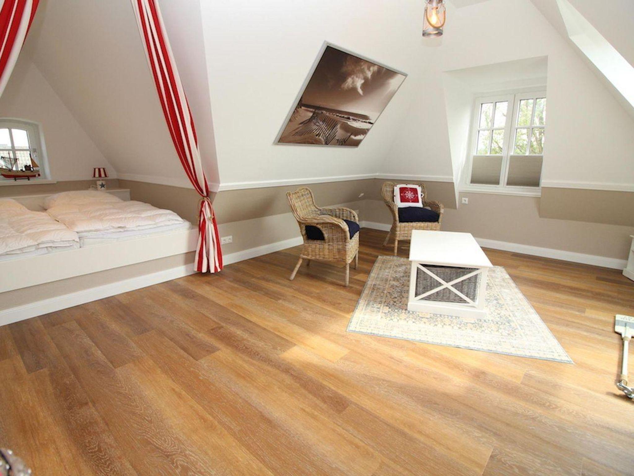 Vom Obergeschoss führt die Holztreppe hinauf in das Dachgeschoss. Ein drittes Schlafzimmer mit Doppelbett, Sofalonge und großen Fenstern mit Blick bis zum Wasser erfüllt jeden Urlaubstraum.