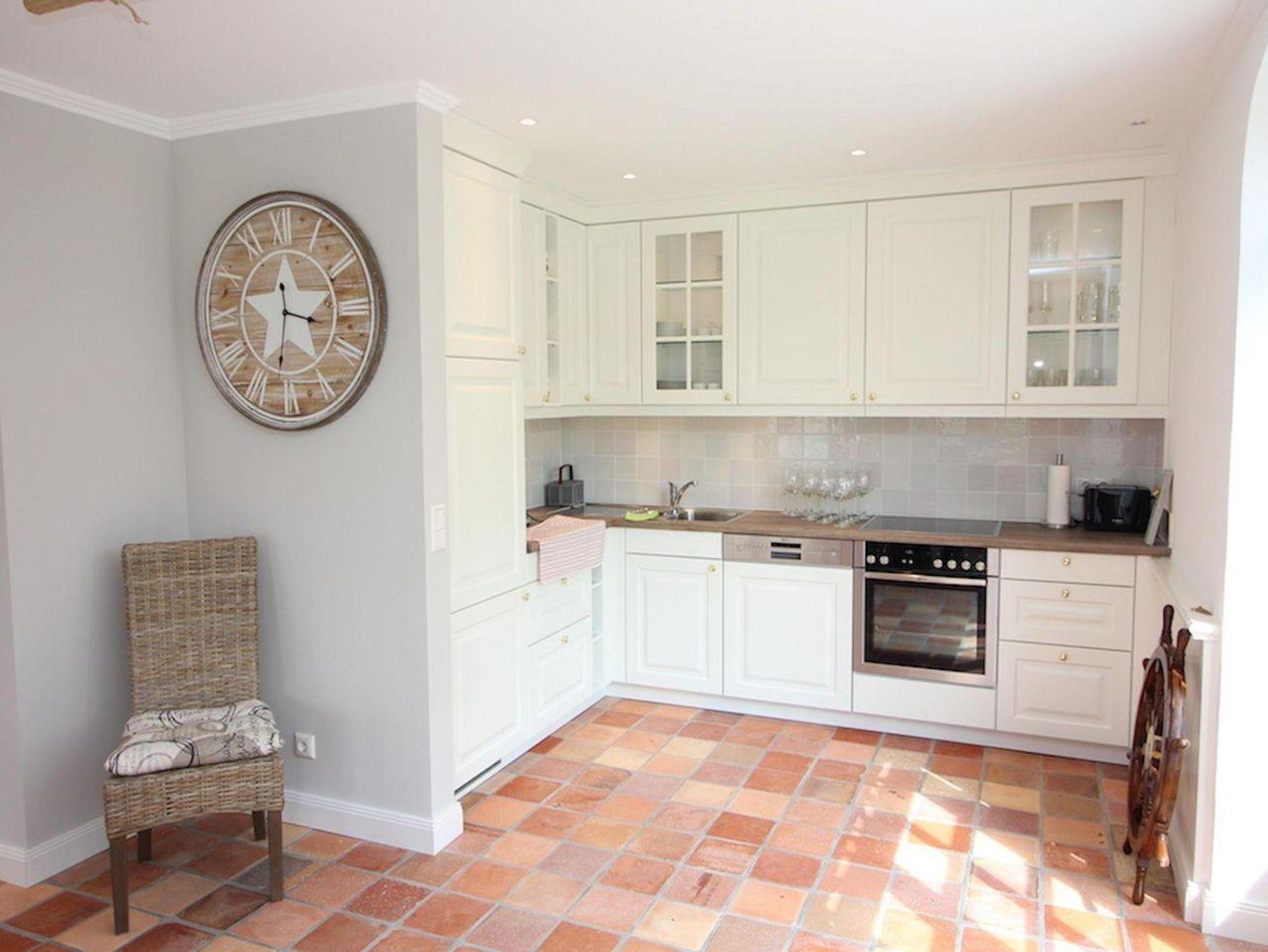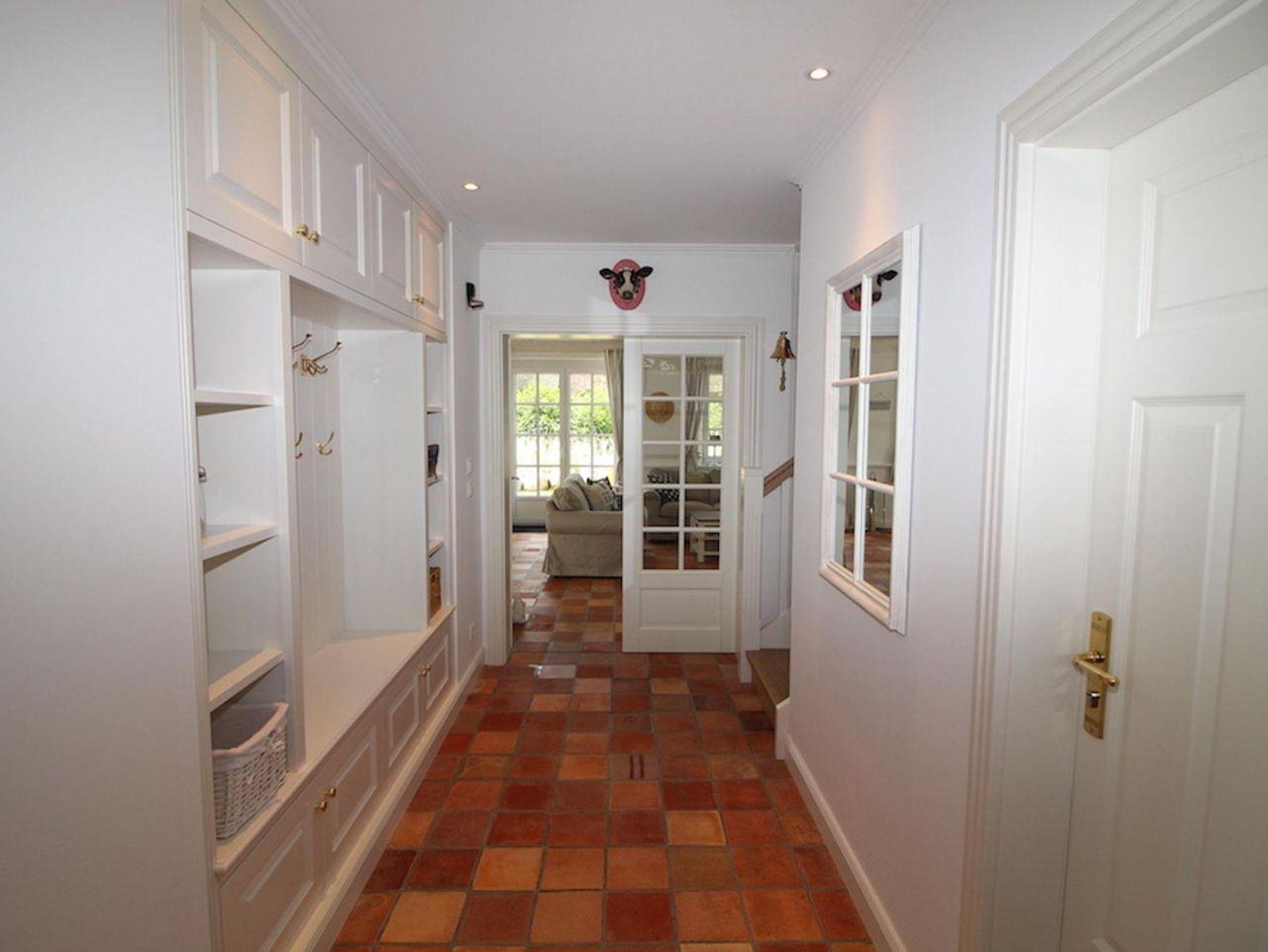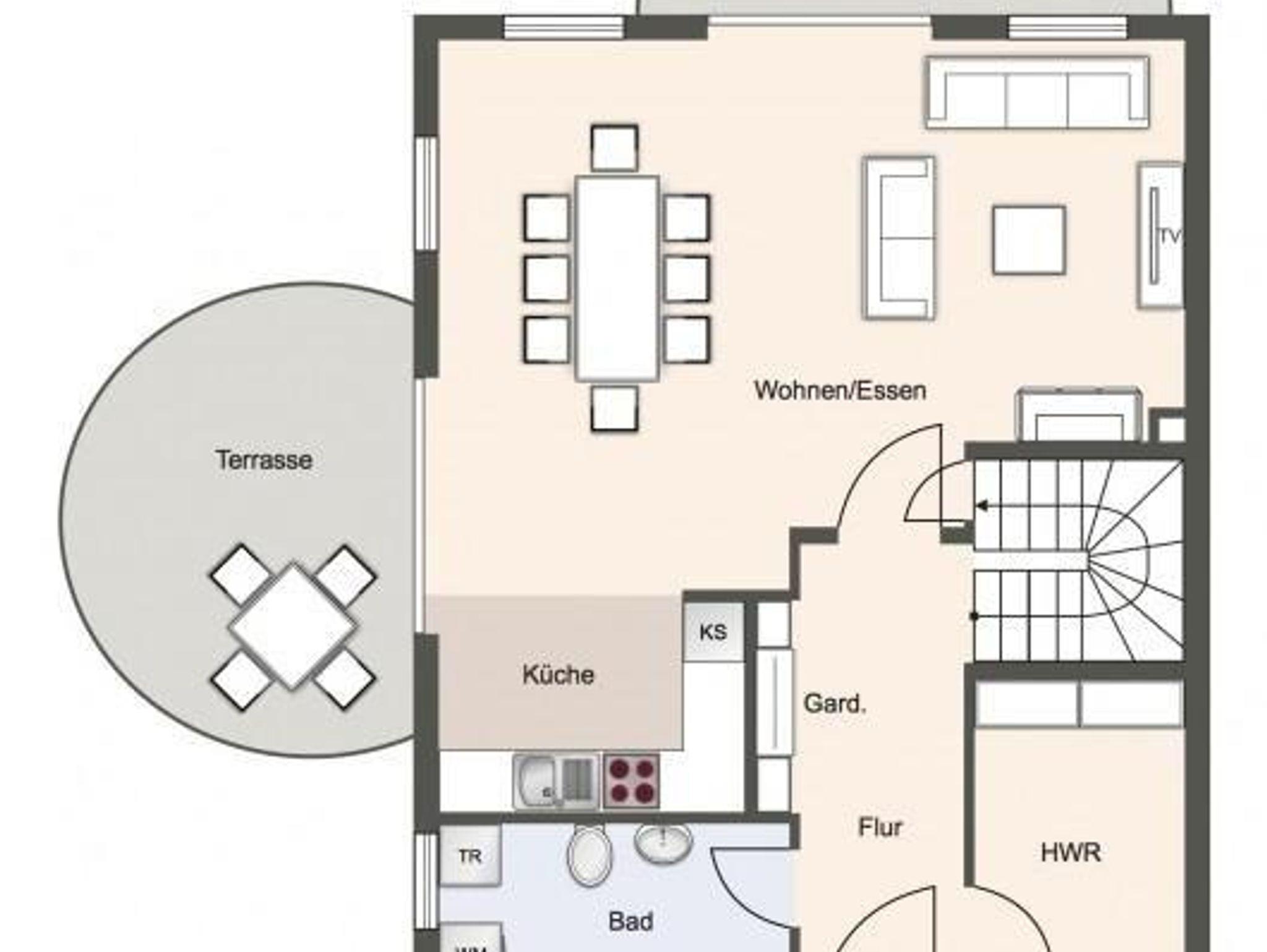 Im Erdgeschoss befindet sich der lichtdurchflutete Wohnraum mit TV, Kamin, einer offenen Küche sowie einem stilvollen Essbereich. Die Wohnräume sind mit exklusiven Möbeln ausgestattet. Die Küche verfügt über hochwertige Elektrogeräte. An den Wohnbereich schließen sich ein Flur mit eingebauter Garderobe, ein Hauswirtschaftsraum und ein Gästebad an. Das gesamte Erdgeschoss ist mit geschmackvollen Fußbodenfliesen versehen, die über eine Fußbodenheizung beheizt werden können.