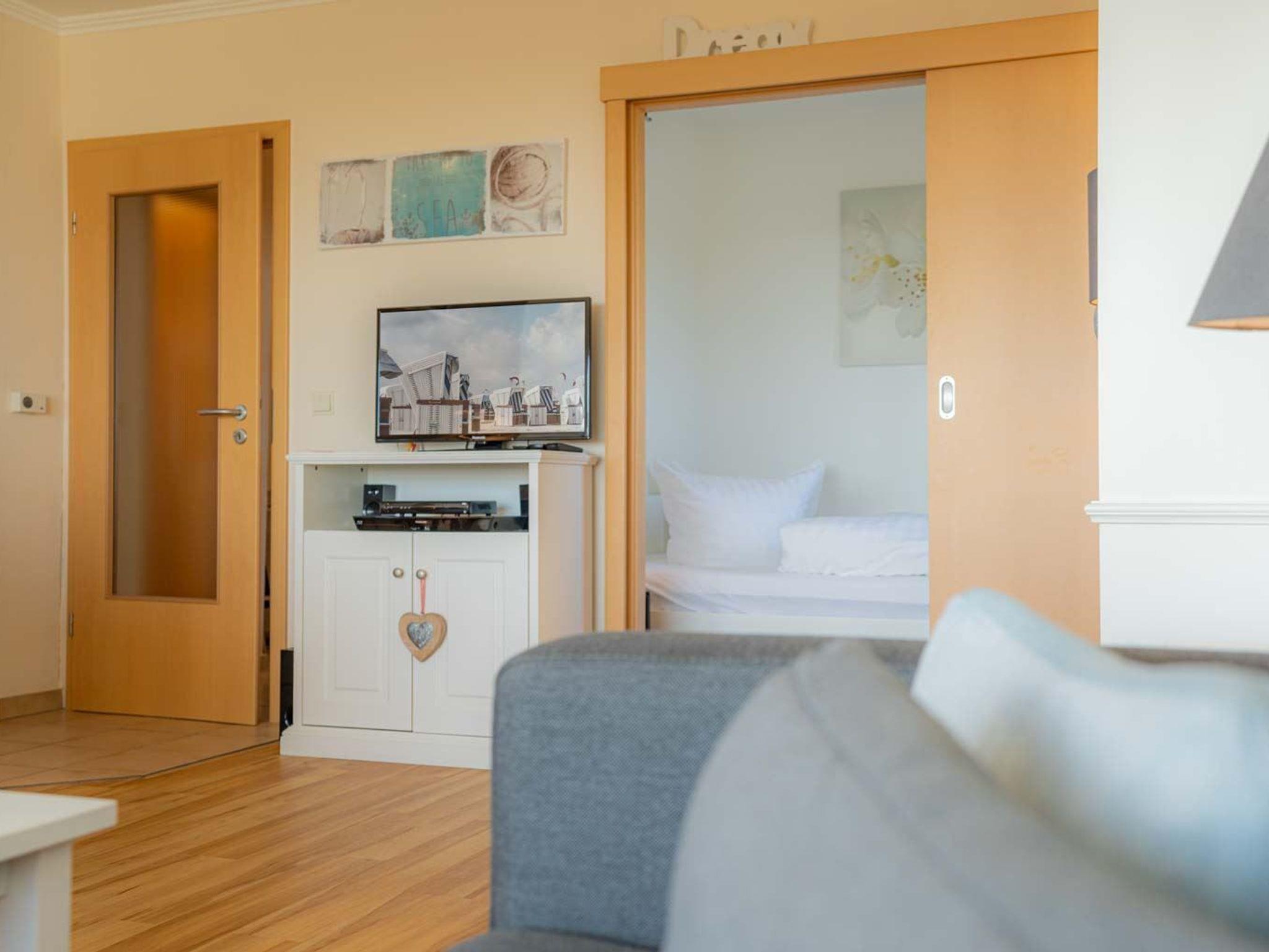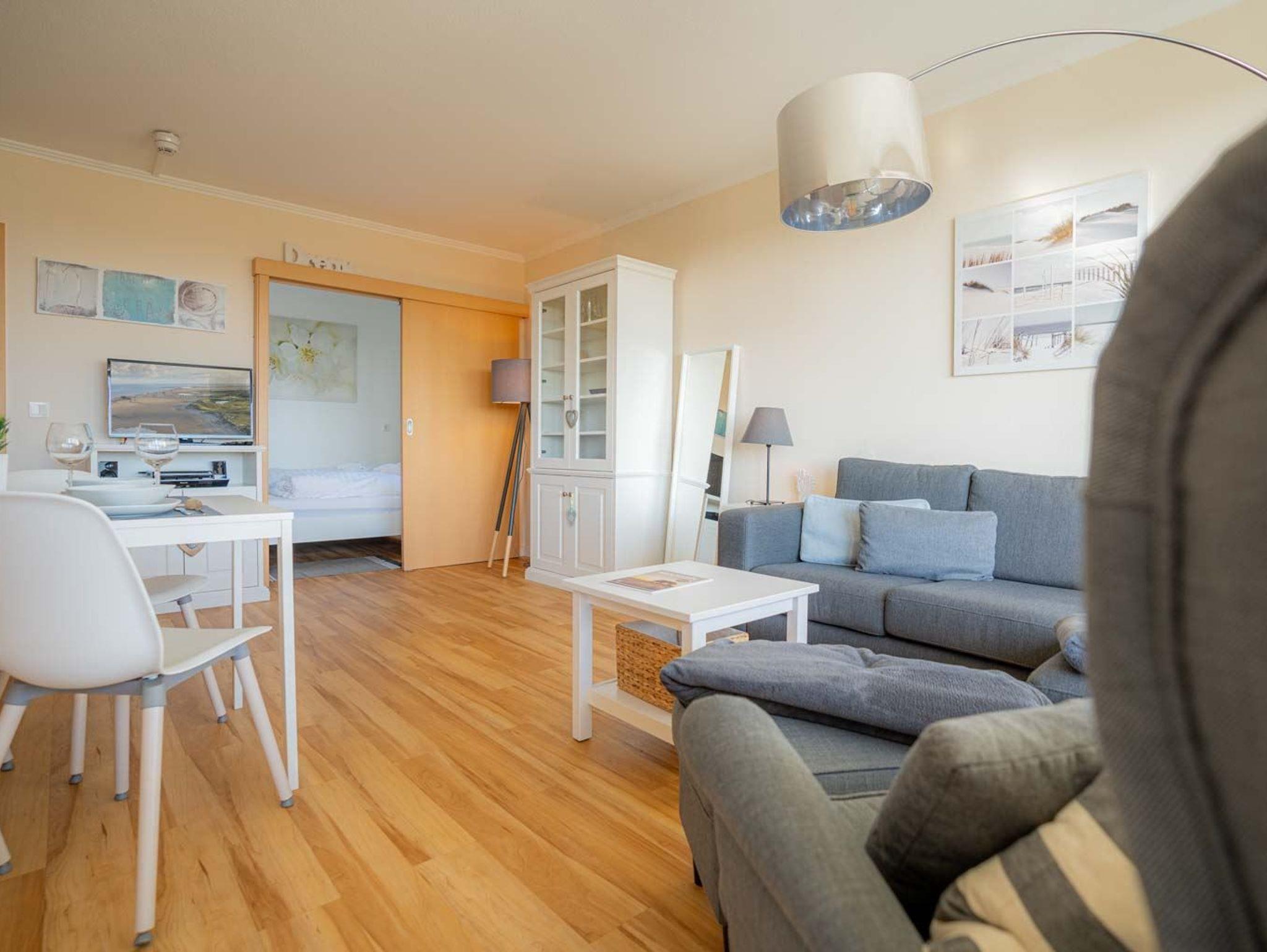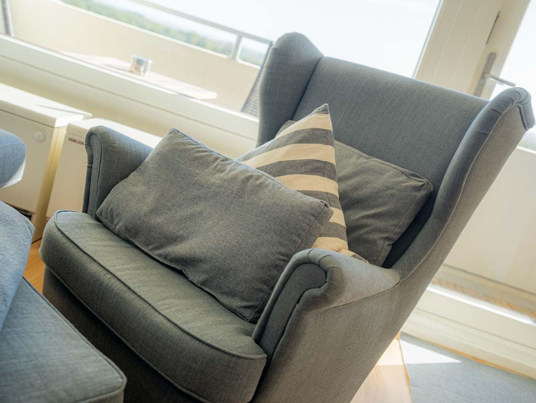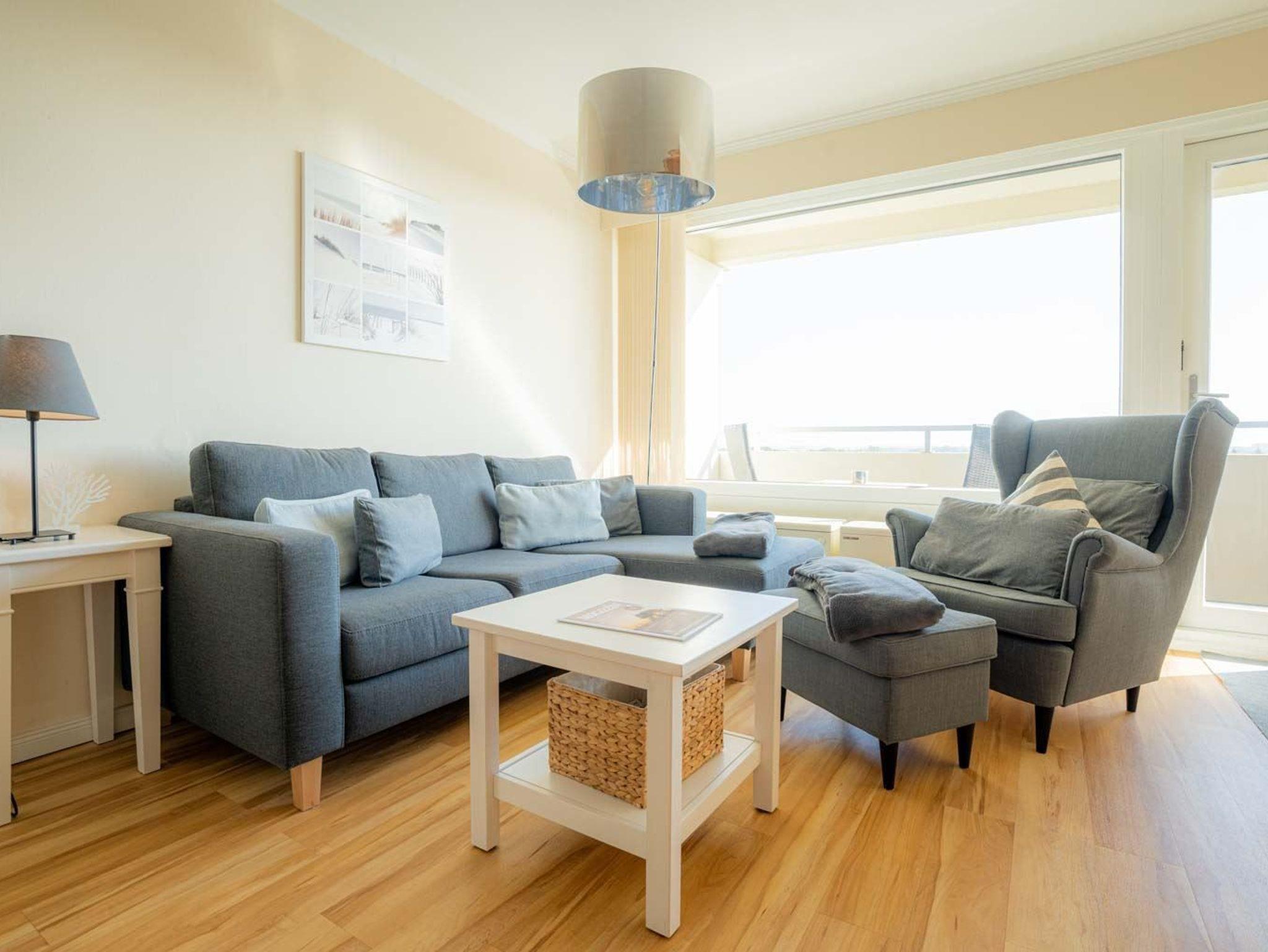 Wohnzimmer mit Sofa (2er), Entspannungssessel, TV (Sat), BluRay-Player mit Subwoofer und Esstisch mit 4 Stühlen. Direkter Zugang zum möblierten Balkon nach Südosten mit herrlichem Ausblick über die Dünen, den Deich bis zum Böhler Leuchtturm und über das Meer. Moderne offene Küche mit Backofen, Kühlschrank mit Gefrierfach, Geschirrspüler und viel Komfort.