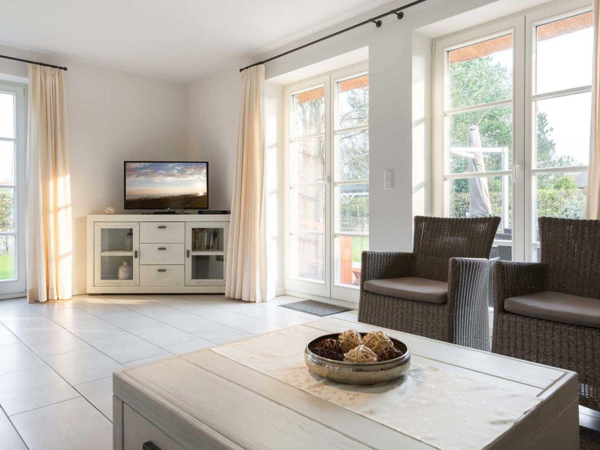 Wohnzimmer mit Sofa (2-3 Personen), 2 Korbsesseln, Kaminofen, TV (Kabel), BluRay-Player, Esstisch mit 5 Stühlen und zwei Austritten in den Garten. Direkter Zugang zur möblierten Südterrasse mit Strandkorb. Offene Küche mit Backofen, Mikrowelle, Geschirrspüler und Kühl-Gefrier-Kombination.