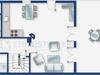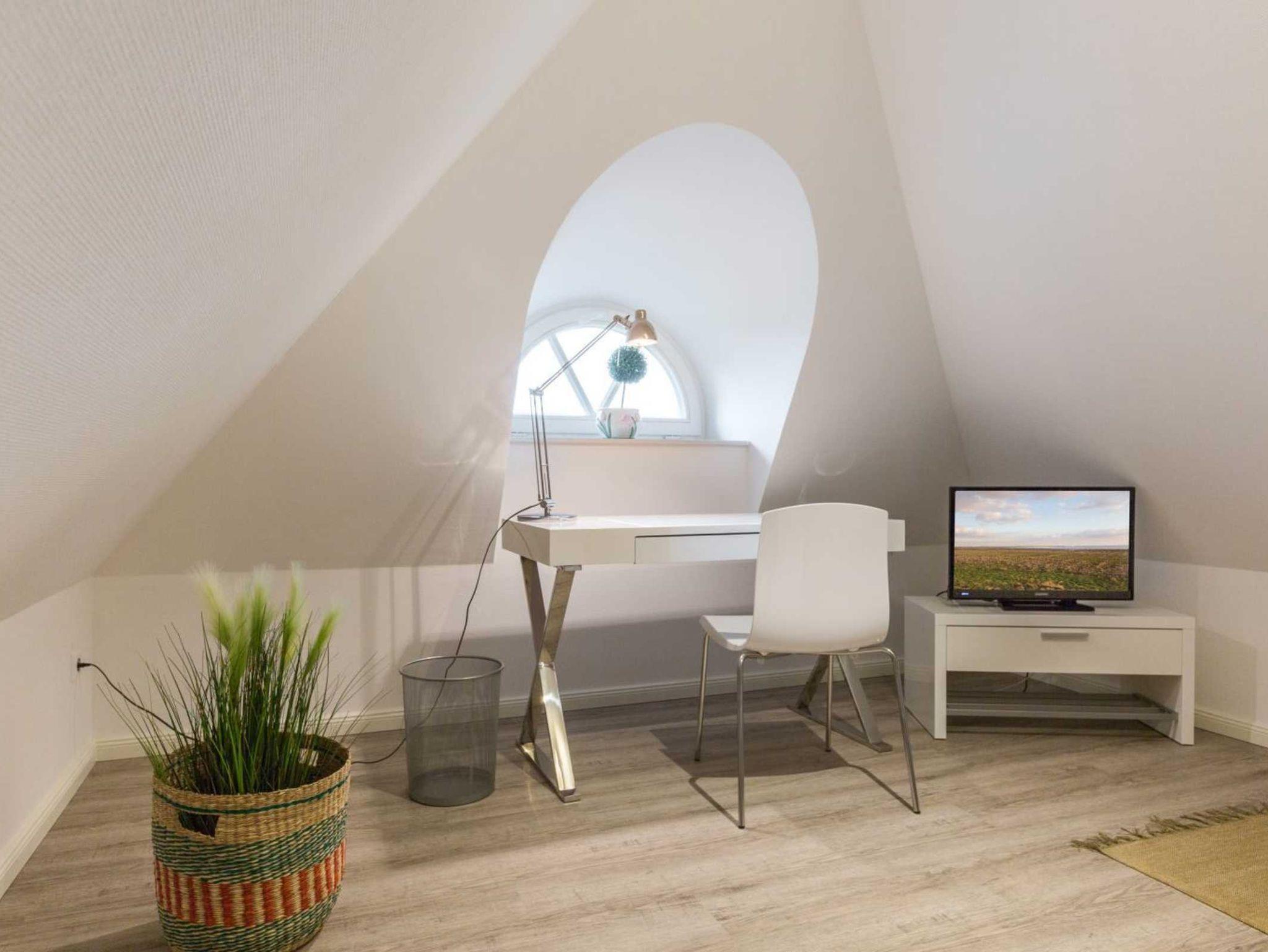 Arbeitszimmer mit Schreibtisch, Stuhl, TV und ausziehbarem Schlafsessel (für Jugendliche).