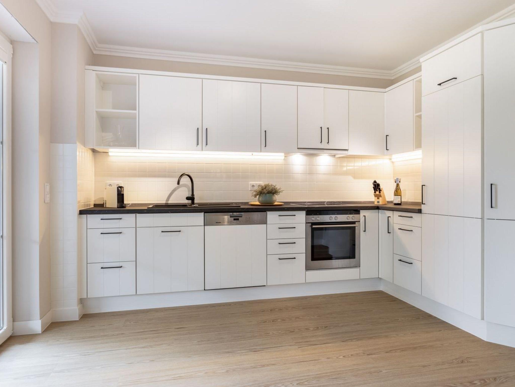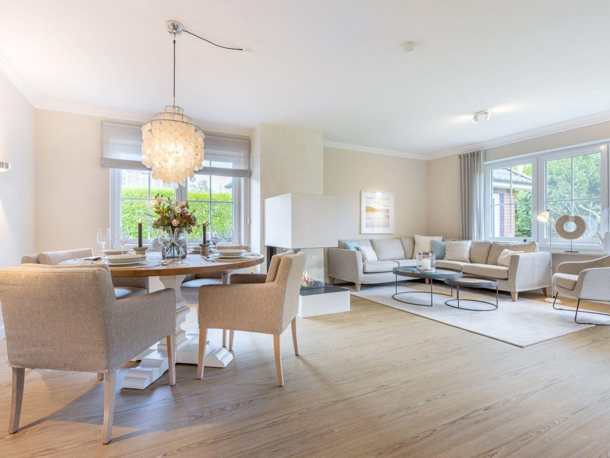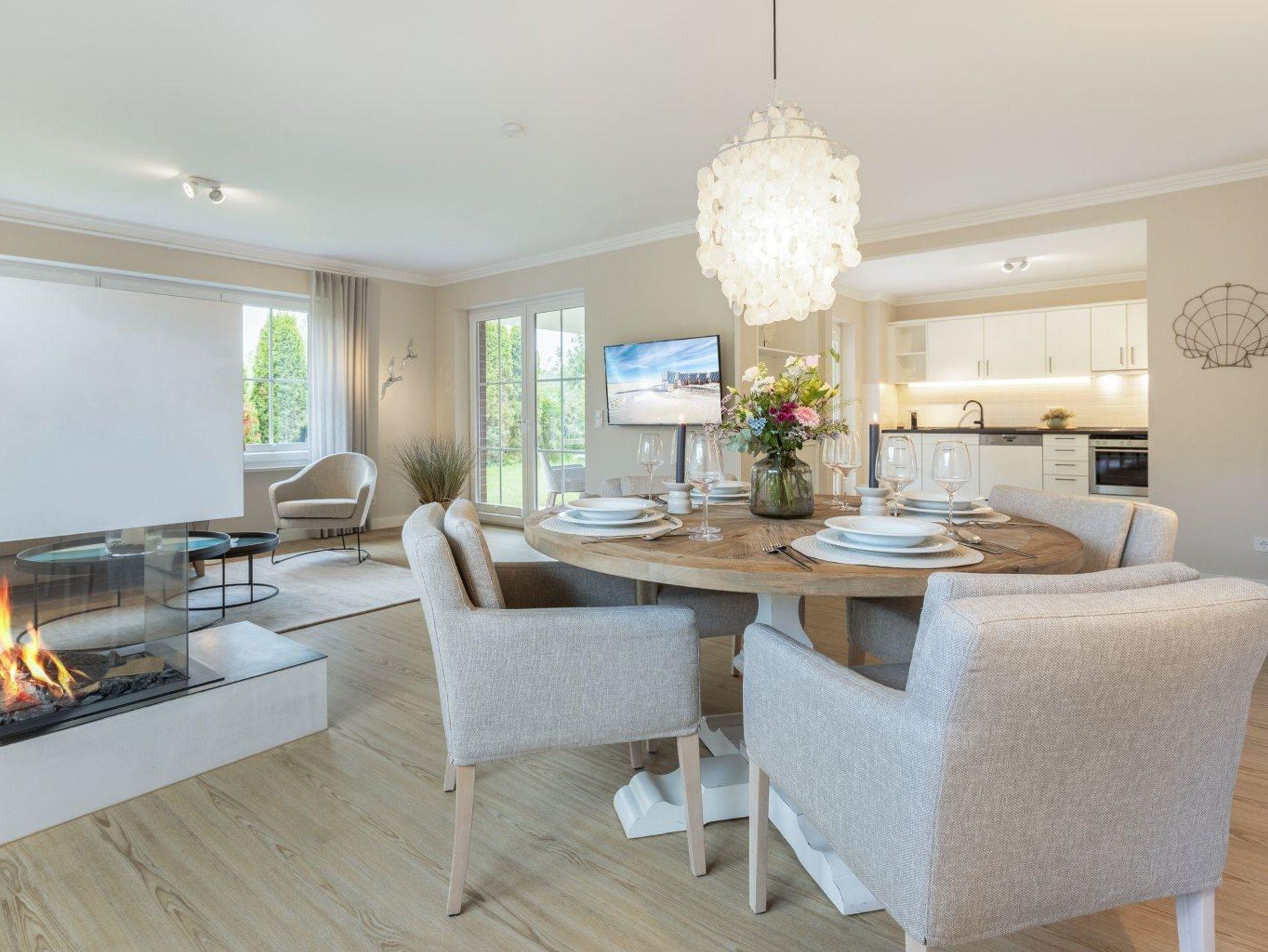 Wohnzimmer mit großem Ecksofa, einem Sessel, gemütlichem Kalfire-Kamin, einem großen SMART-TV (55 Zoll, Sat), einem Esstisch für 4 Personen und direktem Zugang zur möblierten, überdachten Gartenterrasse nach Süden mit Strandkorb. Halboffene Küche mit Backofen, Geschirrspüler, Kühlschrank mit Gefrierfach und Krups Nespresso Kapsel-Kaffeemaschine.