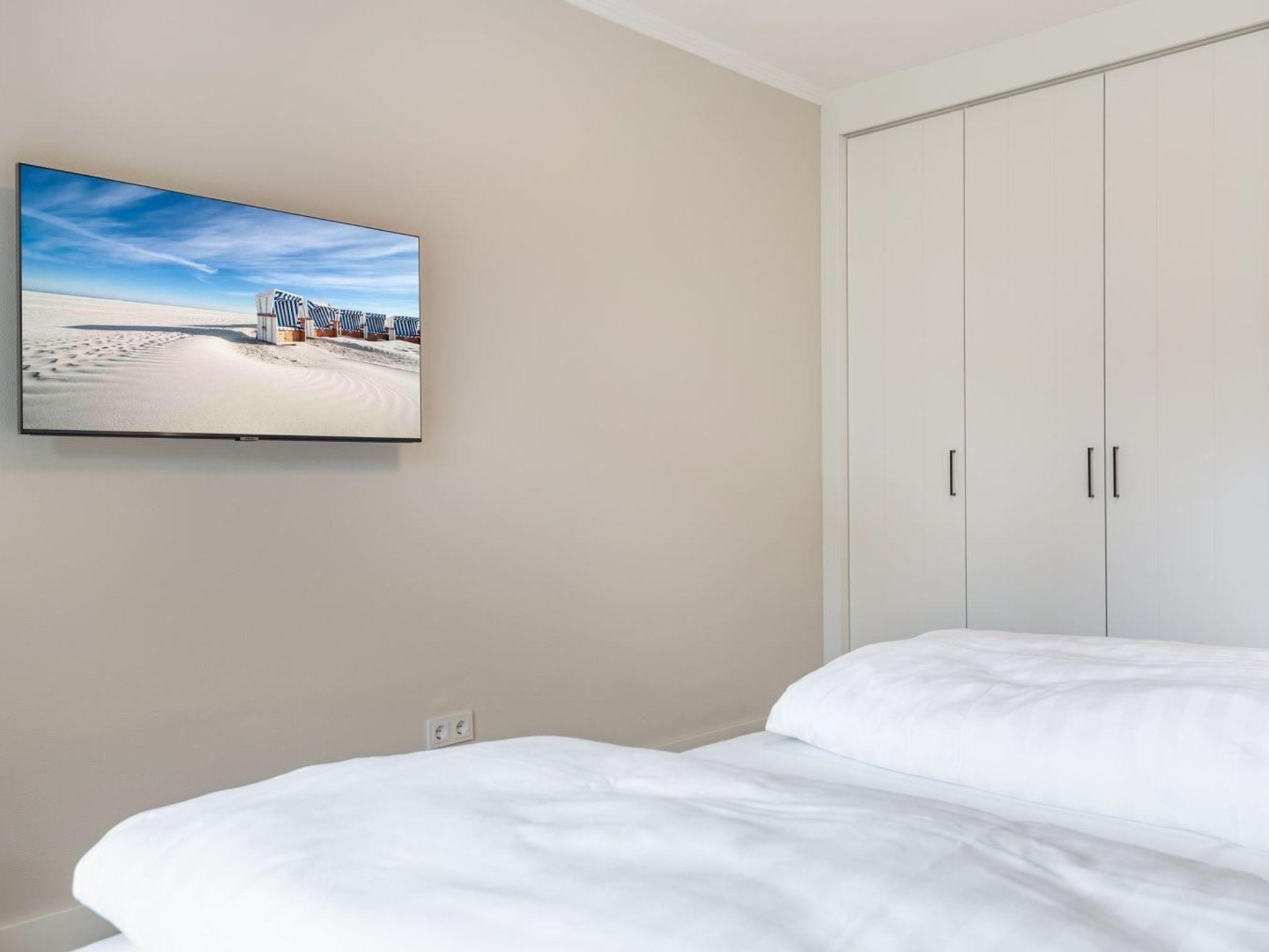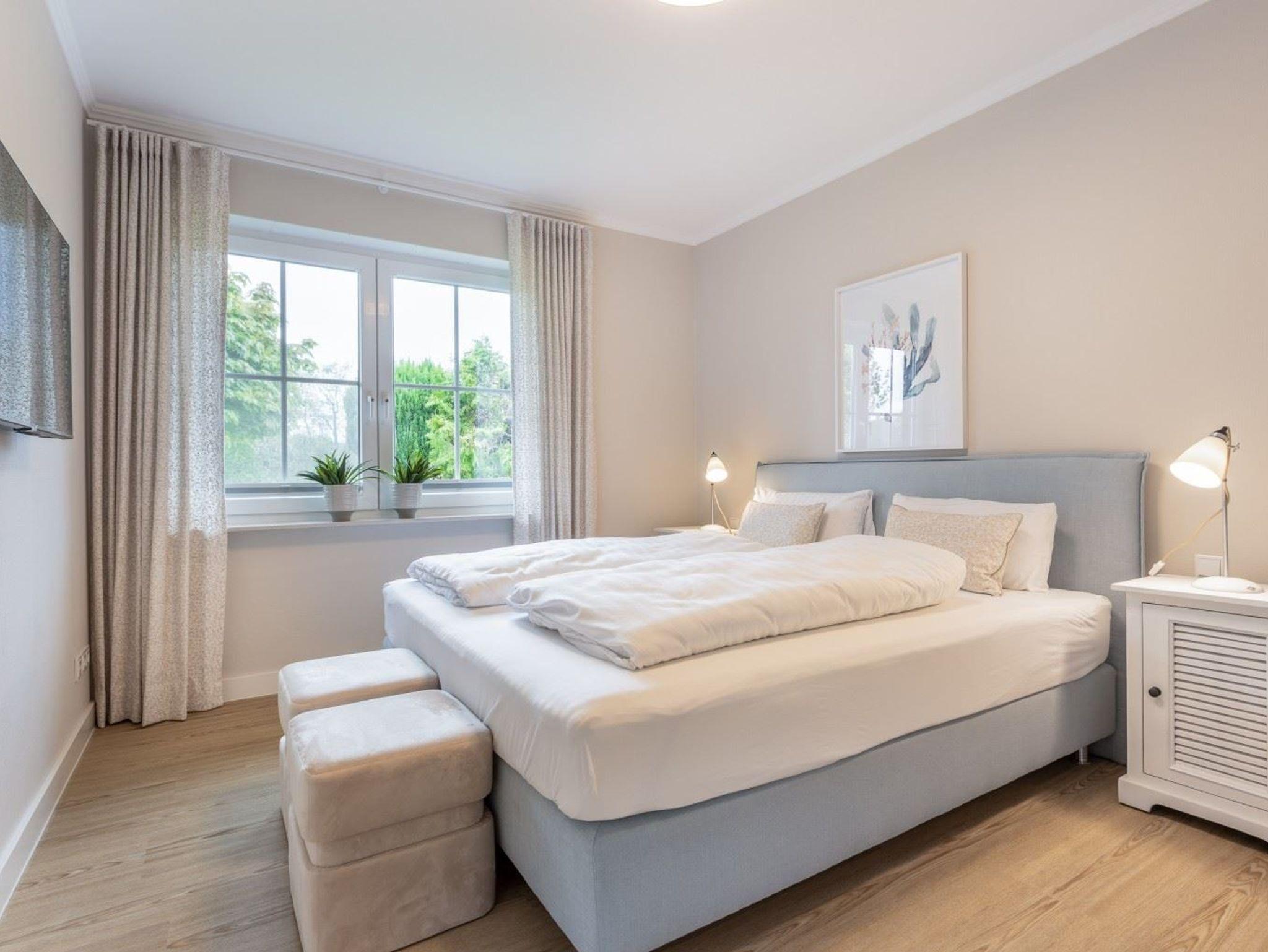 2. Schlafzimmer mit Doppelbett (2x 90x200cm, Boxspring), SMART-TV (43 Zoll, Sat), zwei Hockern und Kleiderschrank. Die Fenster können verdunkelt werden und haben Fliegengitter.