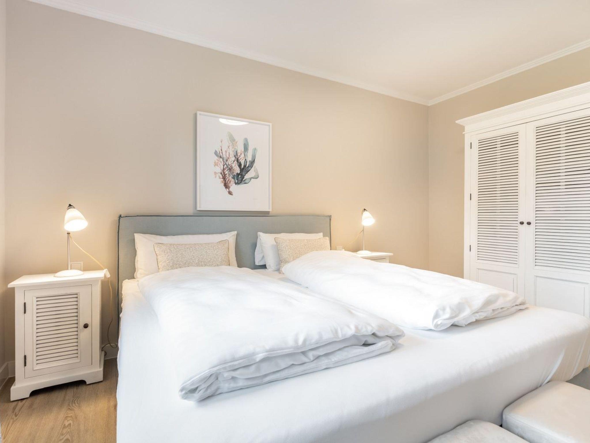 1. Schlafzimmer mit Doppelbett (2x 90x200cm, Boxspring), SMART-TV (43 Zoll, Sat), Sessel und Einbauschrank. Die Fenster können verdunkelt werden und Sie haben direkten Zugang zur Gartenterrasse.
