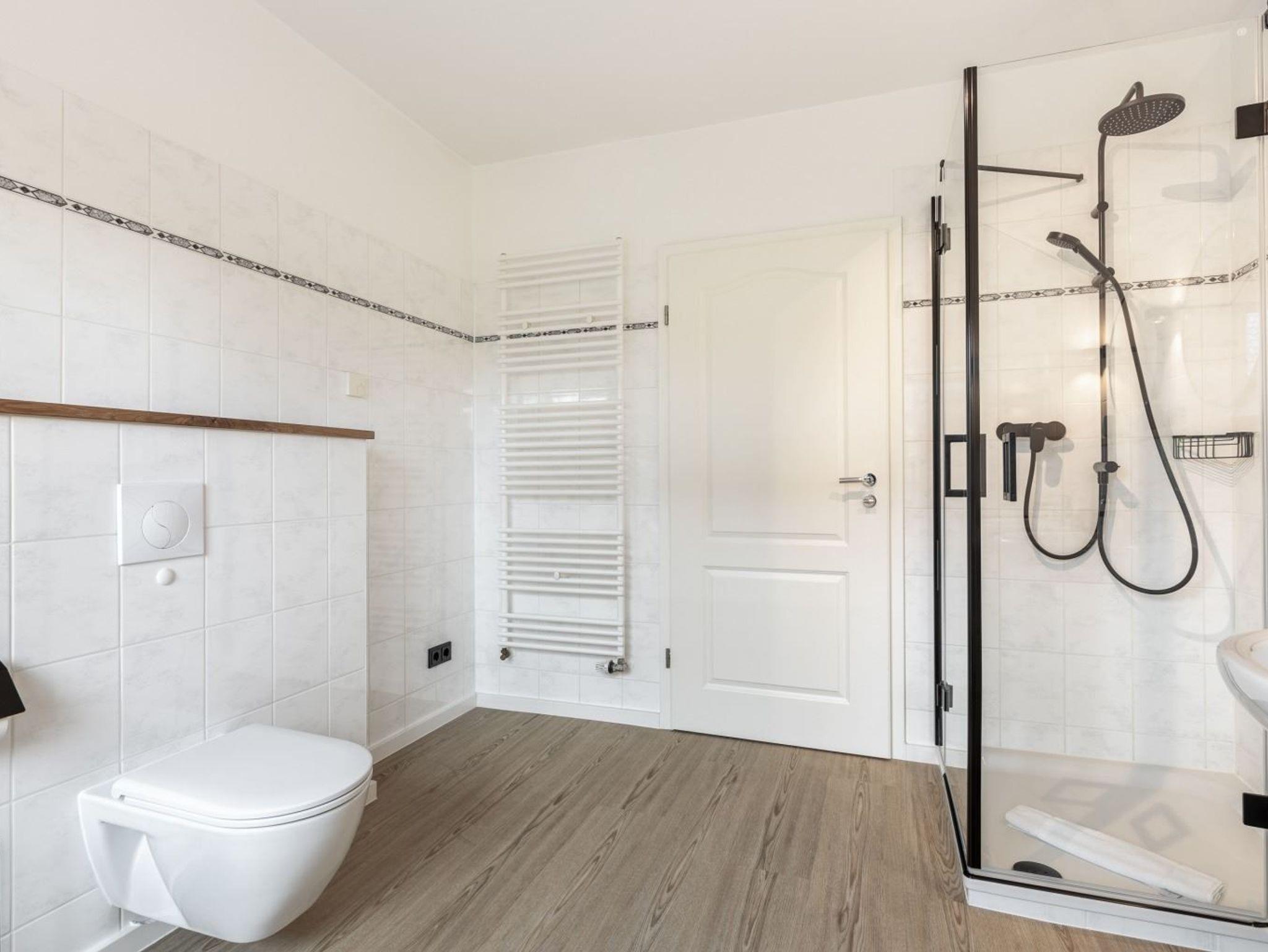 Badezimmer (Duschbad) mit Regen-Dusche, zwei Waschbecken, WC, Bidet, Handtuchwärmer, Tageslicht, Föhn und Fliegengitter.