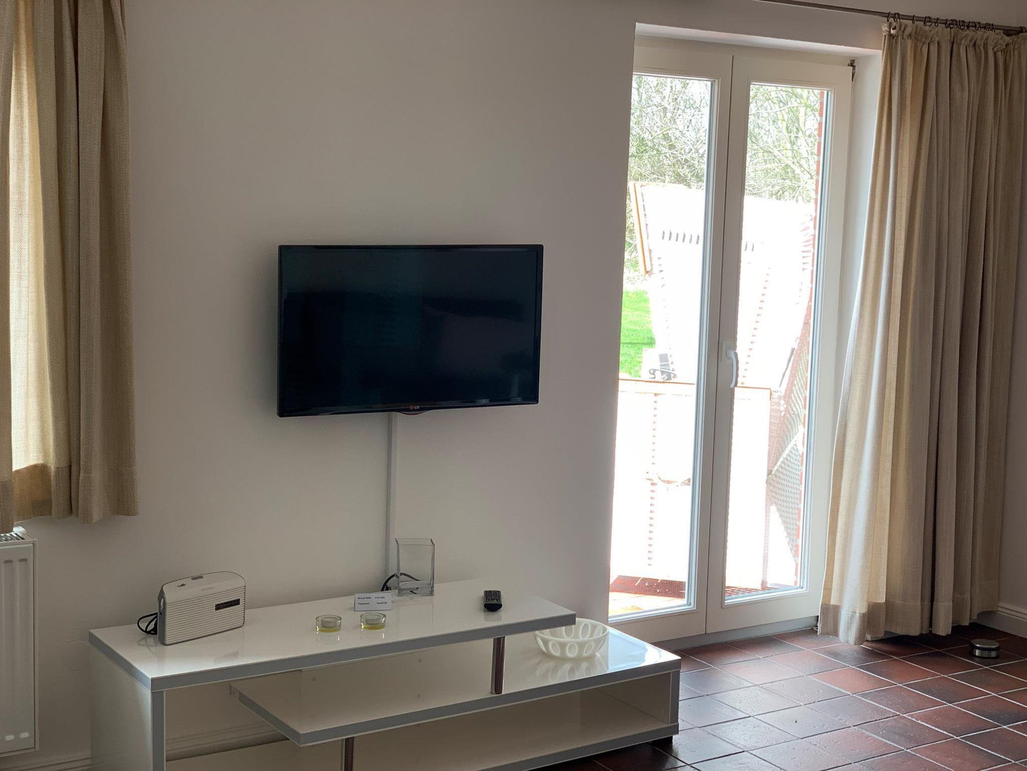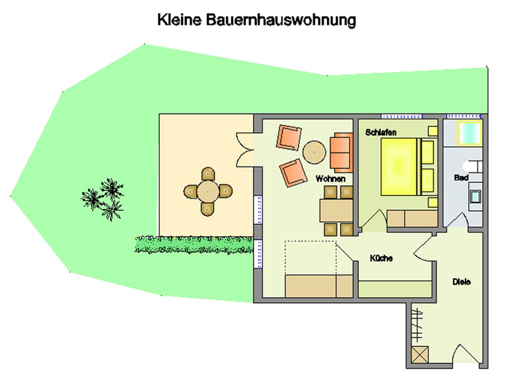 Modernisierte und renovierte Ferienwohnung unter Reet, im Schlafraum ist noch der alte Holzfußboden erhalten, der restliche Bereich wurde gefliest, sichtbare Deckenbalken und Füllungstüren geben der Wohnung den besonderen Charme. Vom Wohnraum haben Sie einen direkten Zugang auf eine große Westterrasse mit einem tollen Blick auf eine 4000qm große Obstwiese. Eingangsbereich mit Garderobe, Duschbad mit WC, 1 Schlafzimmer mit Doppelbett, großzügiger Wohn-Essbereich,Einzelschrankbett, direkter Zugang zur Terrasse, separate, komplett eingerichtete Küche.