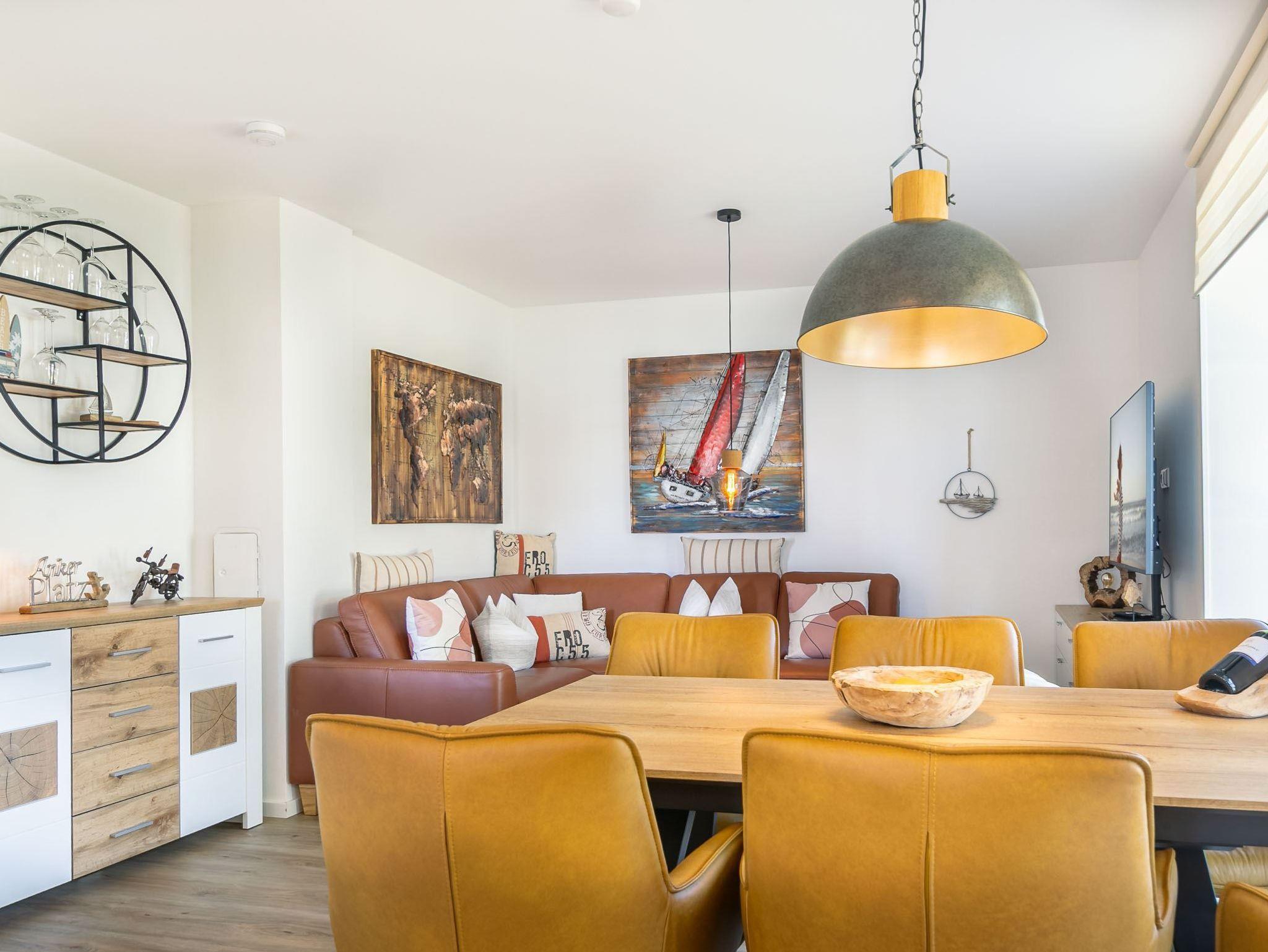 Wohnzimmer mit Lederecksofa, großem SMART-TV (Waipu), Esstisch mit 6 Stühlen und Austritt auf die West-Terrasse.