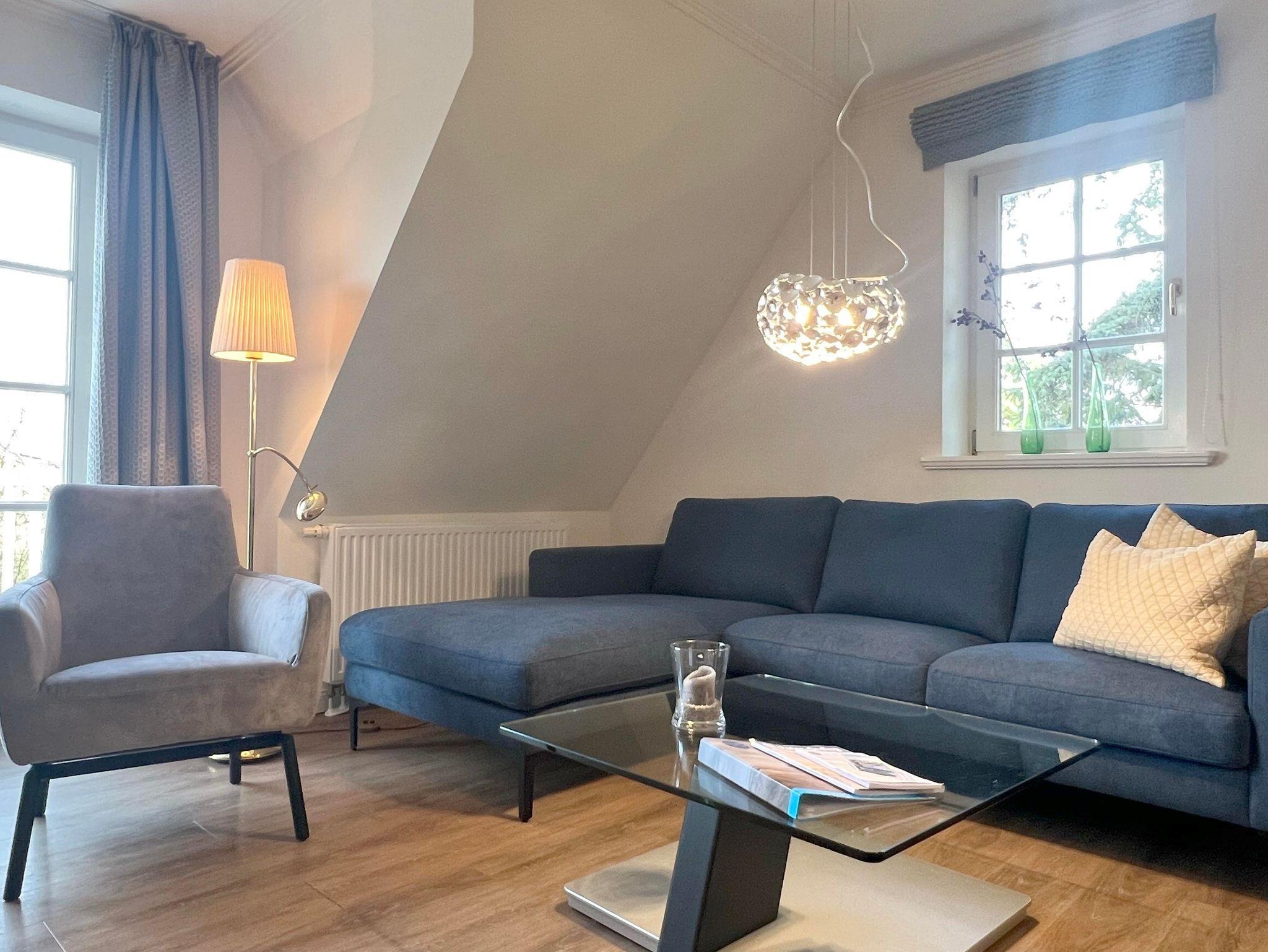 Eingangsbereich, Eingangsdiele mit Garderobe, großzügiger Wohn-Essbereich mit direktem Zugang auf einen Balkon mit Gartenmöbeln, zusätzlich im Dünengelände eine große, durch Friesenwälle und Gehölze abgeschirmte Terrasse mit Gartenmöbeln und einem Strandkorb. Zwei Schlafzimmer mit Doppelbetten, zwei Duschbäder/WC. Separate Küche. Im Untergeschoss befindet sich eine Gemeinschaftssauna (Ruheraum, verschiedene Duschen, Fußbäder), Fitnessraum, Tischtennis. Im Außenbereich: ein Spielplatz für die Kleinsten, Stellplatz, Fahrradständer.