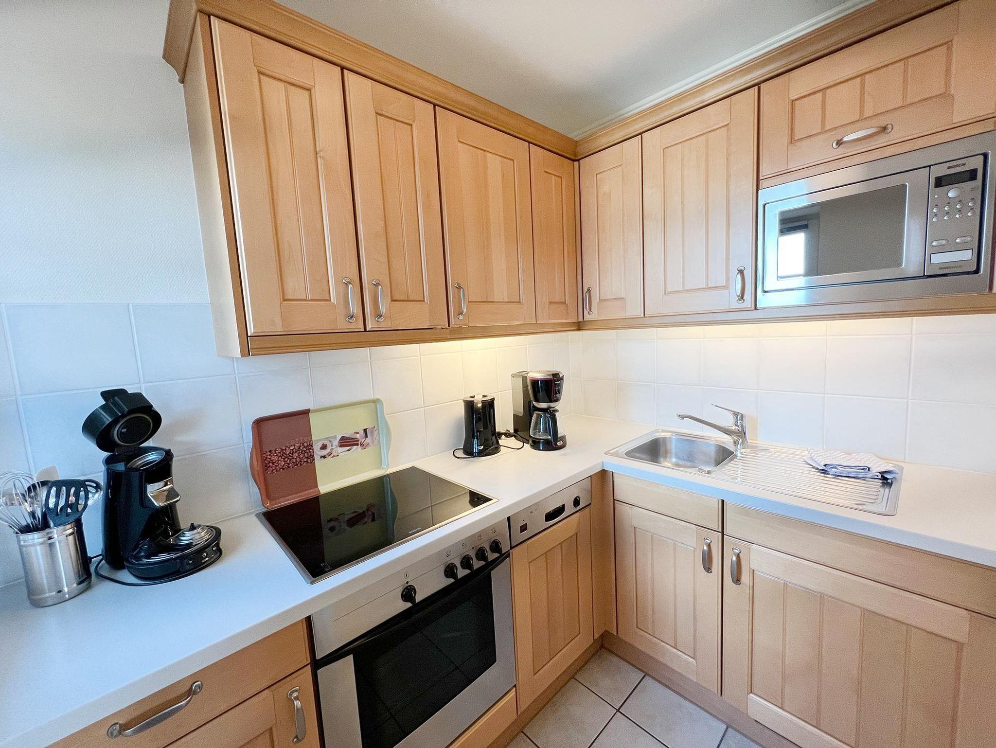 komplett eingerichtete Küche mit Ceranfeld, Mikrowelle, Backofen, Geschirrspüler, Kühlschrank mit Gefrierfach, Wasserkocher, Kaffeemaschine (Filter), Kaffeepadmaschine, Toaster.