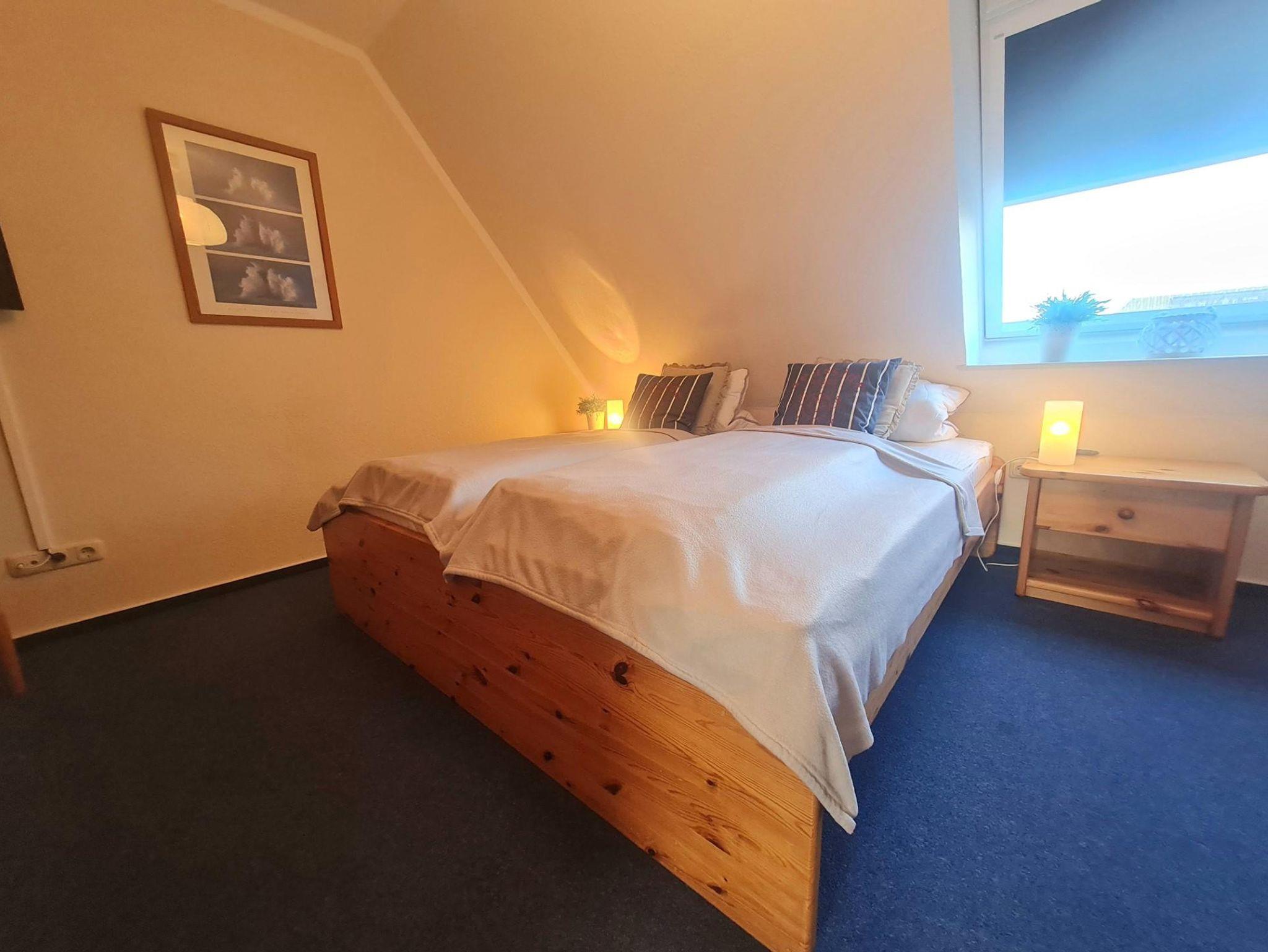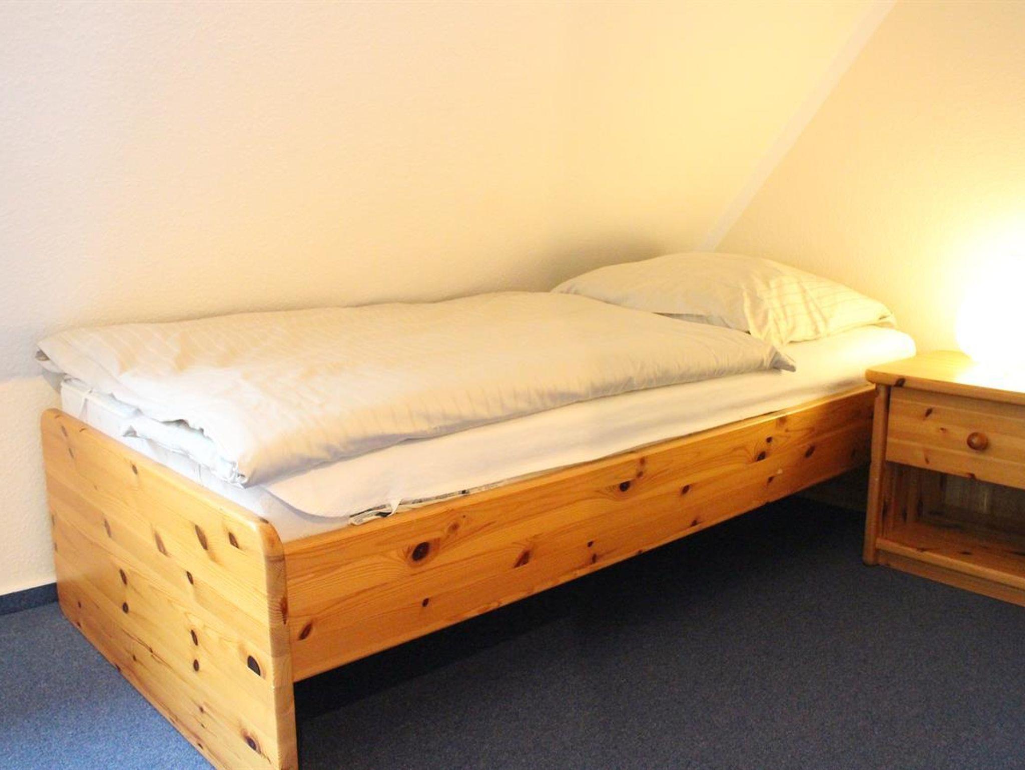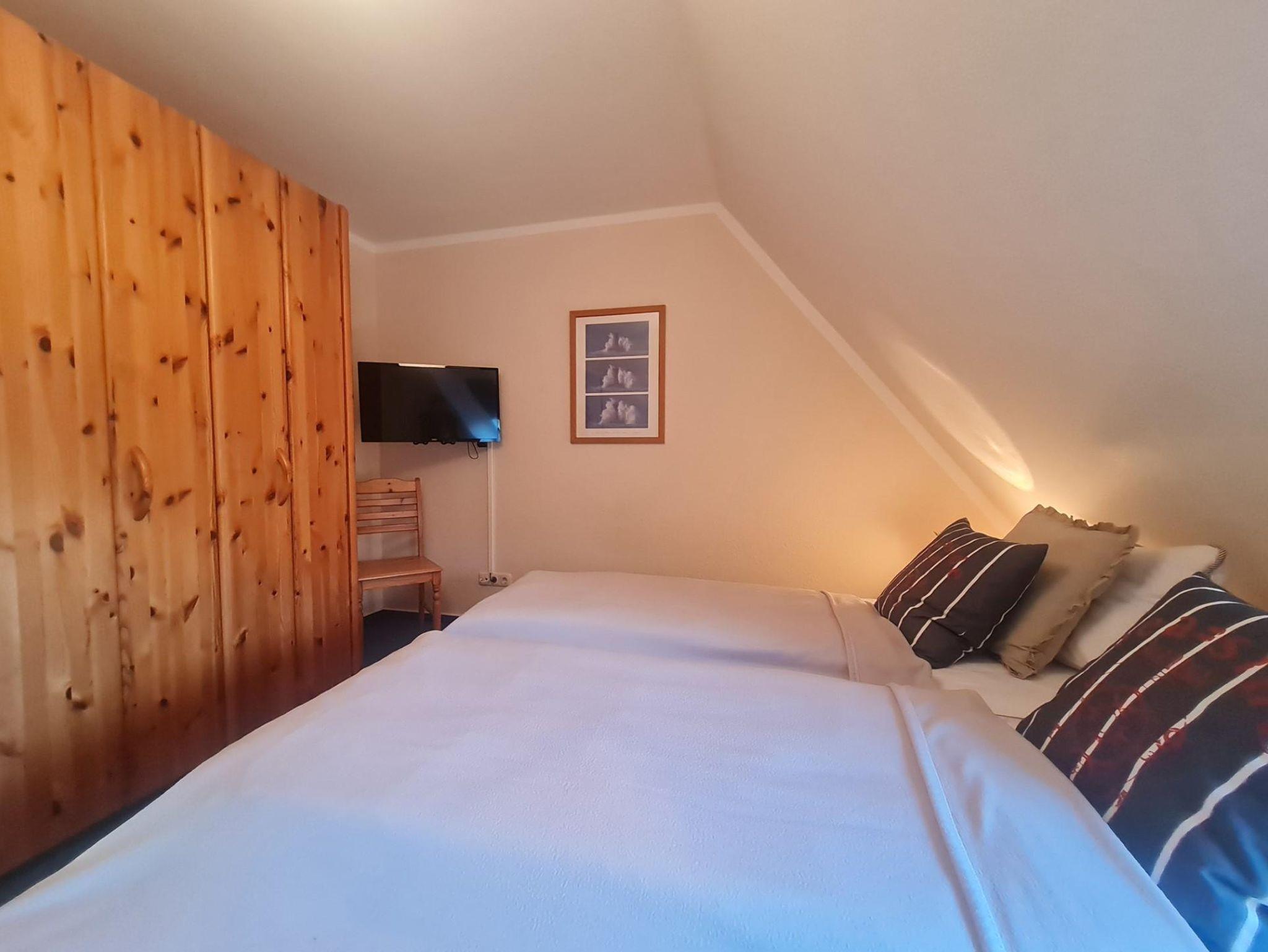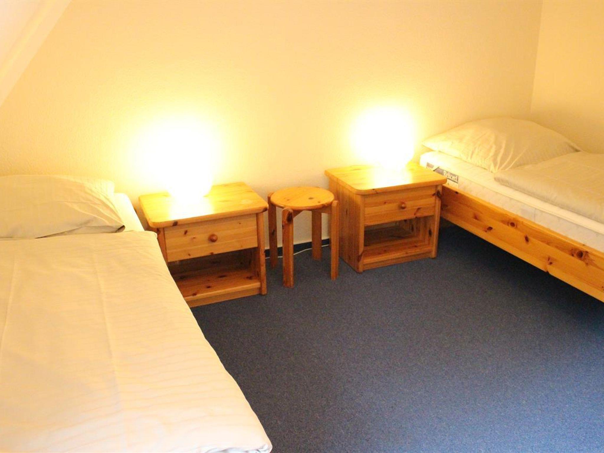 Im Obergeschoss befinden sich zwei Schlafräume, die komfortabel eingerichtet sind: eines mit einem Doppelbett und das andere mit zwei Einzelbetten. Beide Schlafräume verfügen zusätzlich über eigene Fernseher, sodass auch hier für Unterhaltung gesorgt ist. Ihr Ferienzuhause bietet somit den idealen Rückzugsort für erholsame Tage.