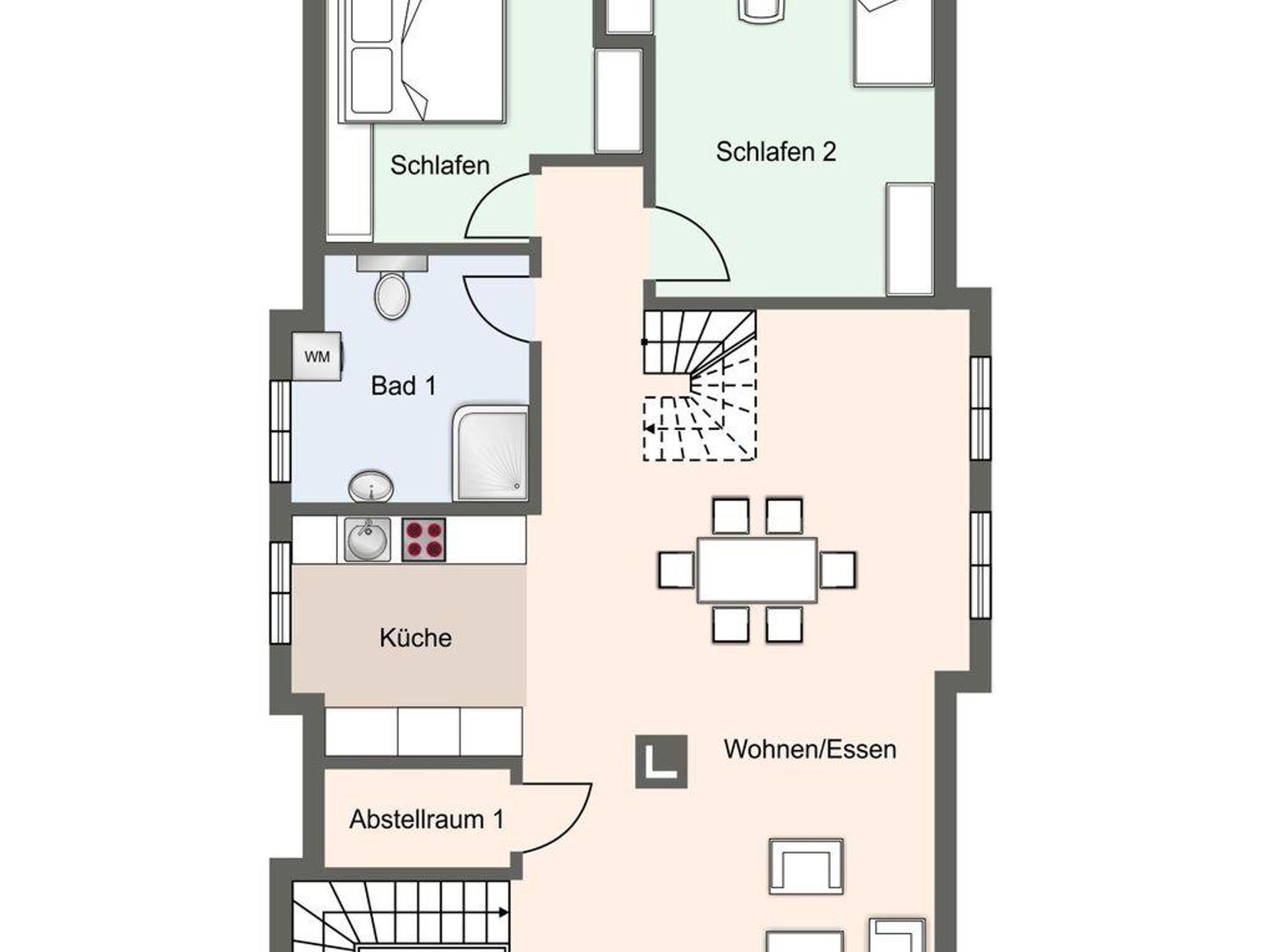Der offene Wohn- und Essbereich ist mit Kaminofen, gemütlicher Sofaecke, Ambilight-TV und BOSE-Soundsystem ausgestattet. Die voll ausgestattete Küche bietet alles für entspannte Kochabende. Vom Wohnbereich gelangen Sie direkt auf den großen Balkon mit Blick ins Grüne. Über eine Außentreppe erreichen Sie zusätzlich einen eigenen Gartenanteil.