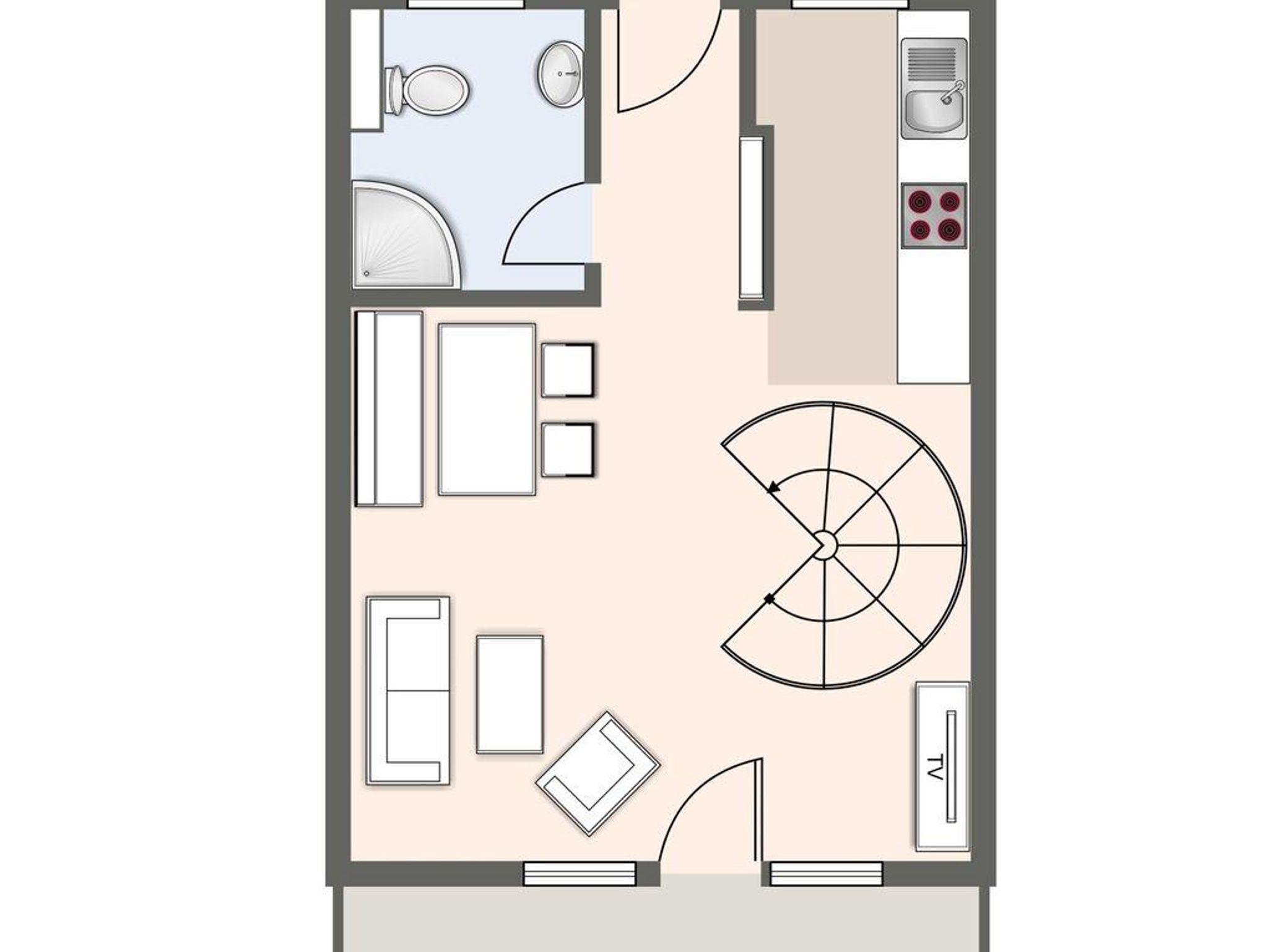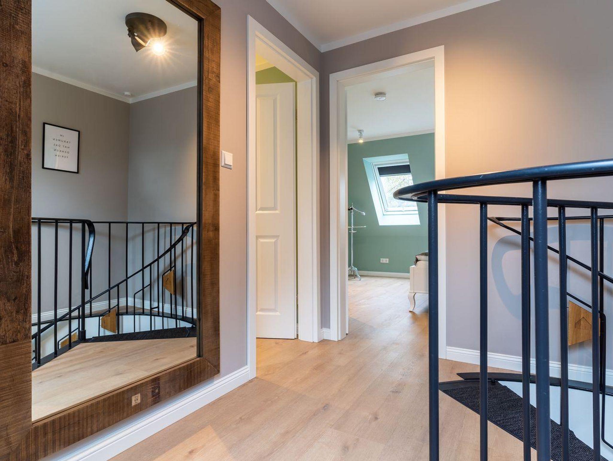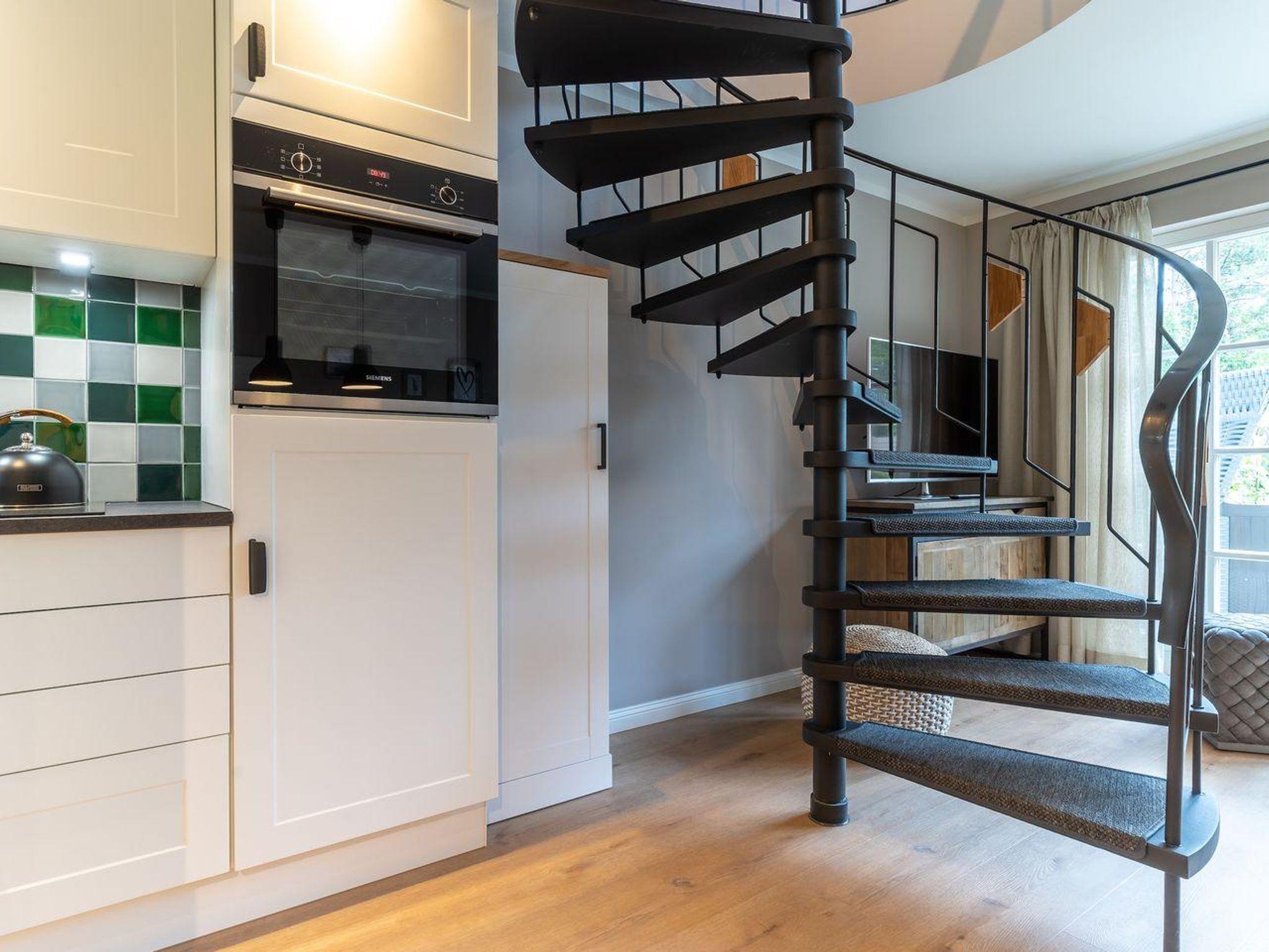 Über eine Wendeltreppe aus dem Wohnraum gelangt man in das Obergeschoss. Hier befinden sich zwei gemütliche Schlafzimmer, eines mit einem Doppelbett und eines mit einem Etagenbett.