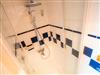 Badezimmer (Duschbad) mit Dusche, Föhn und Tageslicht. Separates WC mit Waschbecken.