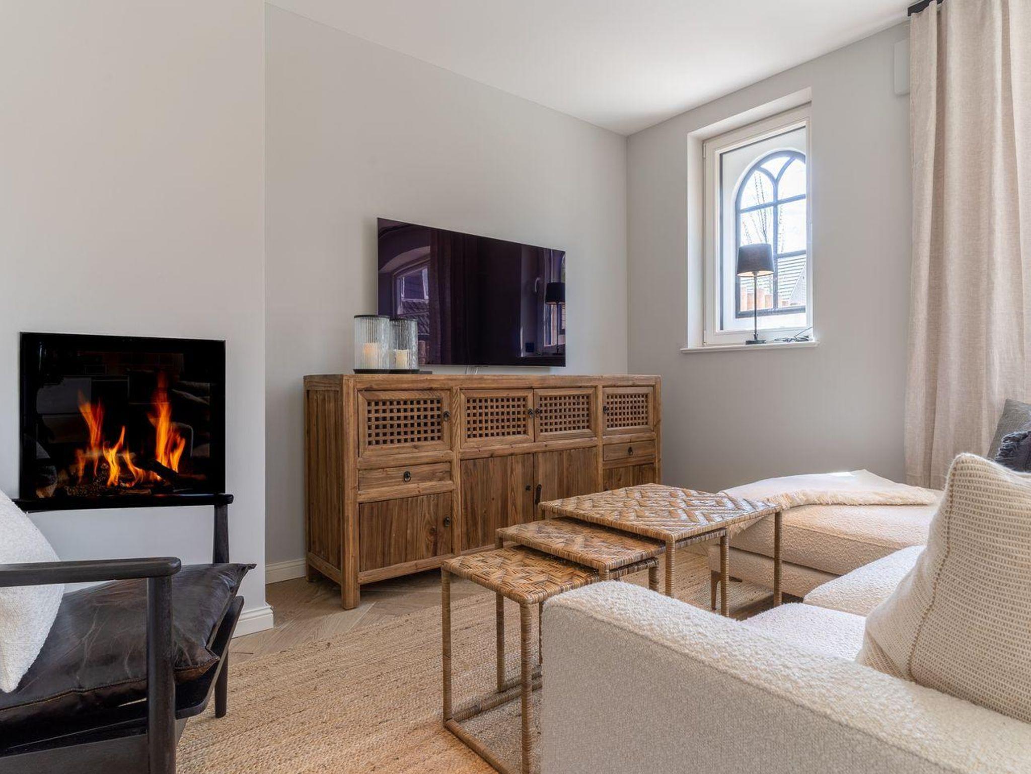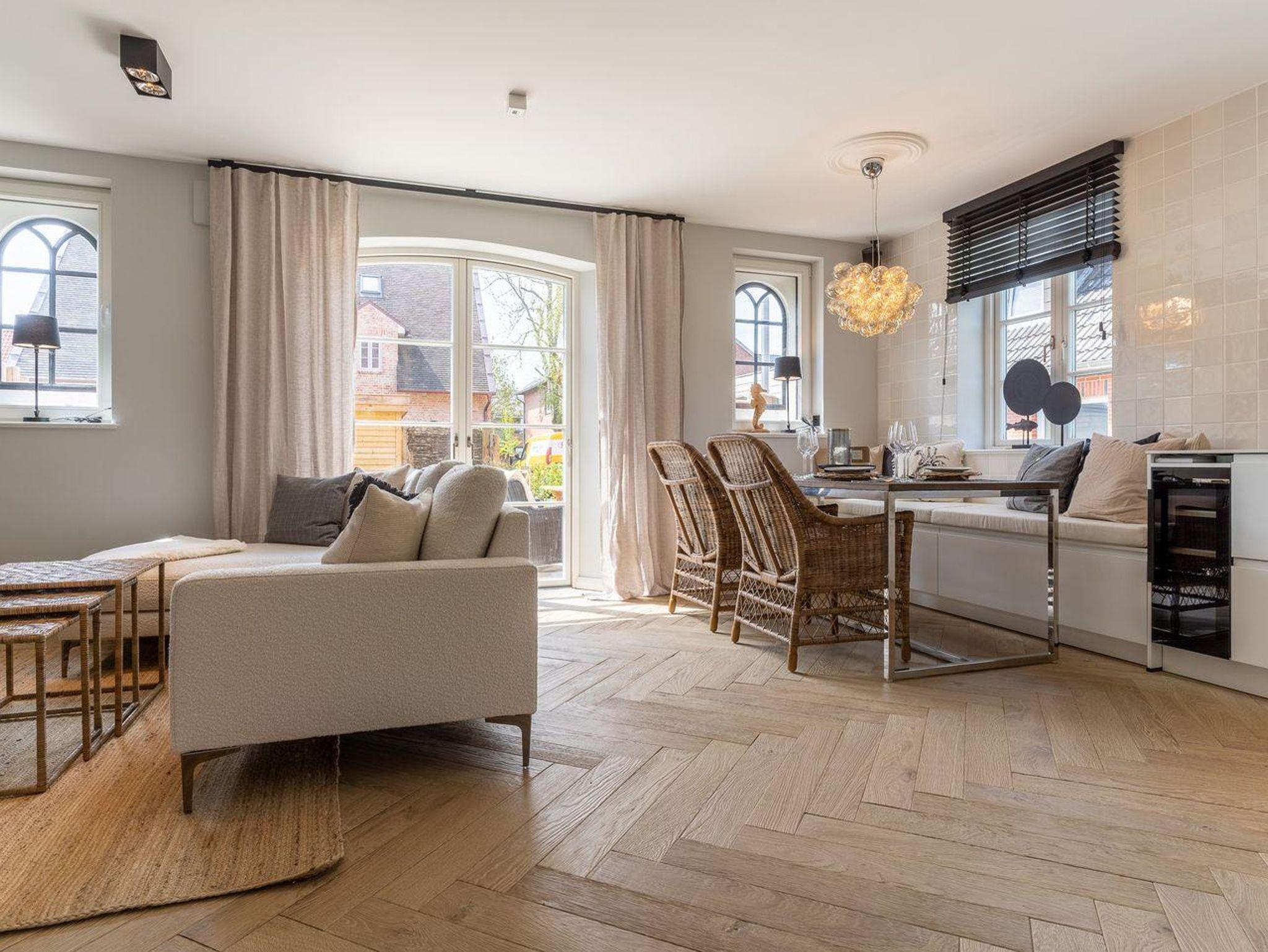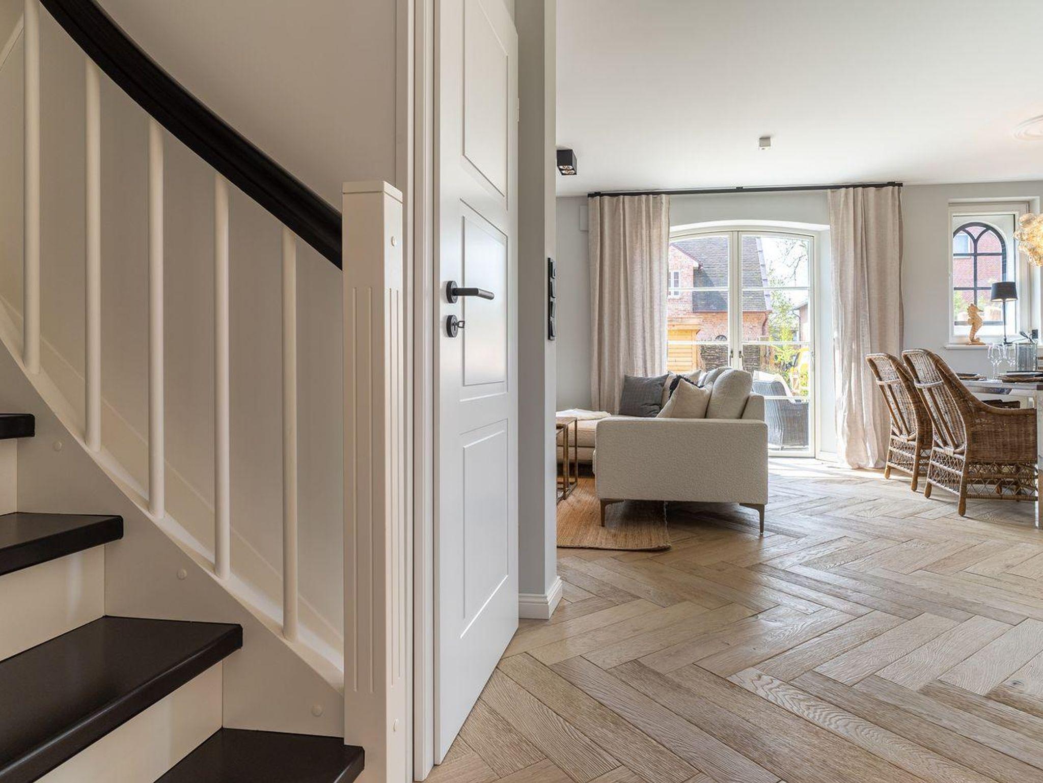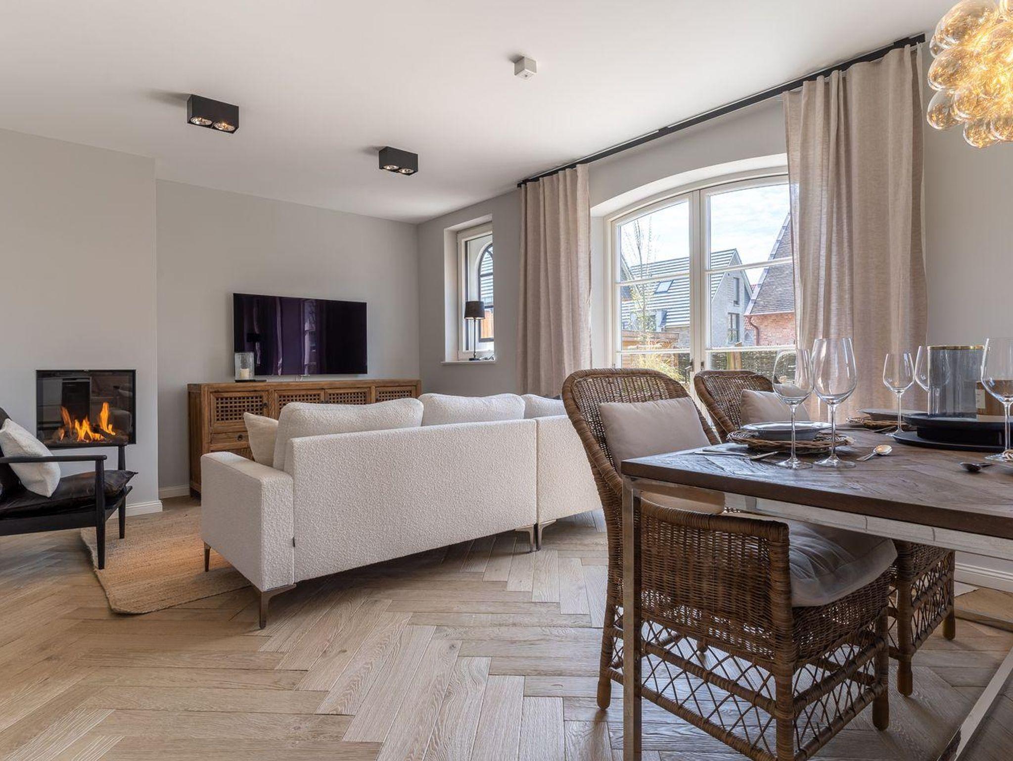 Die stilvolle und ganz besonders eingerichtete Doppelhaushälfte verfügt über ca. 90 m² Wohnfläche über 3 Etagen und bietet Platz für 1-4 Personen. Im Erdgeschoss befindet sich ein großer, lichtdurchfluteter Wohnraum mit gemütlichem Essbereich, einer offenen Küche und Gaskamin. Die Küche verfügt über hochwertige Elektrogeräte, einen Weinkühlschrank und bietet genügend Platz zum gemeinsamen Kochen. An den Wohnbereich schließen sich ein Flur, ein Gäste WC sowie ein Abstellraum an. Über eine Holztreppe gelangt man in das Obergeschoss. Zwei Schlafzimmer mit je einem Boxspring-Doppelbett (180x200 m) sind ausgestattet mit großen Kleiderschränken. Ein traumhaftes, vollausgestattetes Badezimmer im OG, mit einer Dusche, einer freistehenden Badewanne und einer Sauna runden das hochwertige Hauskonzept ab und lassen keine Wünsche offen. Über eine weitere Holztreppe geht es vom Flur ins Dachgeschoss. Hier finden Sie ein weiteres Zimmer mit einem ruhigem Arbeitsbereich und zwei gemütlichen Loungeliegen.