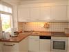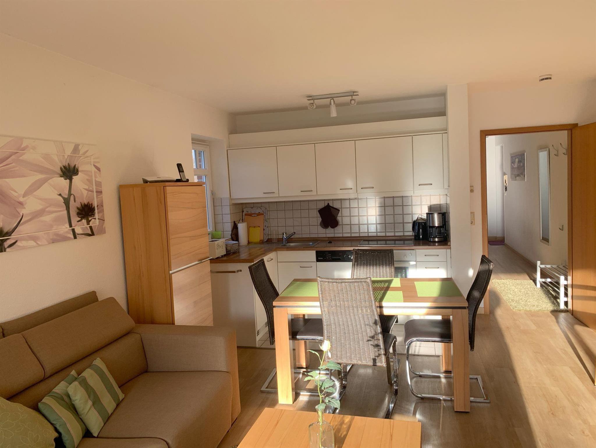 Wohnzimmer Couch, Couchtisch, Sessel, Stehlampe, 2 Vitrinenschränke, TV-Anrichte, Kabel-TV, Flachbildschirm, Stereoanlage mit CD-Player, Esstisch, 4 Stühle, Einbauküche, 4 Plattenherd mit Ceranfeld und Backofen, Dunstabzugshaube, Kühlschrank, Spülmaschine, Kaffeemaschine, Wasserkocher, Toaster, Handmixer, Geschirr, Kochtöpfe, Elektro-Direktheizung