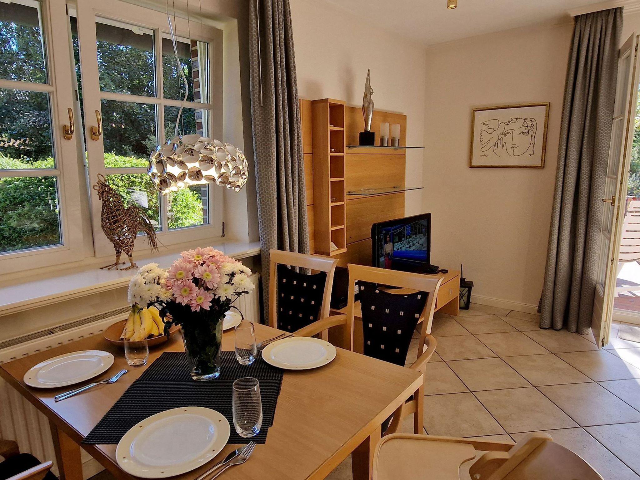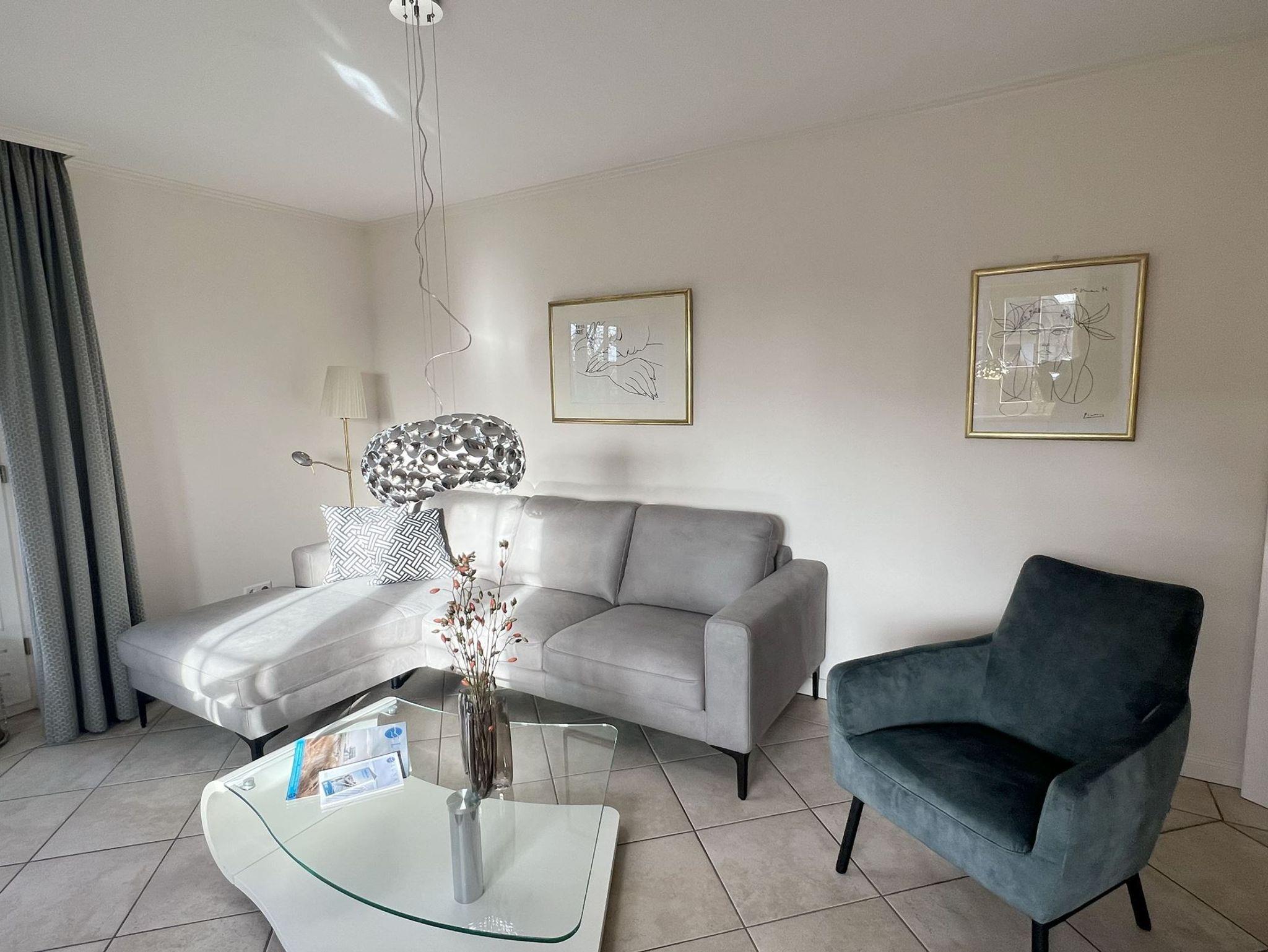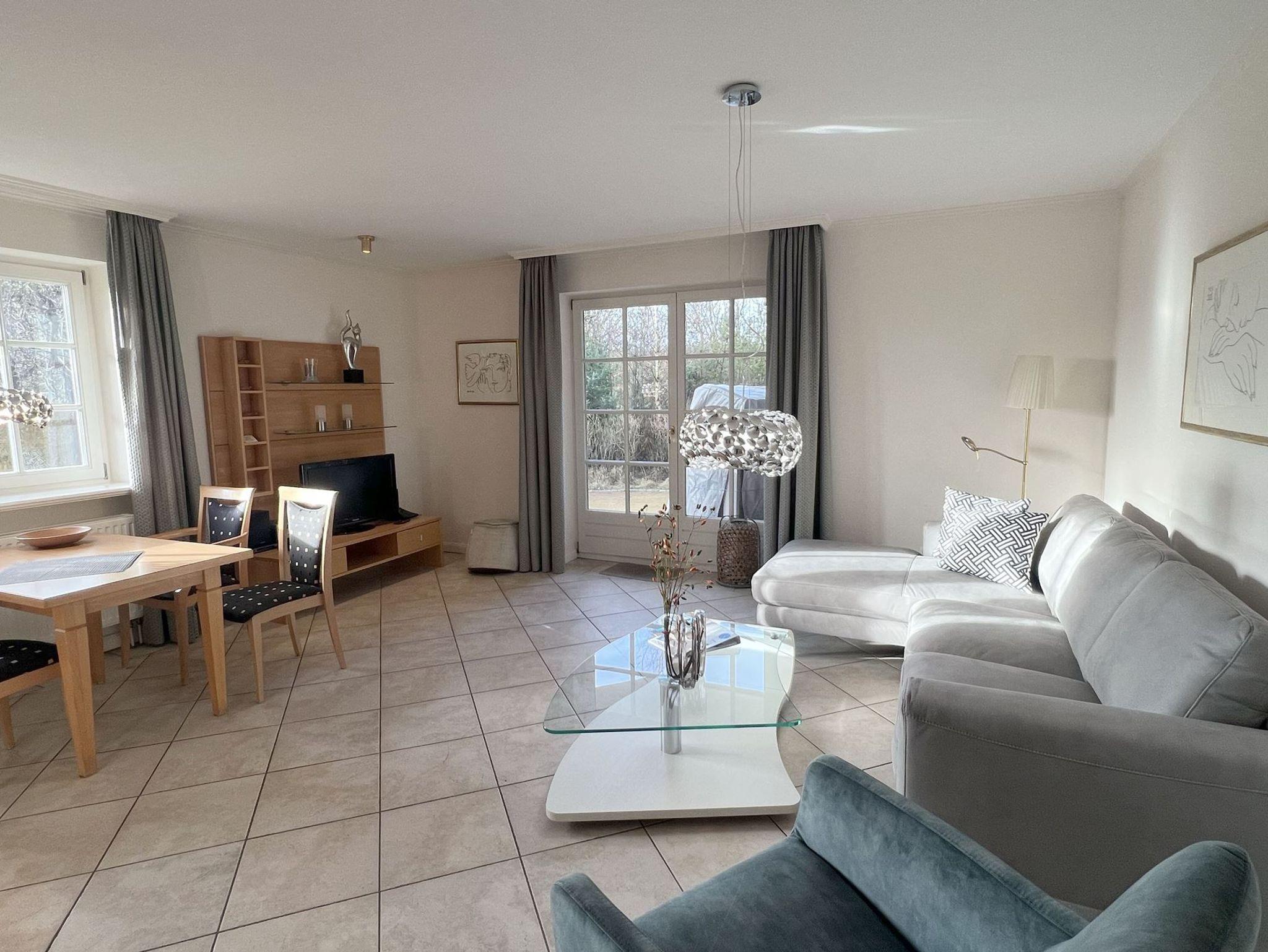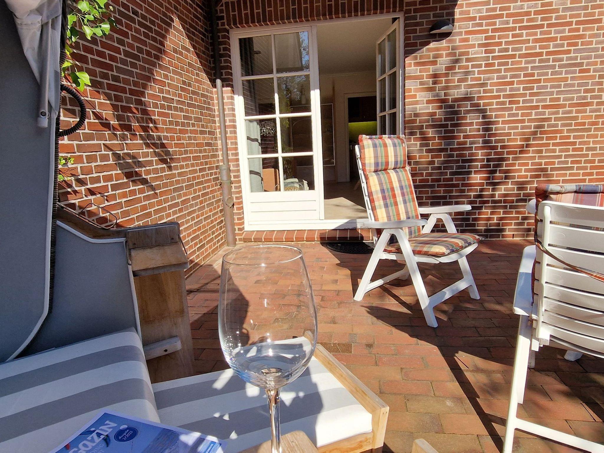 Die 85 qm große Ferienwohnung ist für 4 Pers. geplant und teilt sich wie folgt auf: Eingangsbereich; Eingangsdiele mit Garderobe; großzügiger Wohn-Essbereich mit direktem Zugang auf eine große, durch Friesenwälle und Gehölze abgeschirmte Terrasse mit Gartenmöbeln und einem Strandkorb. Zwei Schlafzimmer mit Doppelbetten, zwei Duschbäder/WC. Separate Küche. Im Untergeschoss des mittleren Einganges befindet sich eine Gemeinschaftssauna (Ruheraum, verschiede Duschen, Fußbäder) ,Fitnessraum, Tischtennis. Im Außenbereich: ein Spielplatz für die Kleinsten, Stellplatz, Fahrradständer.