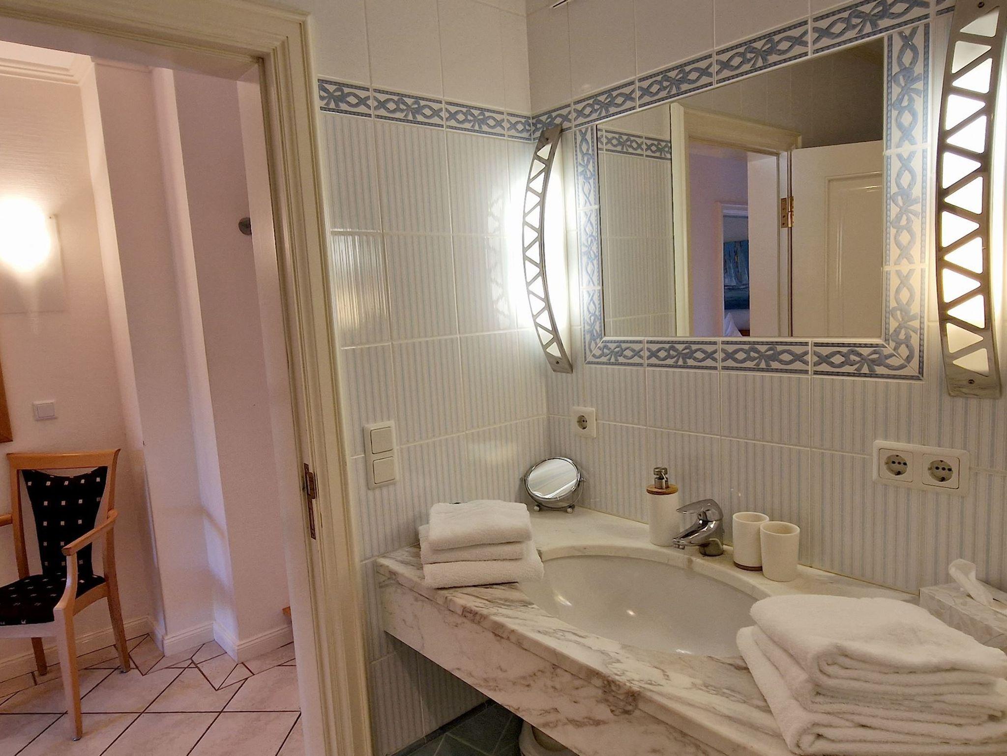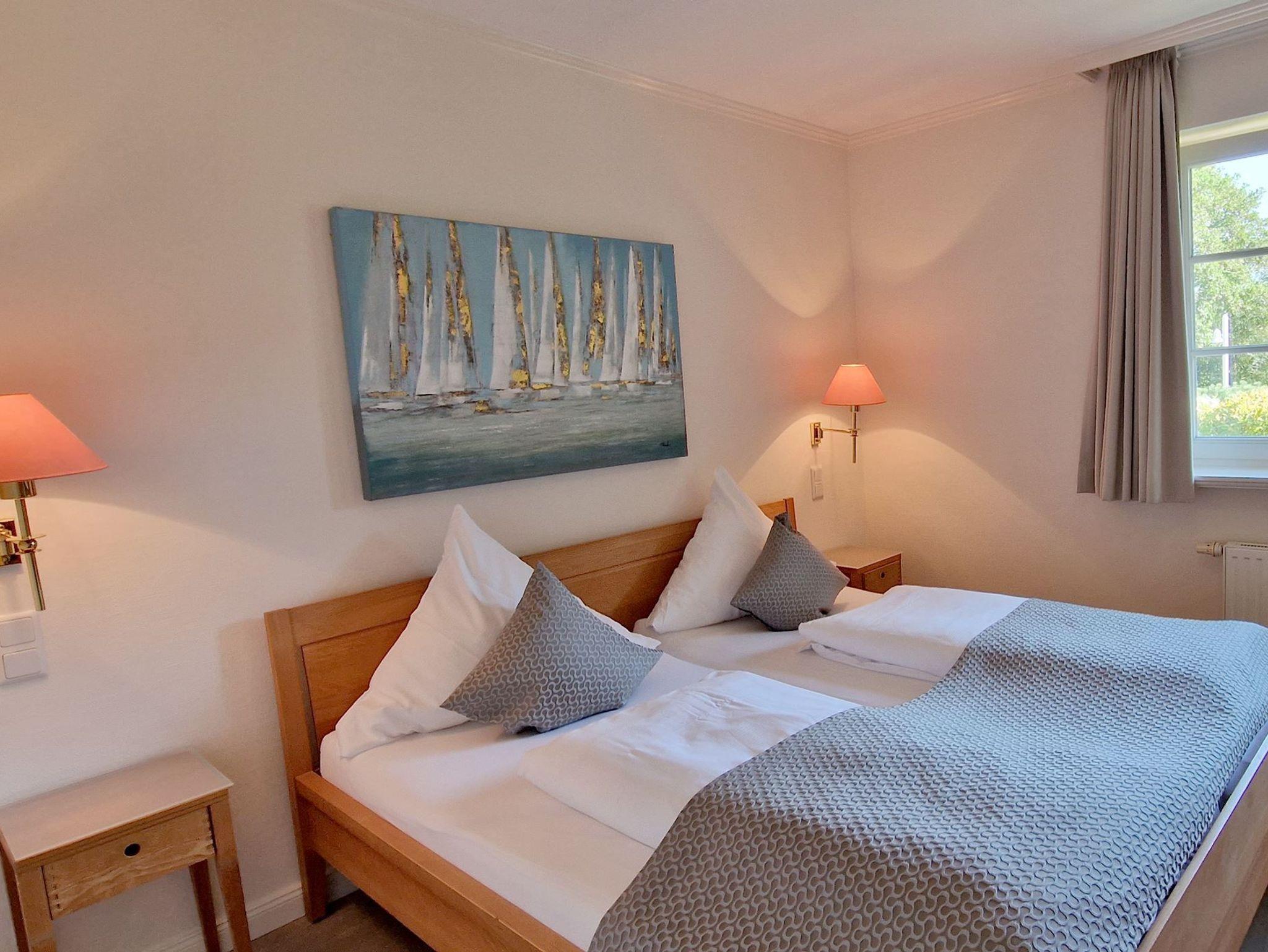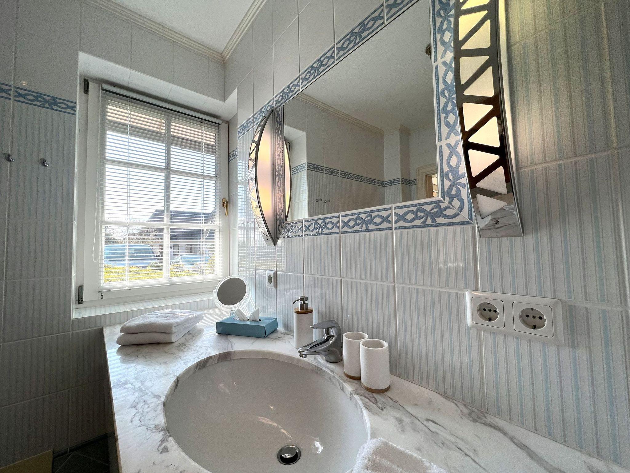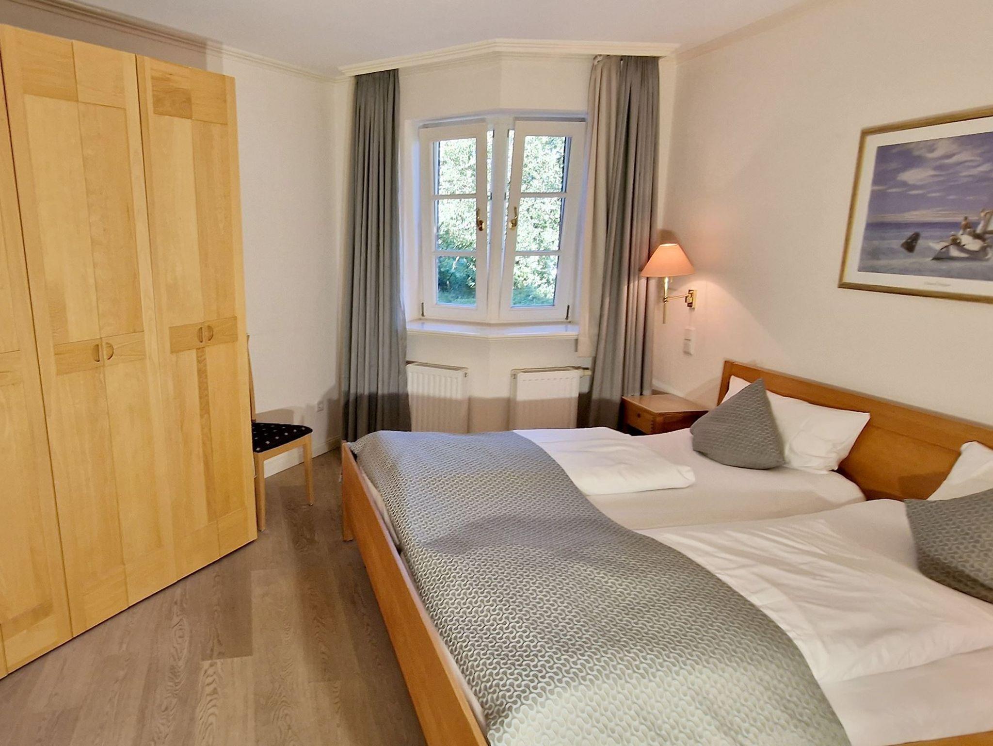 Die 85 qm große Ferienwohnung ist für 4 Pers. geplant und teilt sich wie folgt auf: Eingangsbereich; Eingangsdiele mit Garderobe; großzügiger Wohn-Essbereich mit direktem Zugang auf eine große, durch Friesenwälle und Gehölze abgeschirmte Terrasse mit Gartenmöbeln und einem Strandkorb. Zwei Schlafzimmer mit Doppelbetten, zwei Duschbäder/WC. Separate Küche. Im Untergeschoss des mittleren Einganges befindet sich eine Gemeinschaftssauna (Ruheraum, verschiede Duschen, Fußbäder) ,Fitnessraum, Tischtennis. Im Außenbereich: ein Spielplatz für die Kleinsten, Stellplatz, Fahrradständer.