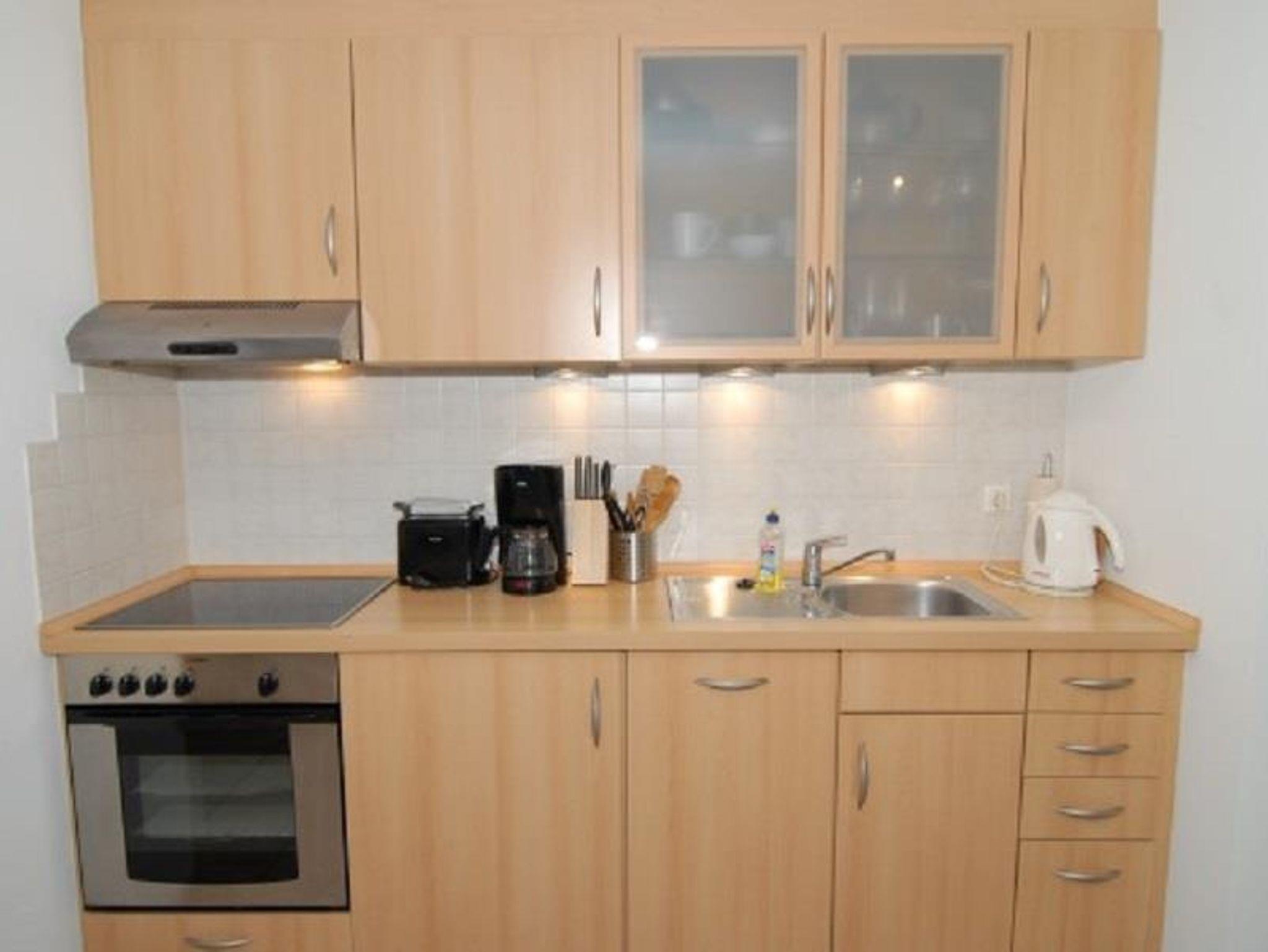 Wohnzimmer Couch, Couchtisch, Sessel, Stehlampe, TV-Regal, Sat-TV, Kofferradio mit CD-Player, Esstisch, 3 Stühle, Garderobenschrank, Spiegel, Staubsauger, Küchenzeile, 4 Plattenherd mit Ceranfeld und Backofen, Dunstabzugshaube, Kühlschrank, Spülmaschine, Kaffeemaschine, Wasserkocher, Eierkocher, Toaster, Geschirr, Kochtöpfe