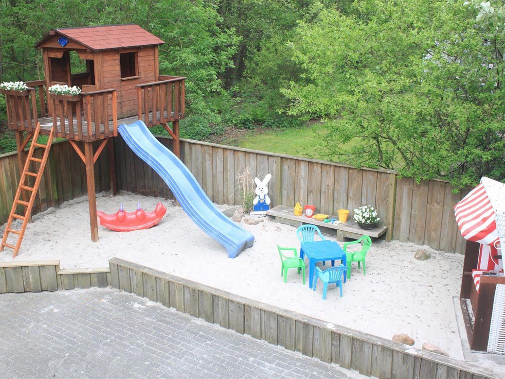 Auf die Kinder warten Bobby Car, Dreirad, Kicker und unsere große Sandspielecke, in der auch ein Strandkorb zum Verweilen einlädt.