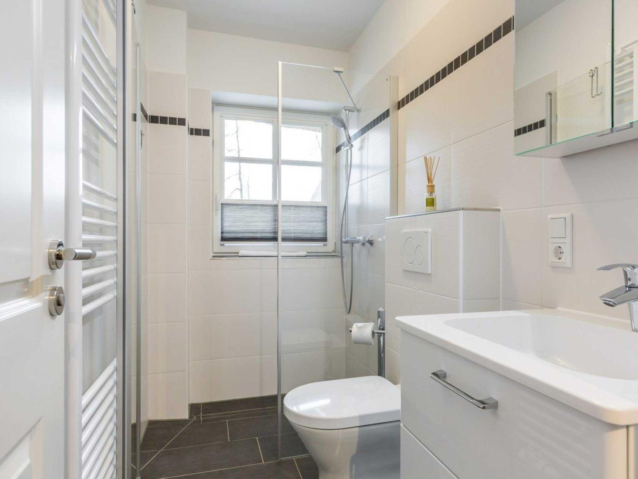 Badezimmer (Duschbad) mit bodengleicher Dusche, WC, Handtuchwärmer, Tageslicht und Föhn.