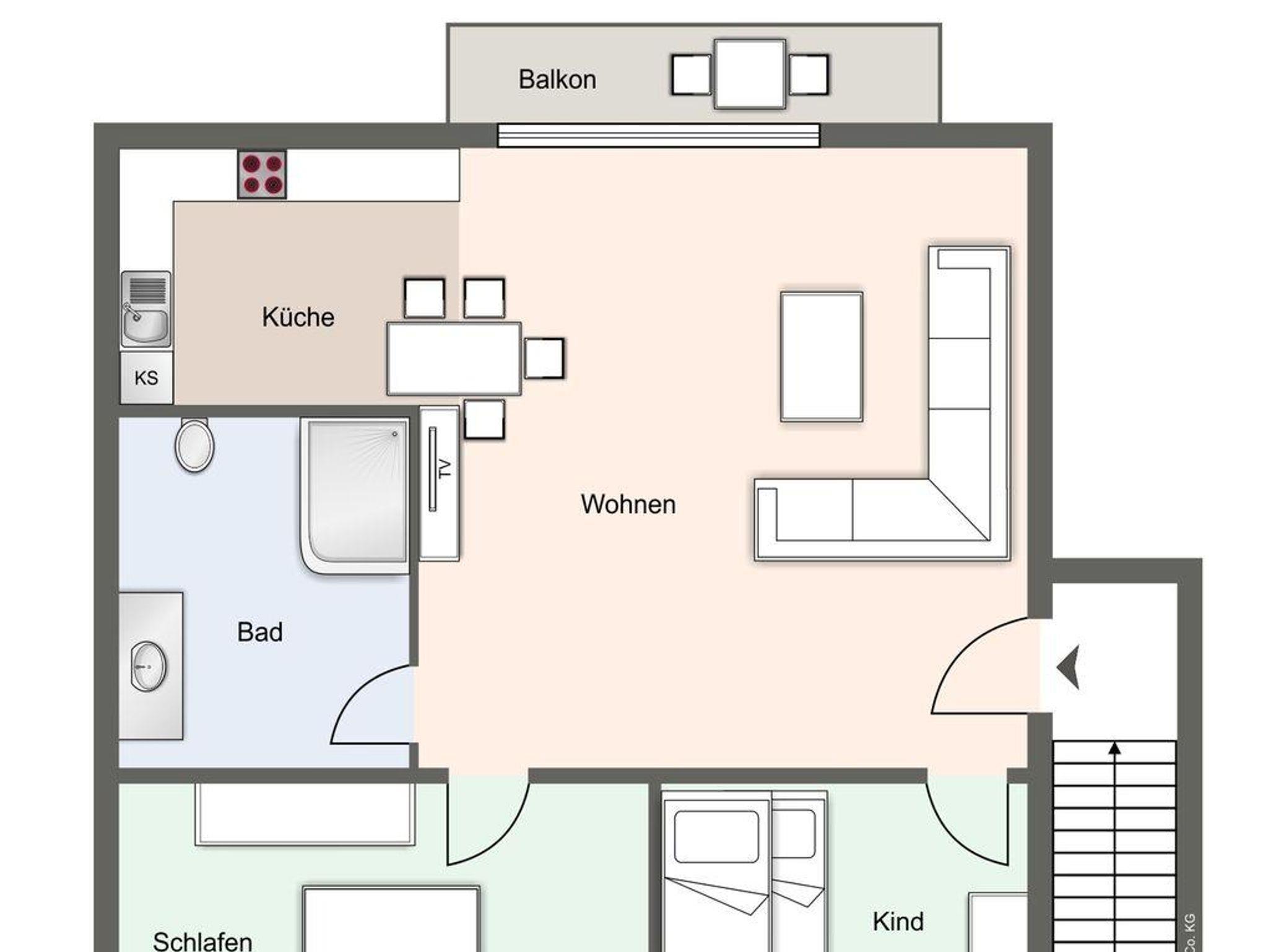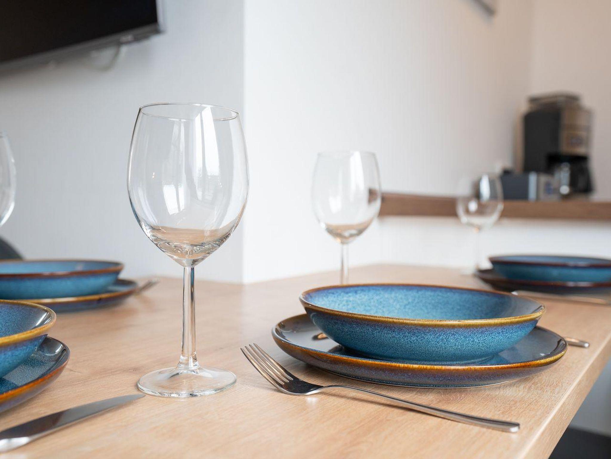 Sie betreten einen offenen Wohnraum mit TV und gemütlichem Essbereich – der ideale Ort zum Ankommen und Wohlfühlen. Die separate, voll ausgestattete Küche lässt keine Wünsche offen und macht das Zubereiten von Speisen zum Vergnügen. An den Wohnbereich schließen sich ein durchdachter Flur und zwei geschmackvoll eingerichtete Schlafzimmer an: das eine mit einem bequemen Doppelbett, das andere mit zwei Einzelbetten. Ein modernes Duschbad bietet Ihnen jeden Komfort.
