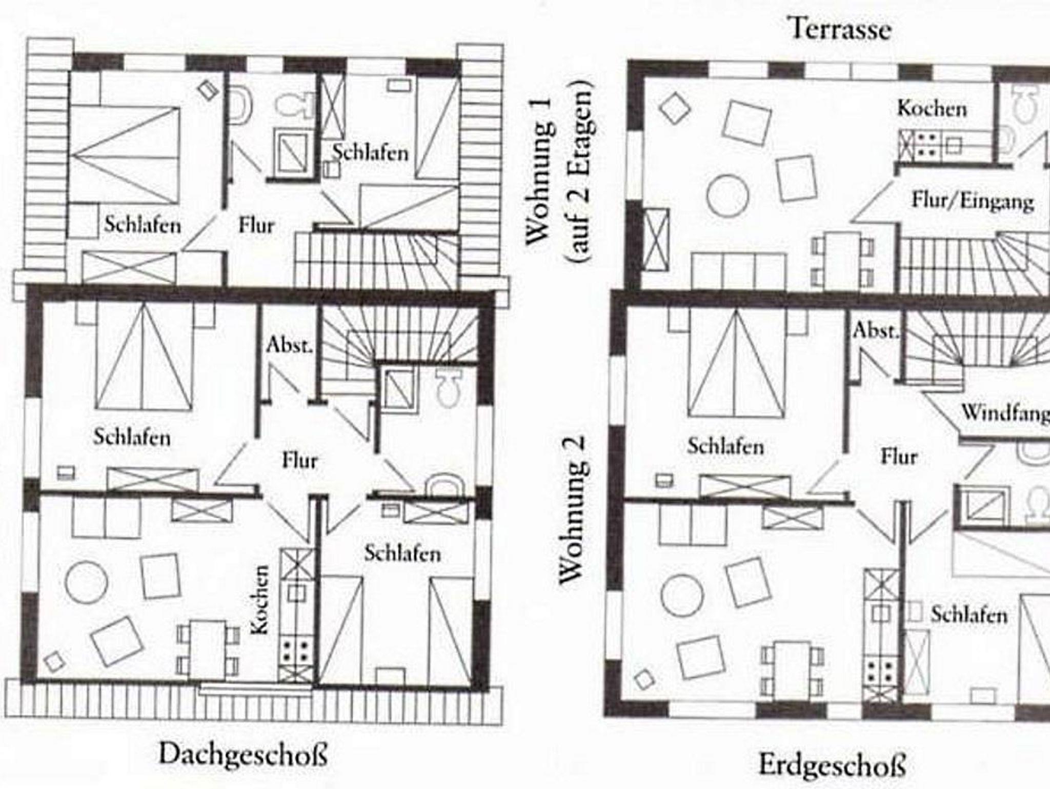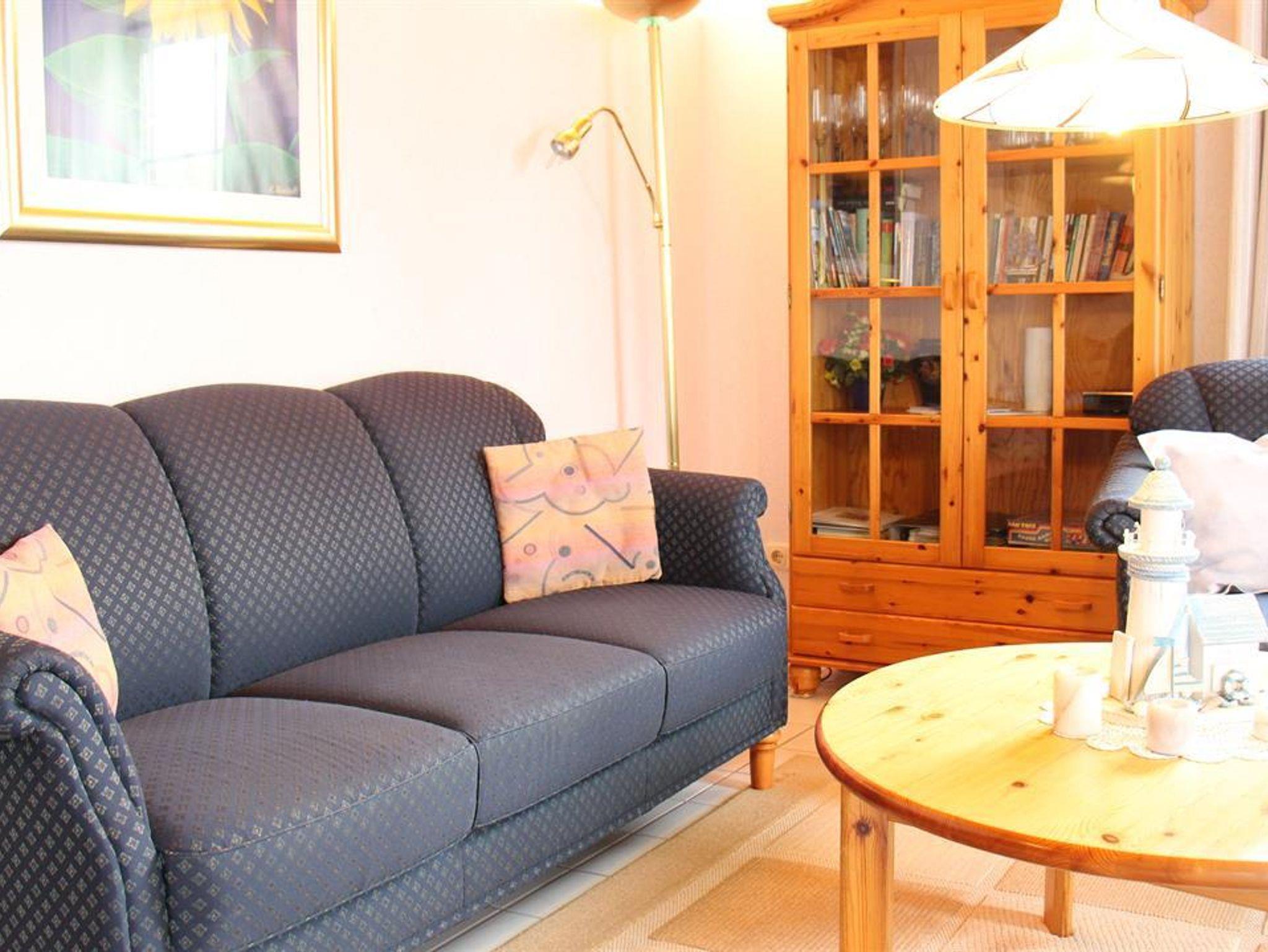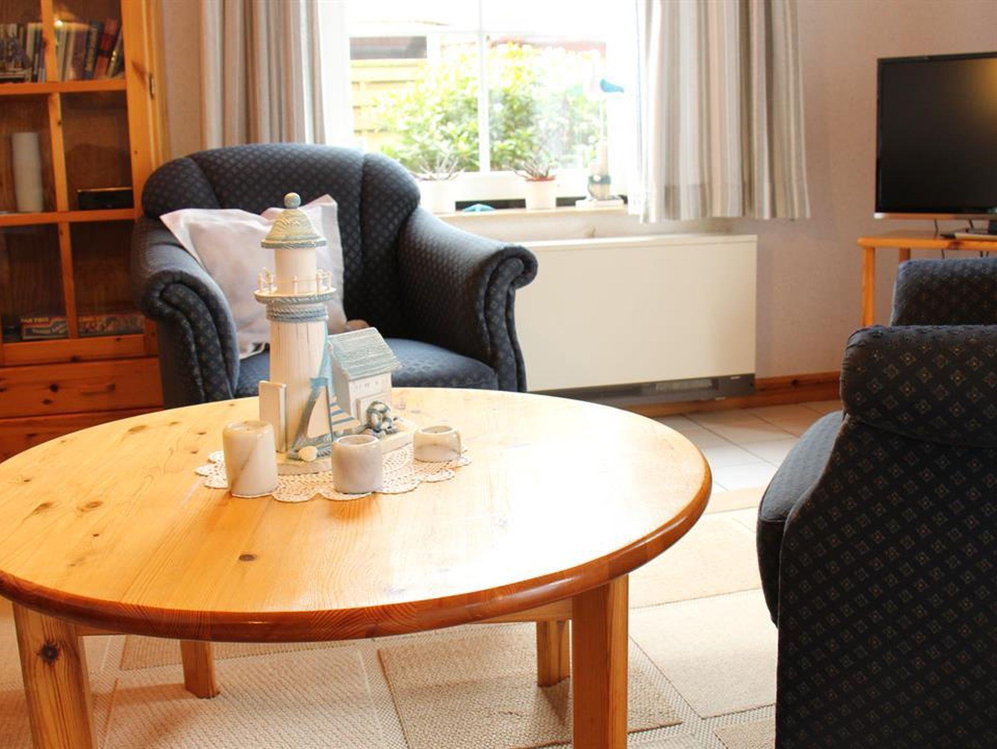 EG: 1 Wohn-Eßraum mit Küchenzeile (u.a. mit Mikrowelle), Kabel-Farb-TV, Radio (mit CD-Player). Abstellraum. Gäste-WC (alle Räume ebenerdig). Tresor. OG: 1 Schlafraum mit Doppelbett. 1 Schlafraum mit 2 Einzelbetten. Dusche/WC. Die Wohnung ist liebevoll im nordischen Stil eingerichtet. Deckenholzvertäfelung. Bettwäsche und Handtücher müssen mitgebracht werden. Kinderhochstuhl u. Kinderbett auf Wunsch nach Verfügbarkeit. Neue Designbelagböden in den Schlafzimmern.