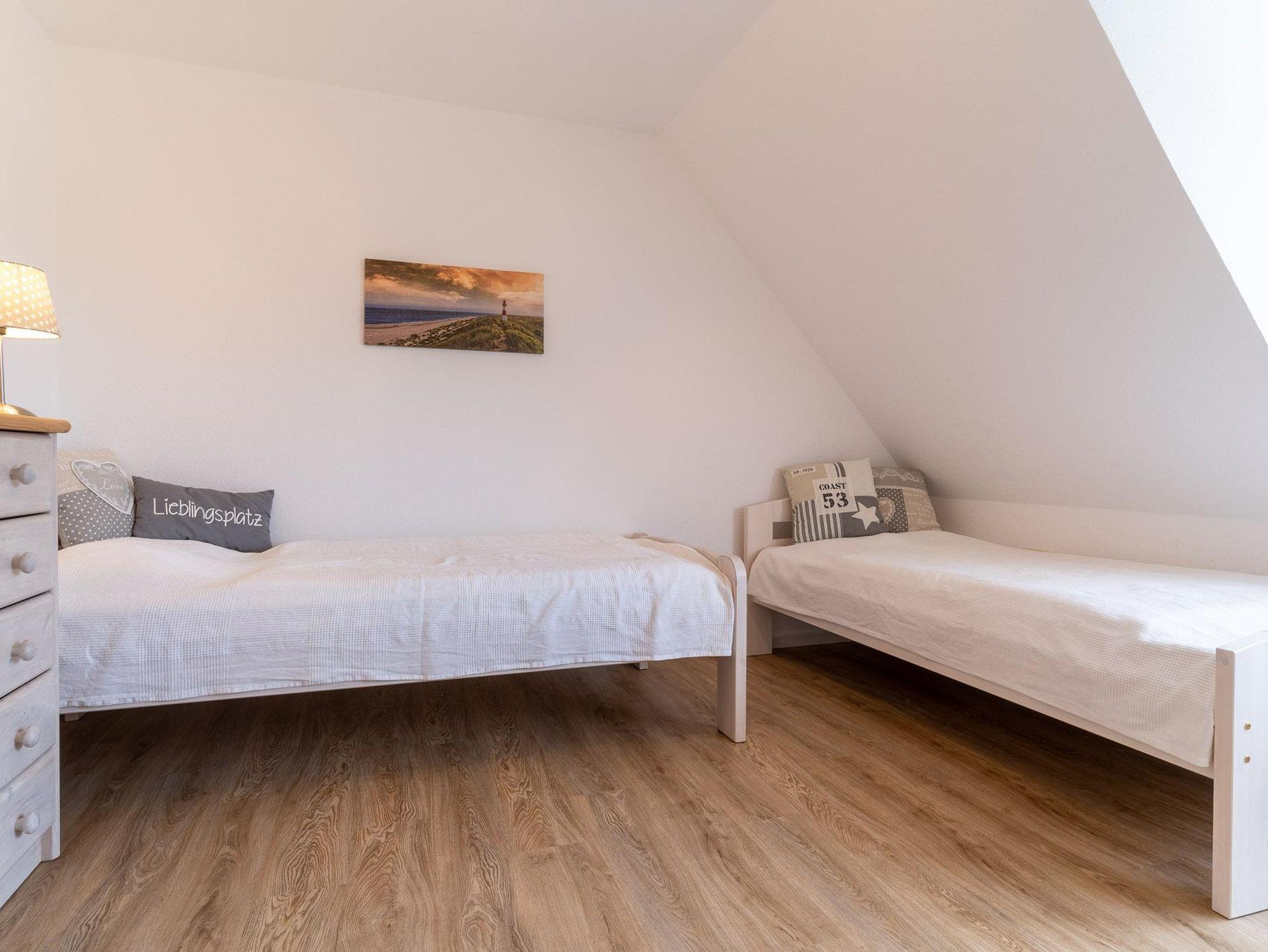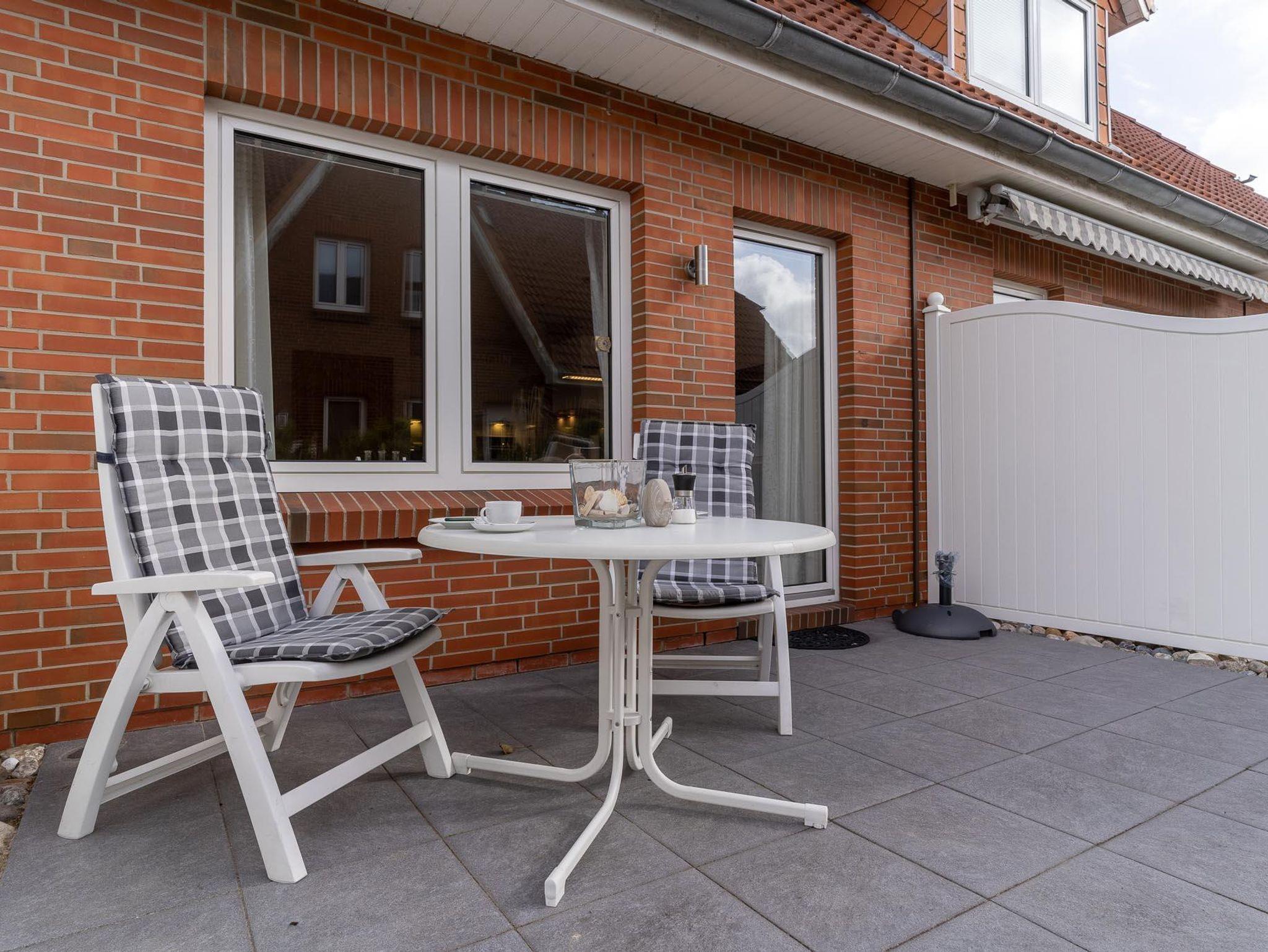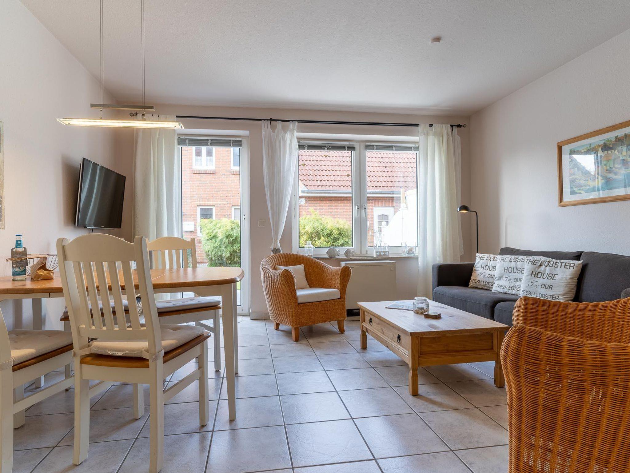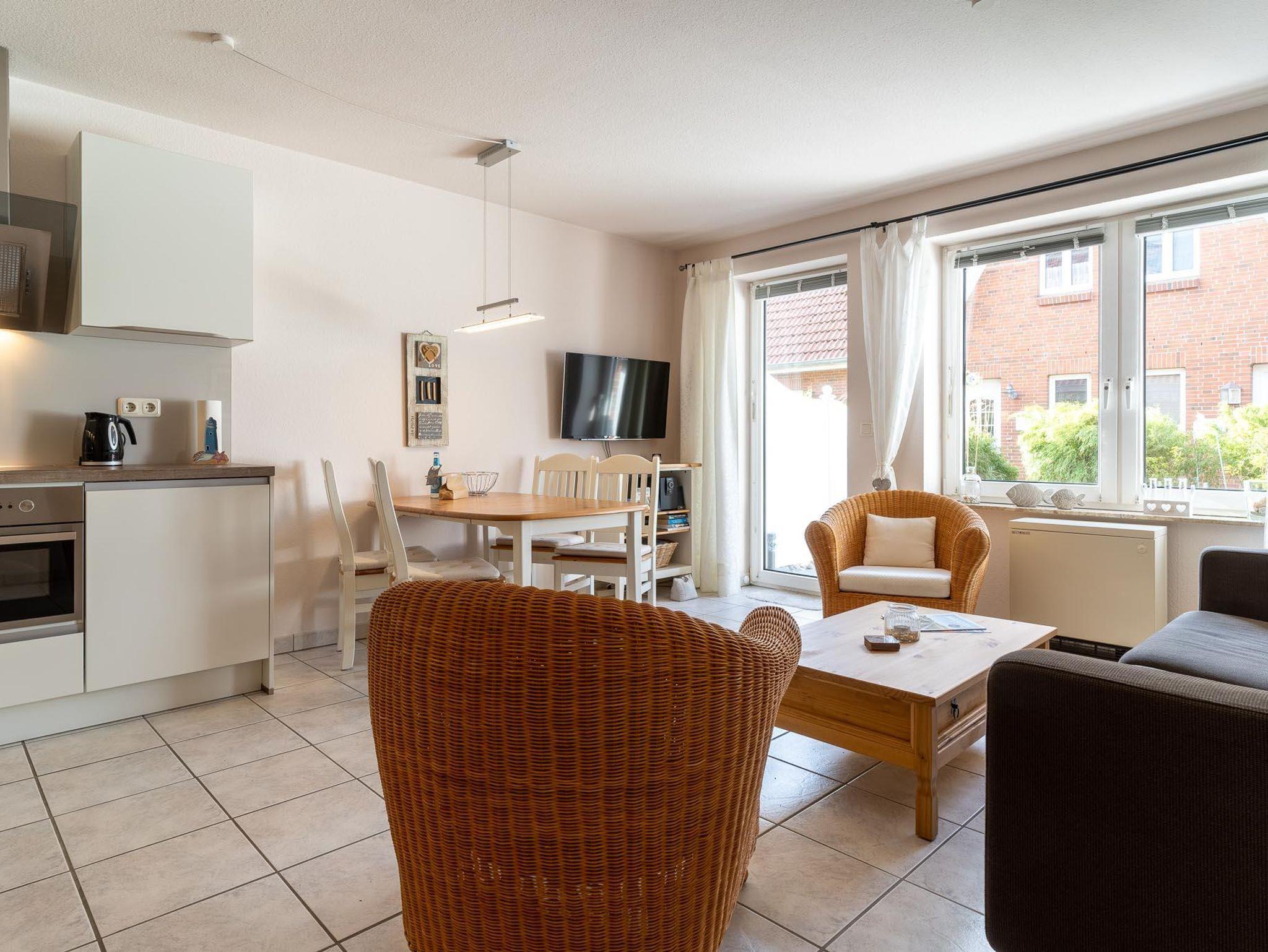 Im Erdgeschoss befindet sich das Wohn-/Esszimmer mit offener Einbauküche, ein Duschbad mit WC und Abstellraum. Vom Wohnzimmer haben Sie Zugang zur schönen Südterrasse mit kleinem Garten. Im Obergeschoss befinden sich die beiden Schlafzimmer, eins mit Doppelbett und eins mit zwei Einzelbetten. Die Wohnung hat ca. 55 qm Wohnfläche.