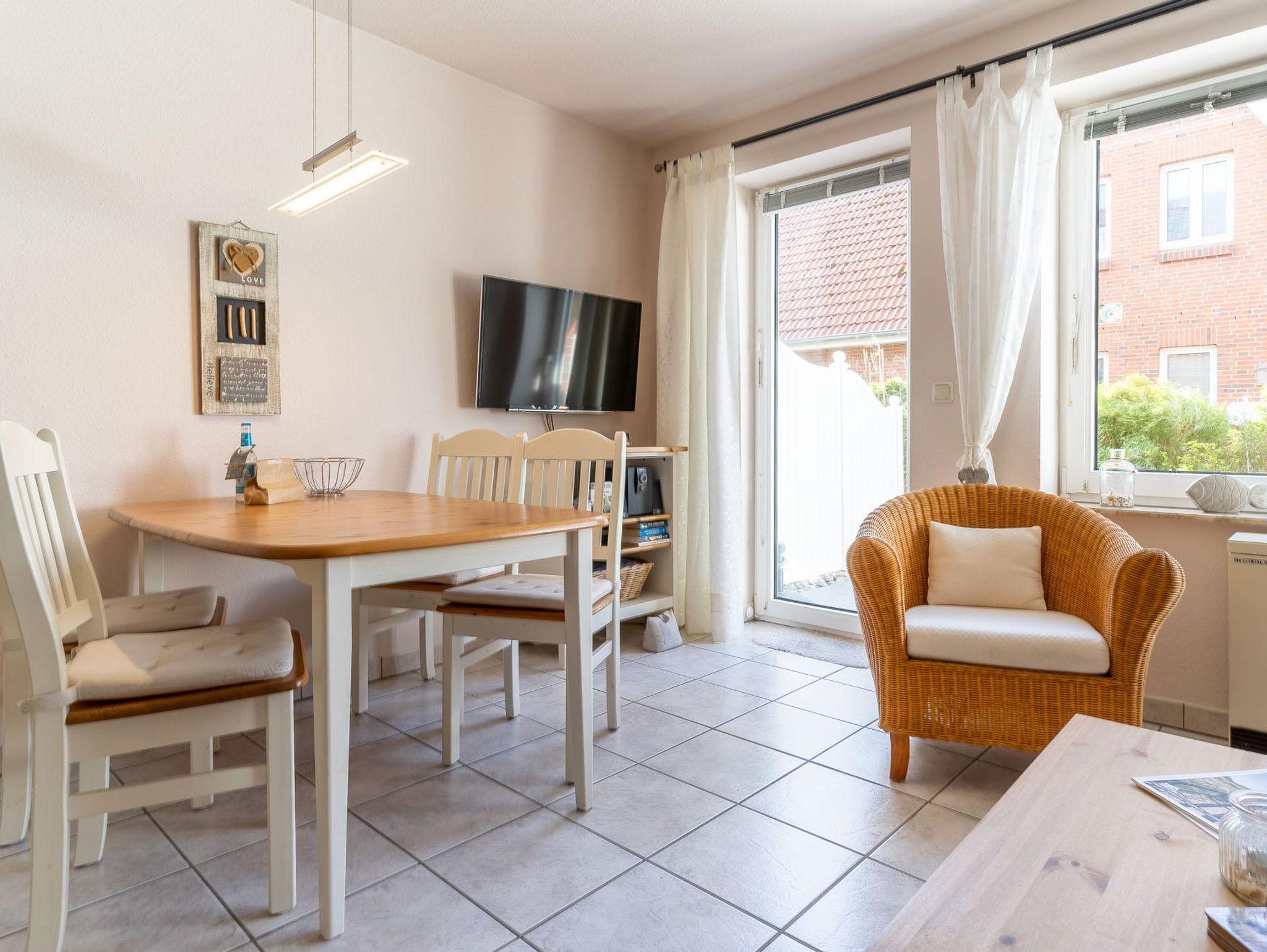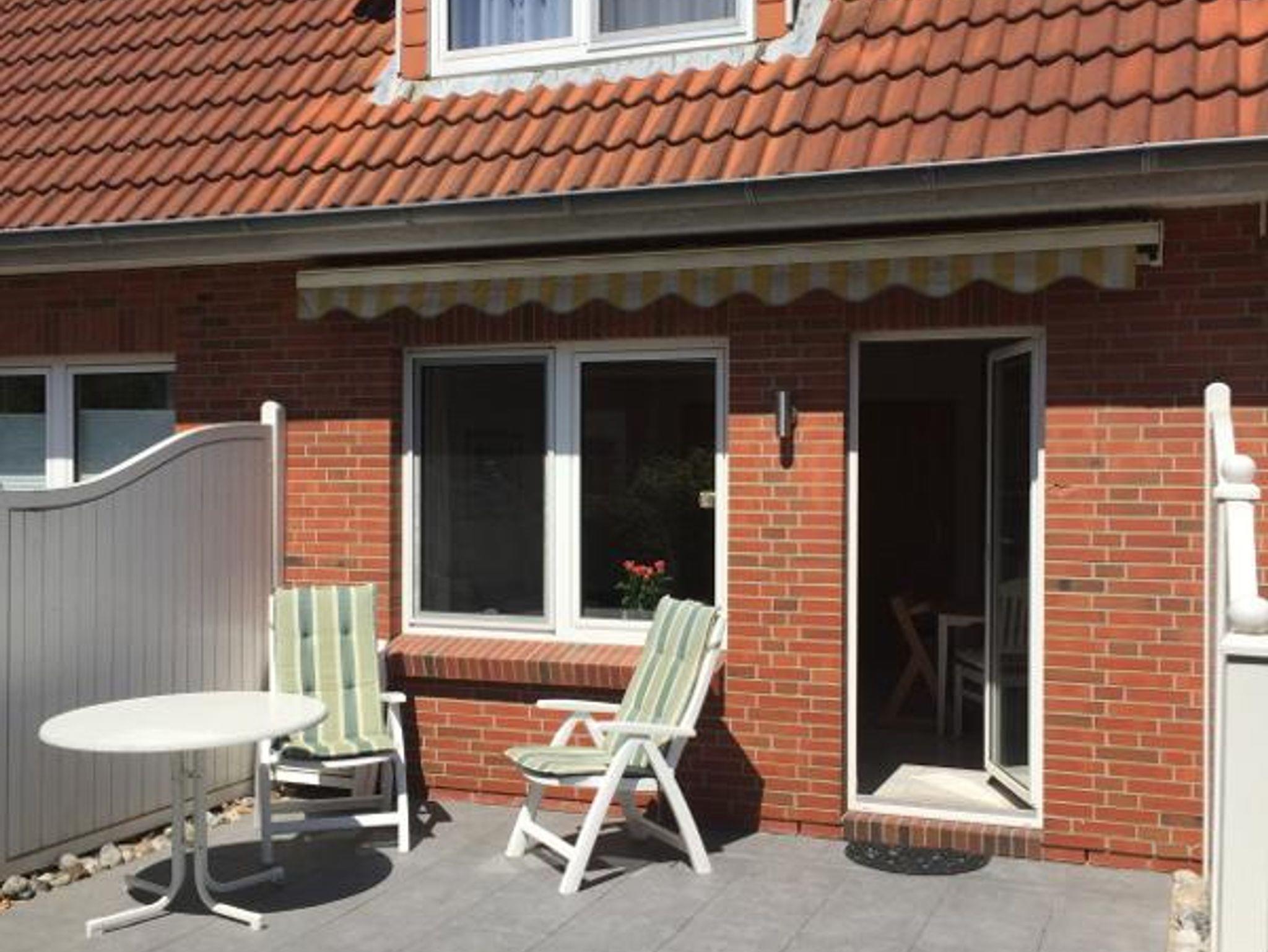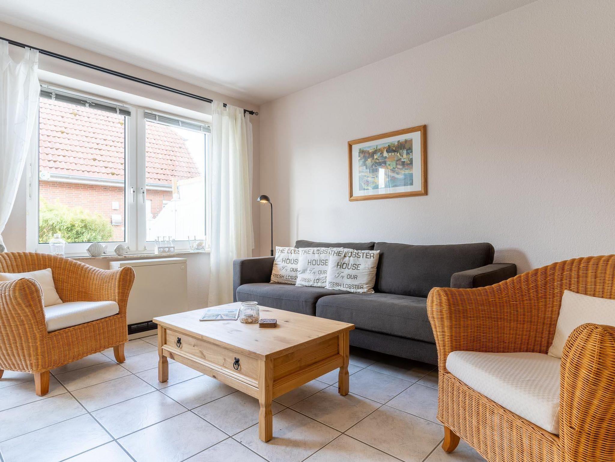 Im Erdgeschoss befindet sich das Wohn-/Esszimmer mit offener Einbauküche, ein Duschbad mit WC und Abstellraum. Vom Wohnzimmer haben Sie Zugang zur schönen Südterrasse mit kleinem Garten. Im Obergeschoss befinden sich die beiden Schlafzimmer, eins mit Doppelbett und eins mit zwei Einzelbetten. Die Wohnung hat ca. 55 qm Wohnfläche.