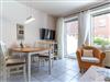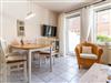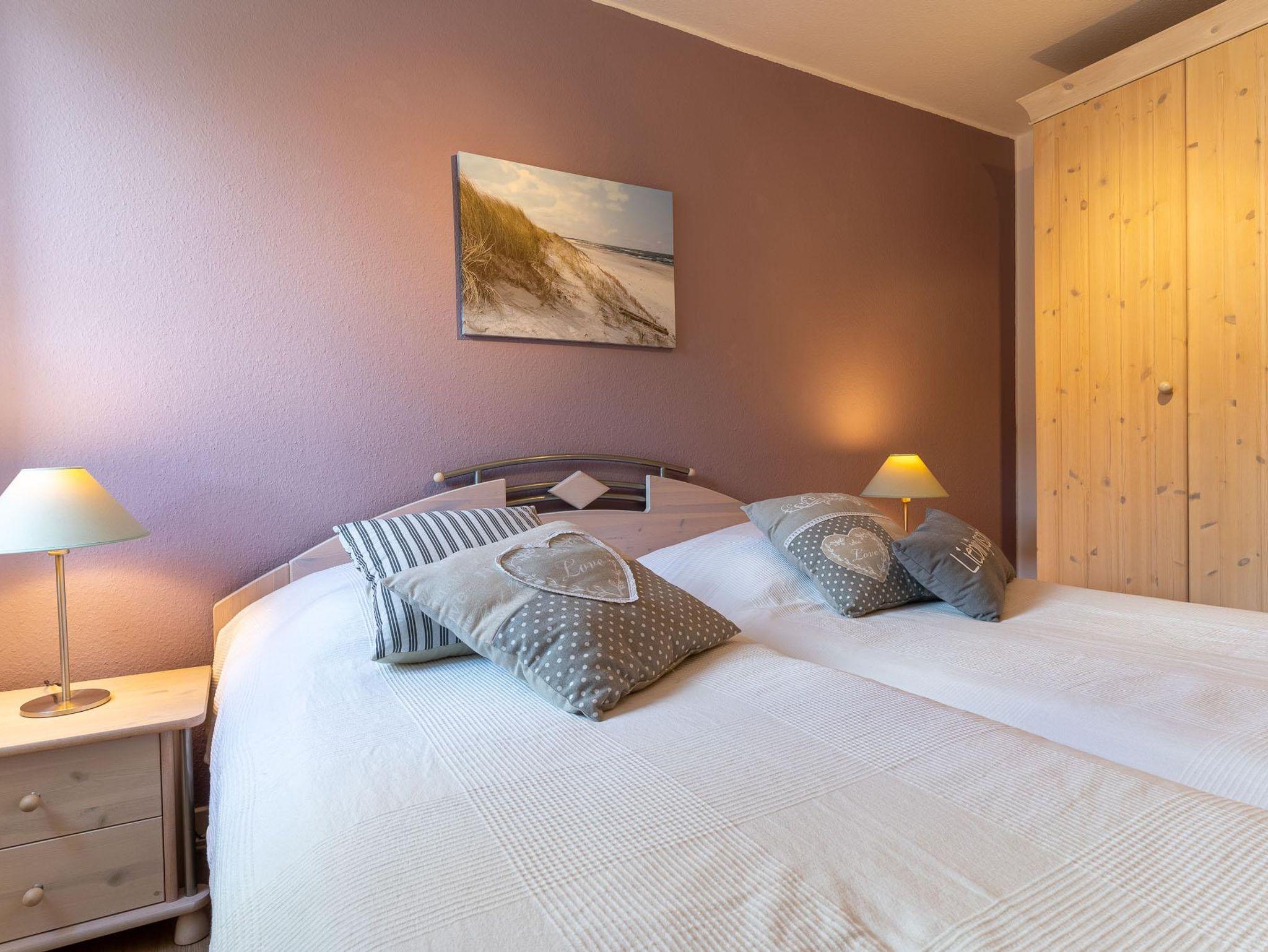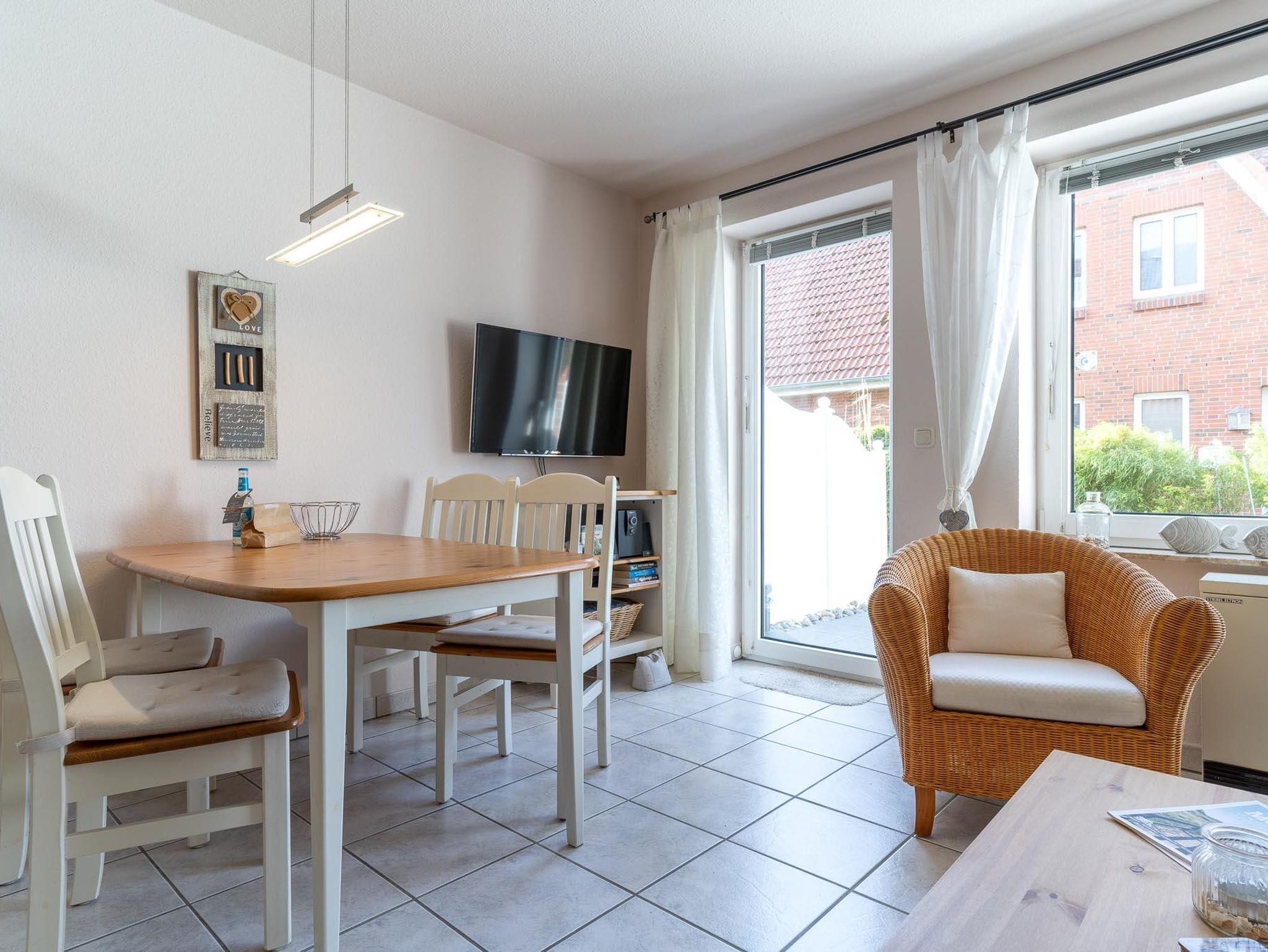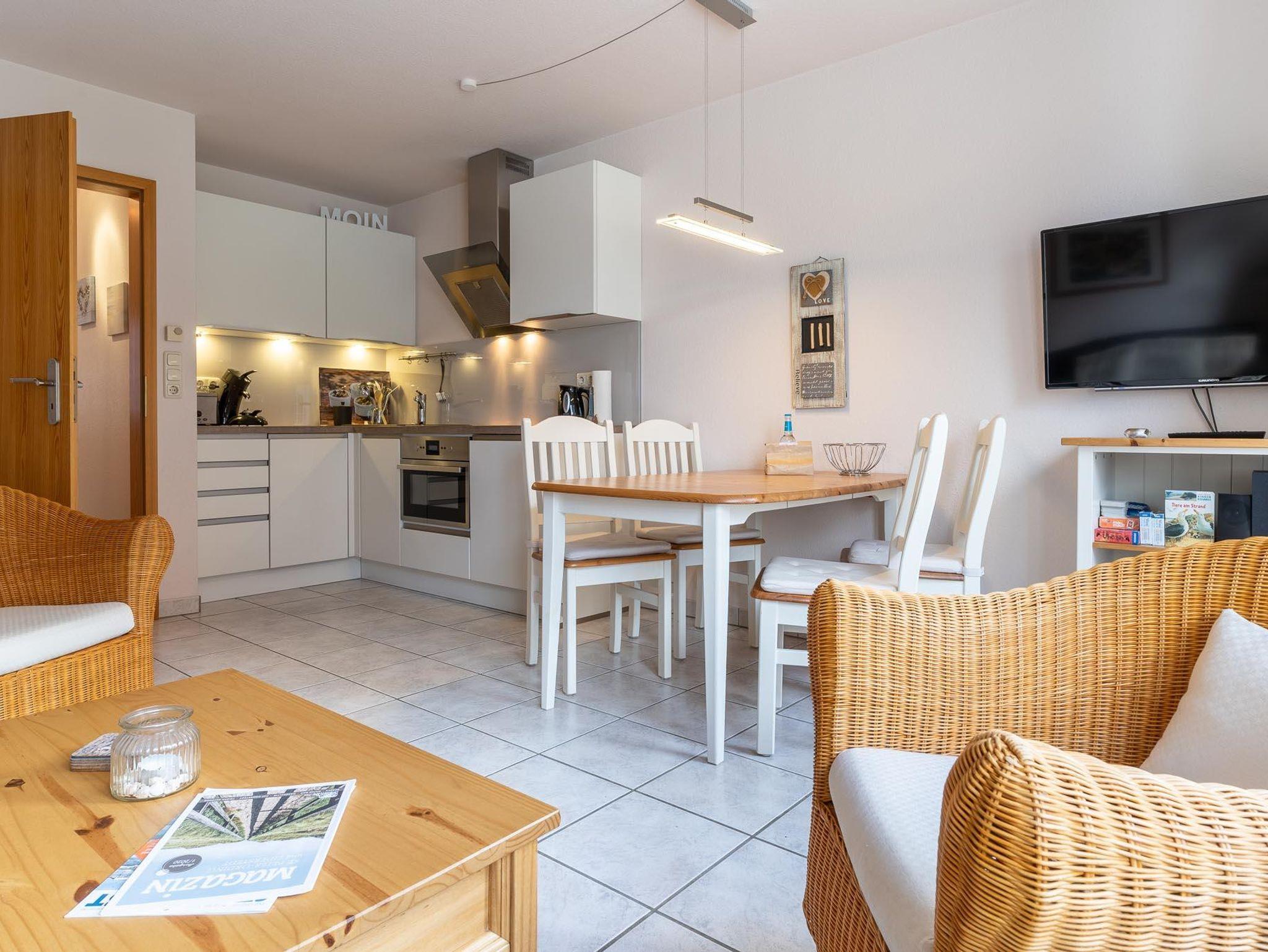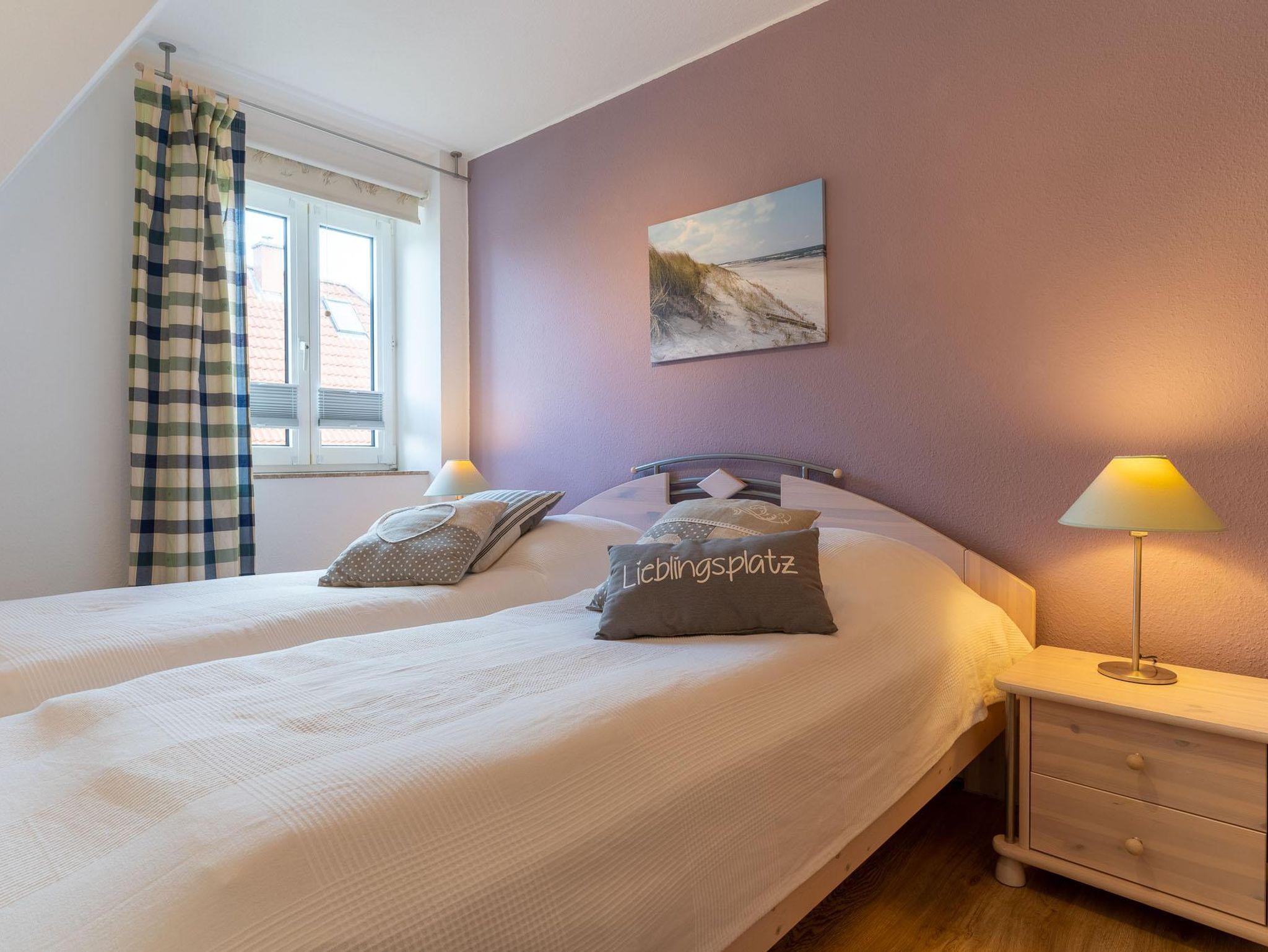 Im Erdgeschoss befindet sich das Wohn-/Esszimmer mit offener Einbauküche, ein Duschbad mit WC und Abstellraum. Vom Wohnzimmer haben Sie Zugang zur schönen Südterrasse mit kleinem Garten. Im Obergeschoss befinden sich die beiden Schlafzimmer, eins mit Doppelbett und eins mit zwei Einzelbetten. Die Wohnung hat ca. 55 qm Wohnfläche.