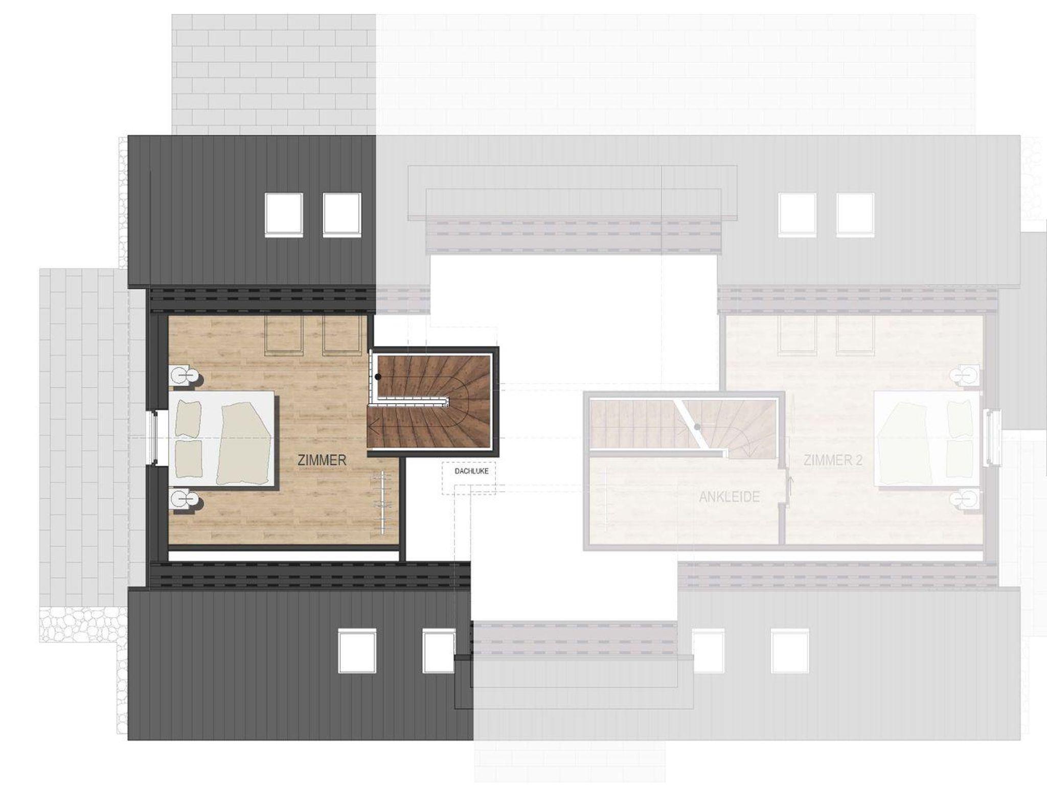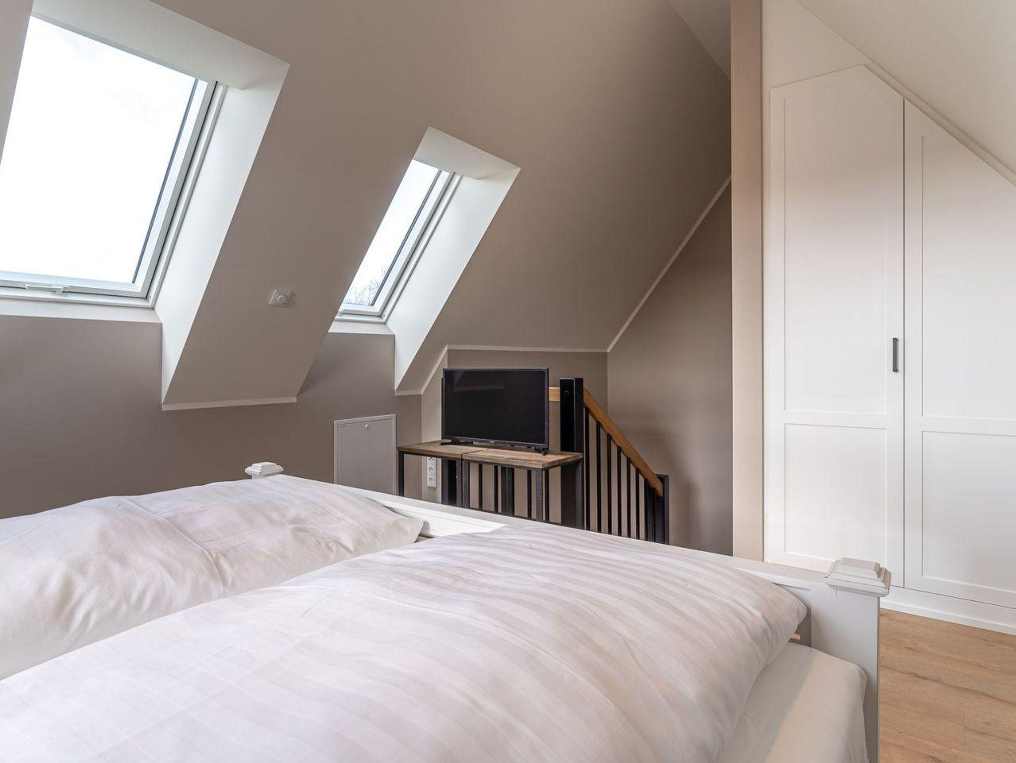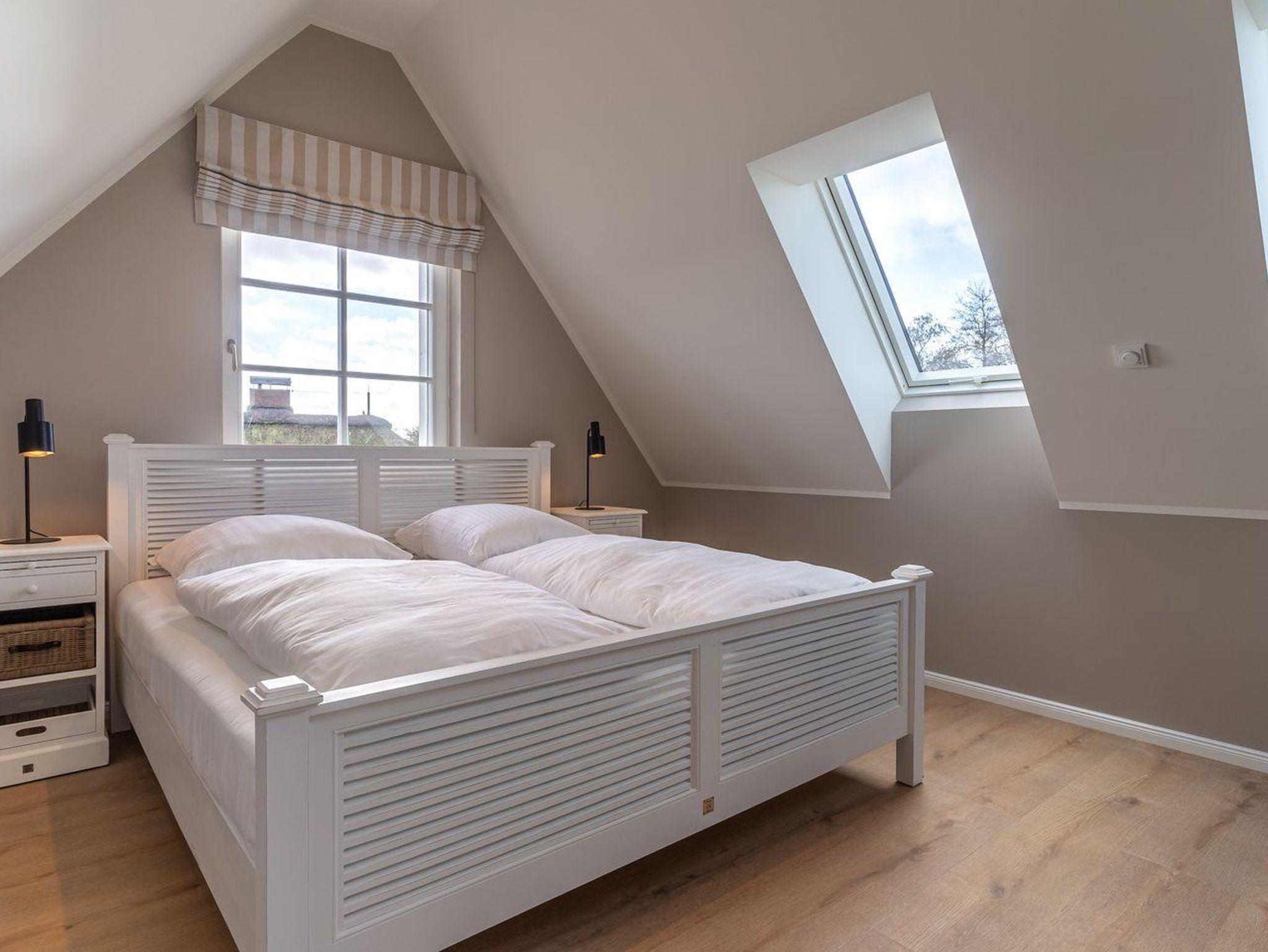 Über eine wunderschöne Treppe gelangen Sie in das großzügige und liebevoll eingerichtete Schlafzimmer, welches über ein Doppelbett und einen TV verfügt.
