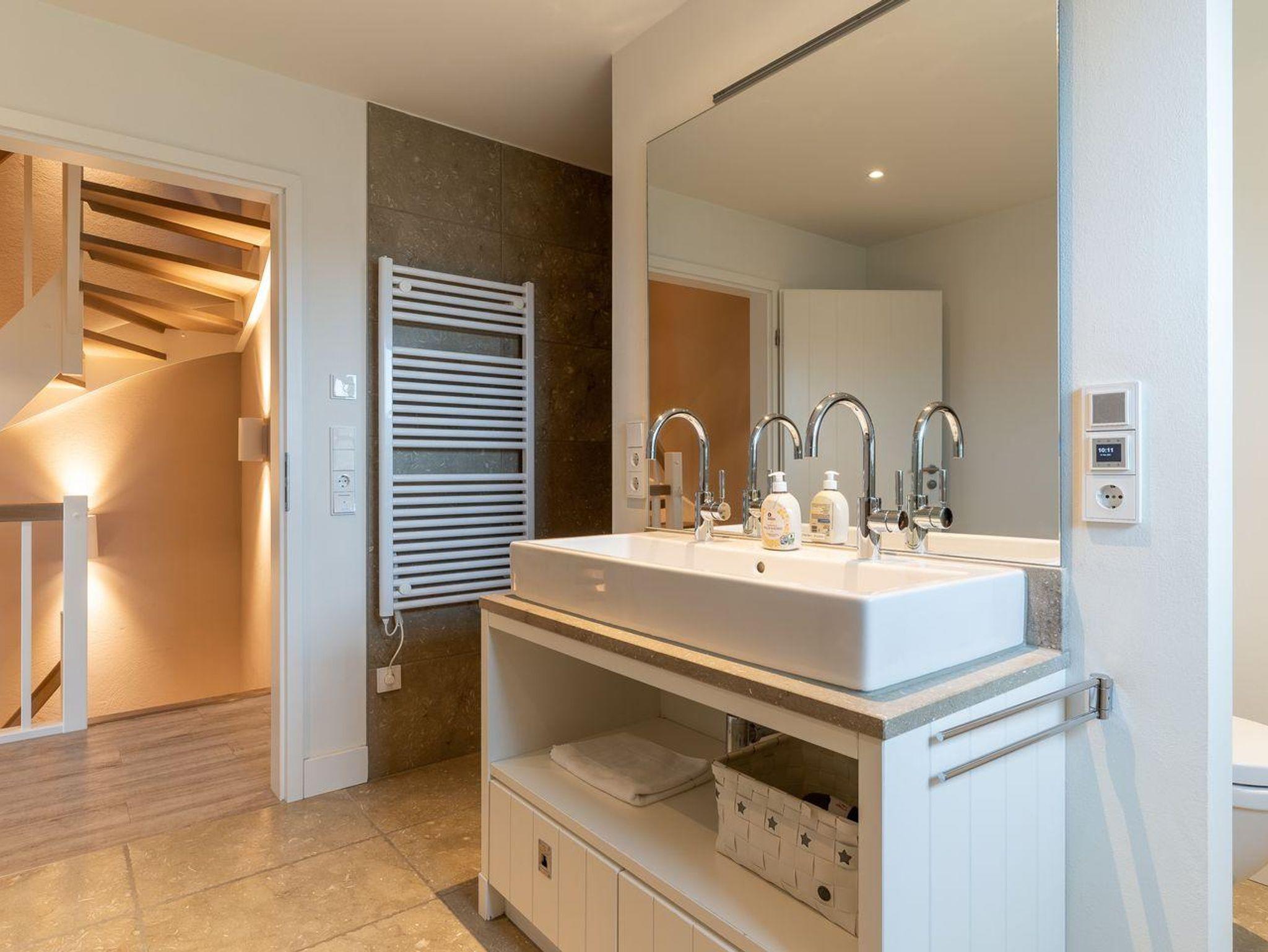 Über eine Holztreppe gelangt man in das Obergeschoss mit zwei großzügigen Schlafzimmern, ein Doppelschlafzimmer mit TV und großem Einbauschrank und ein Dreibettzimmer mit einem Einzelbett, sowie 2 weiteren Einzelbetten, diese können jedoch mit einem Klick zu einem Doppelbett umgewandelt werden. Durchdacht bis ins letzte Detail. Im OG ist außerdem noch ein 3. Bad - ein Vollbad mit Dusche und Badewanne.