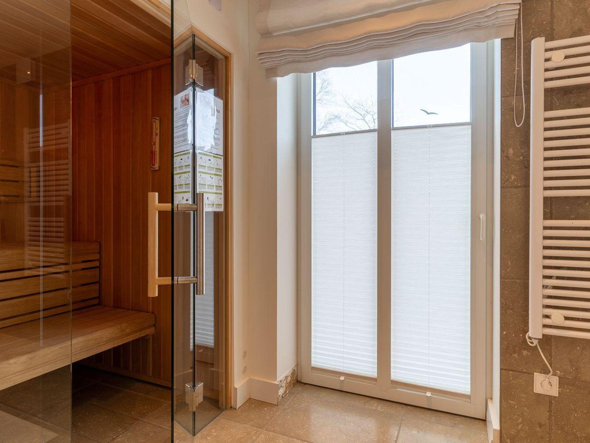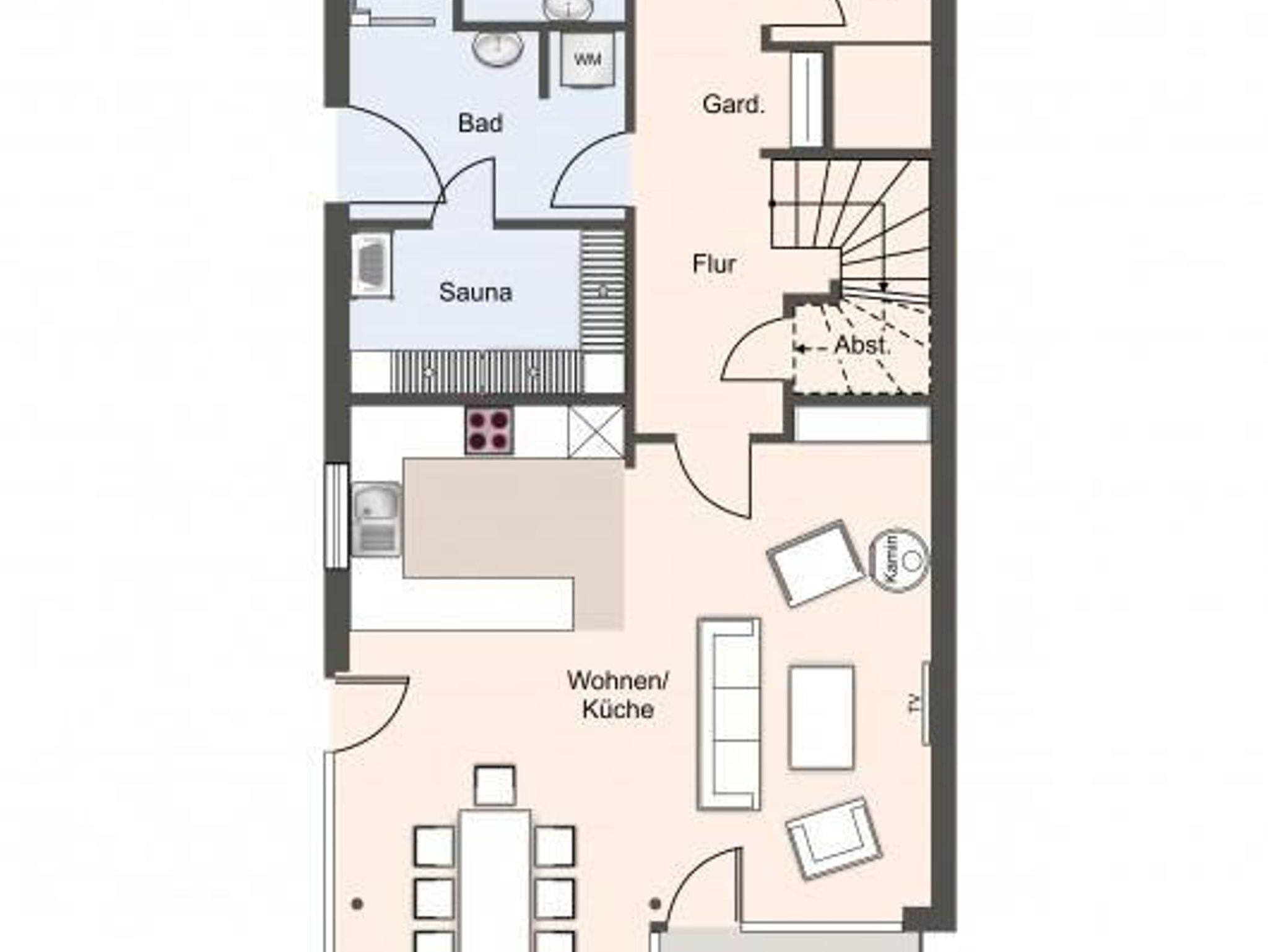 Im Erdgeschoss befindet sich der lichtdurchflutete Wohnraum mit einer offenen Küche und einem gemütlichen Essbereich. Die Küche ist mit hochwertigen Geräten voll ausgestattet. Ein edler Kamin im Wohnraum bietet einen warmen Charakter. Im Erdgeschoss ist ebenso ein großer Flur mit eingebauter Garderobe, ein Hauswirtschaftsraum und ein großzügiges Gästebad. Außerdem ein Duschbad mit einer großzügigen Sauna. Die Sauna ist mit entspannter Hintergrundmusik, Beleuchtung und jeglichem Komfort.