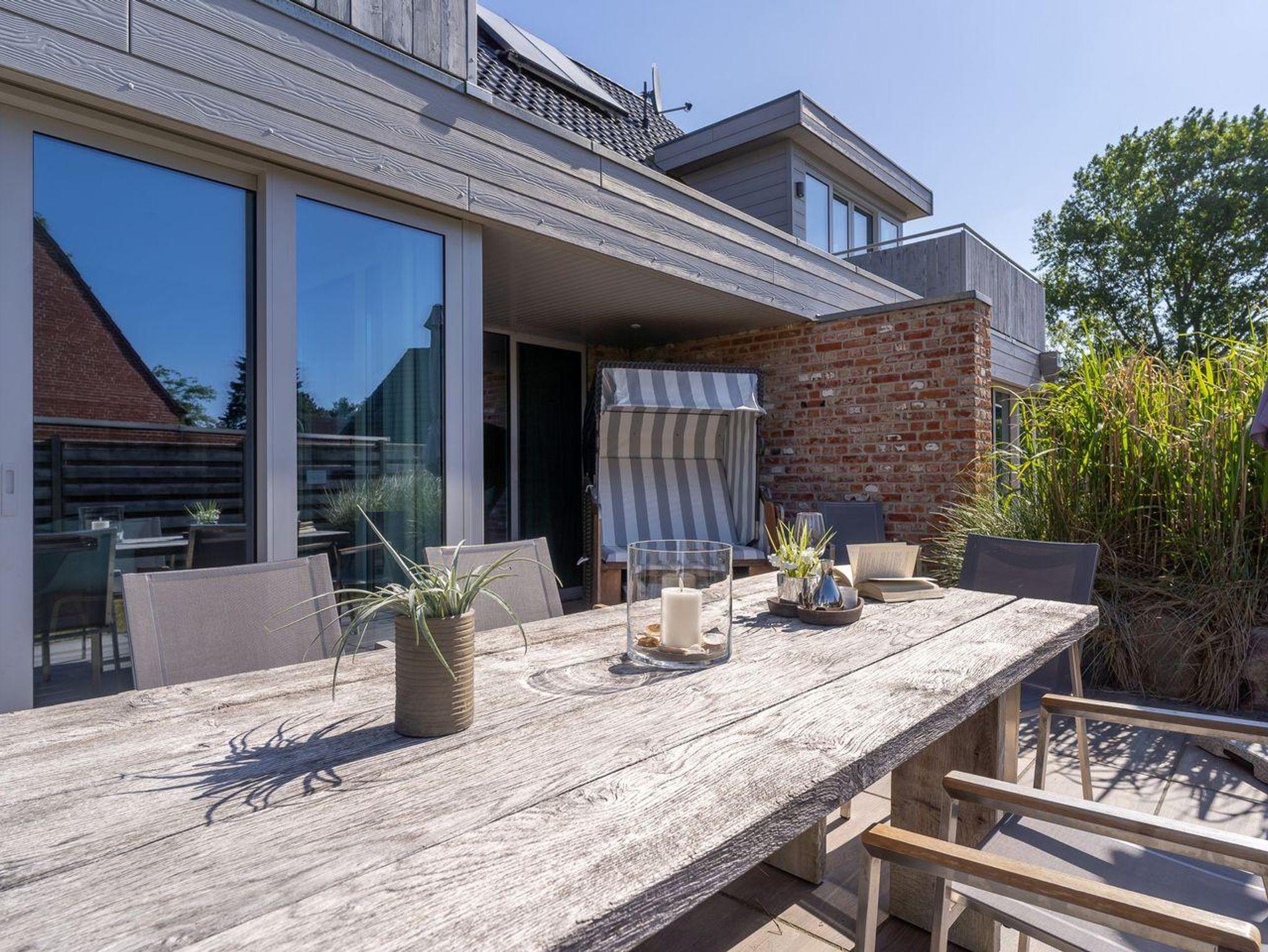 Das Grundstück mit Stellplatz, Abstellraum, Garten und einer großzügigen geschützten Terrasse inklusive edlen Gartenmöbeln ist mit hübschen Pflanzen und einem Friesenwall angelegt.