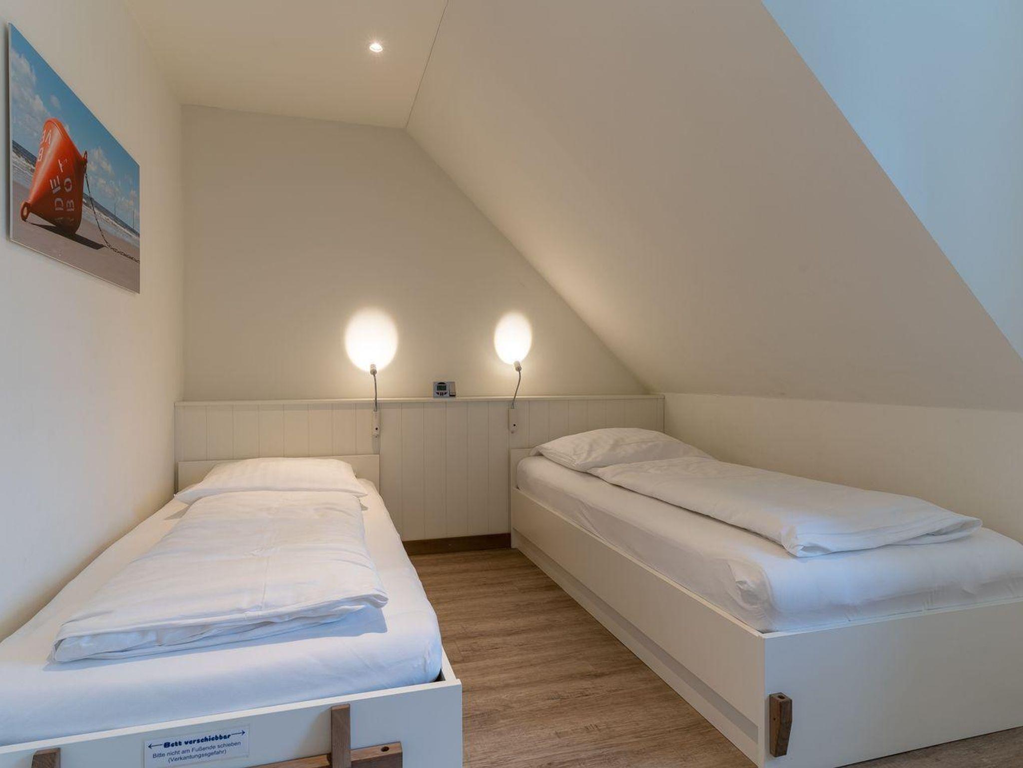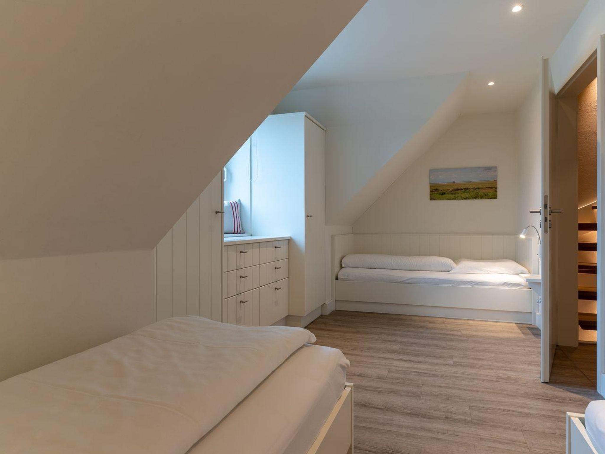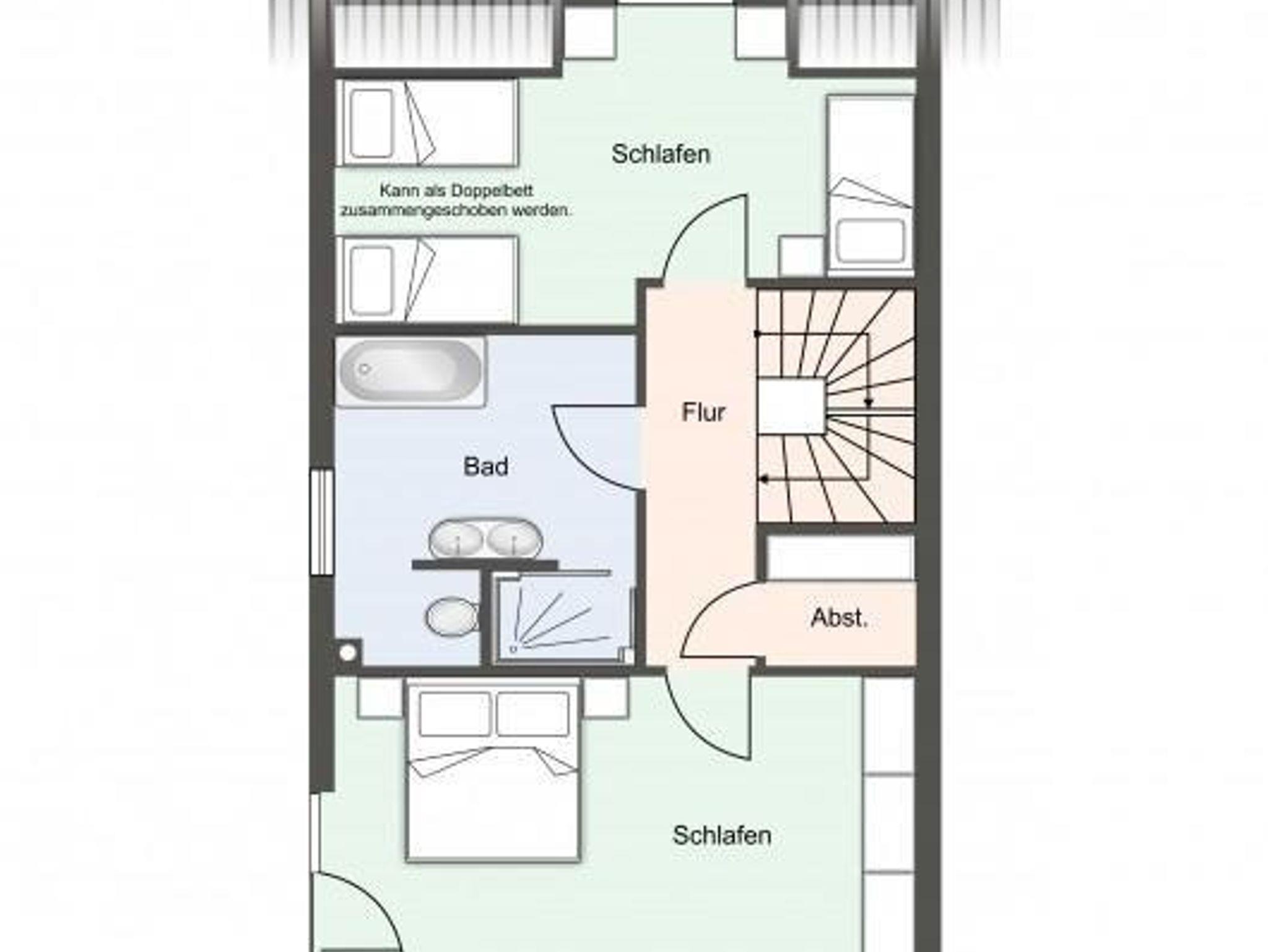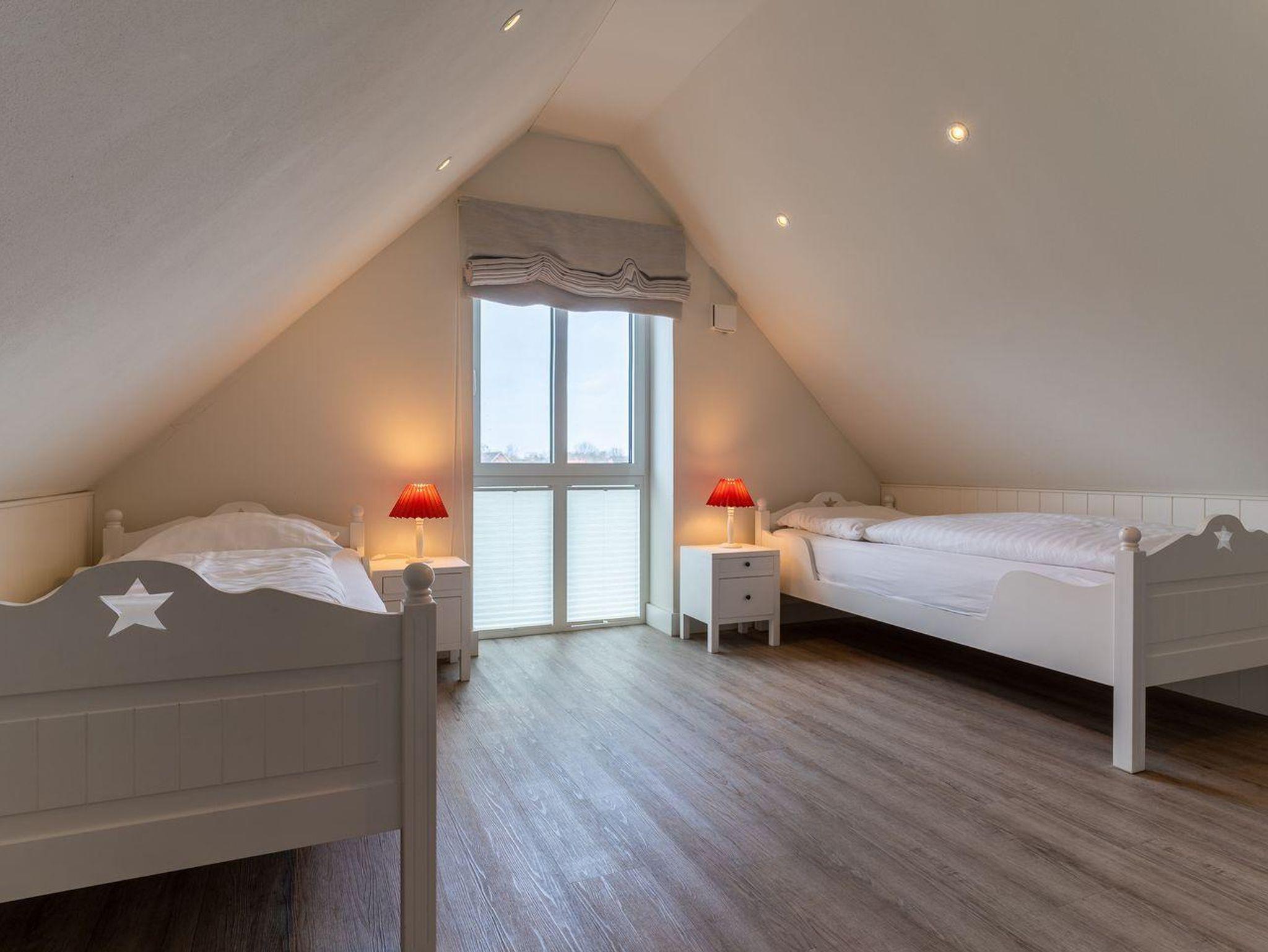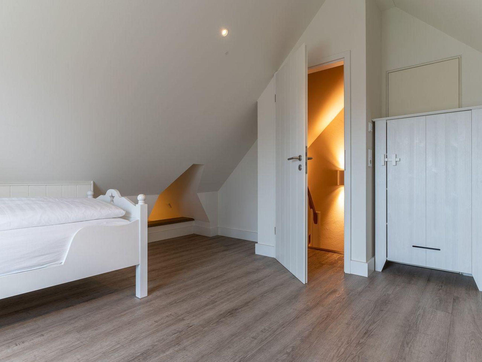 Über eine weitere Holztreppe geht es vom Flur ins Dachgeschoss mit einem weiteren Zimmer mit 2 Einzelbetten.