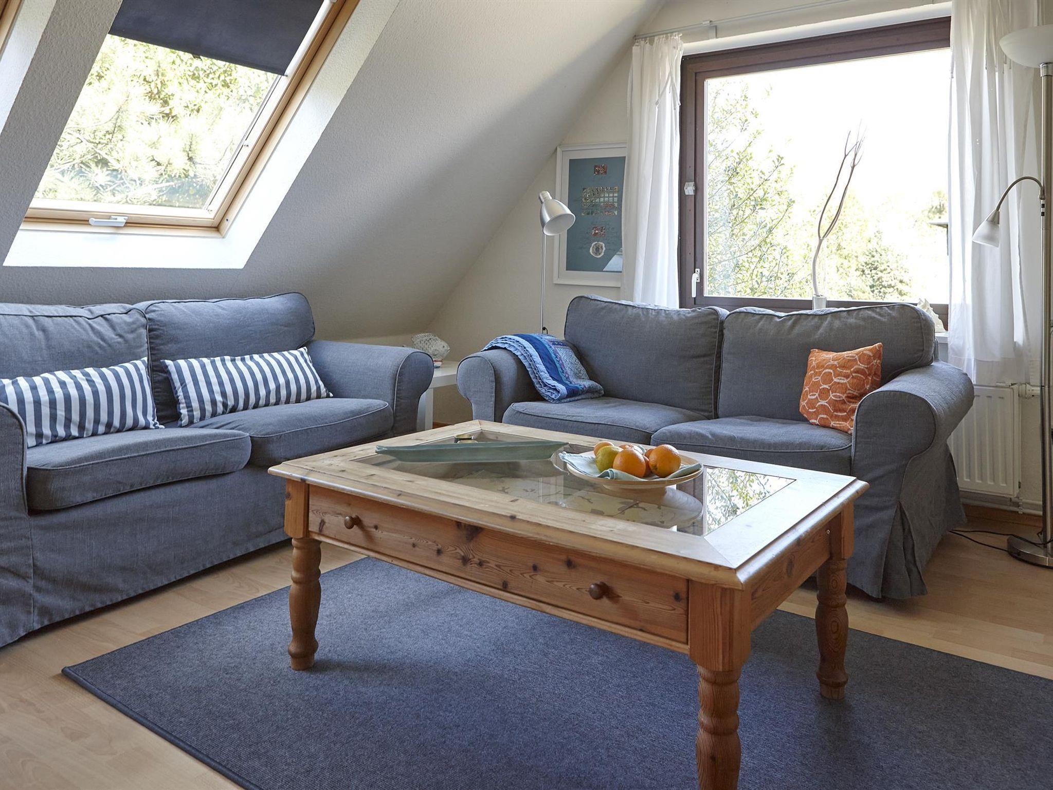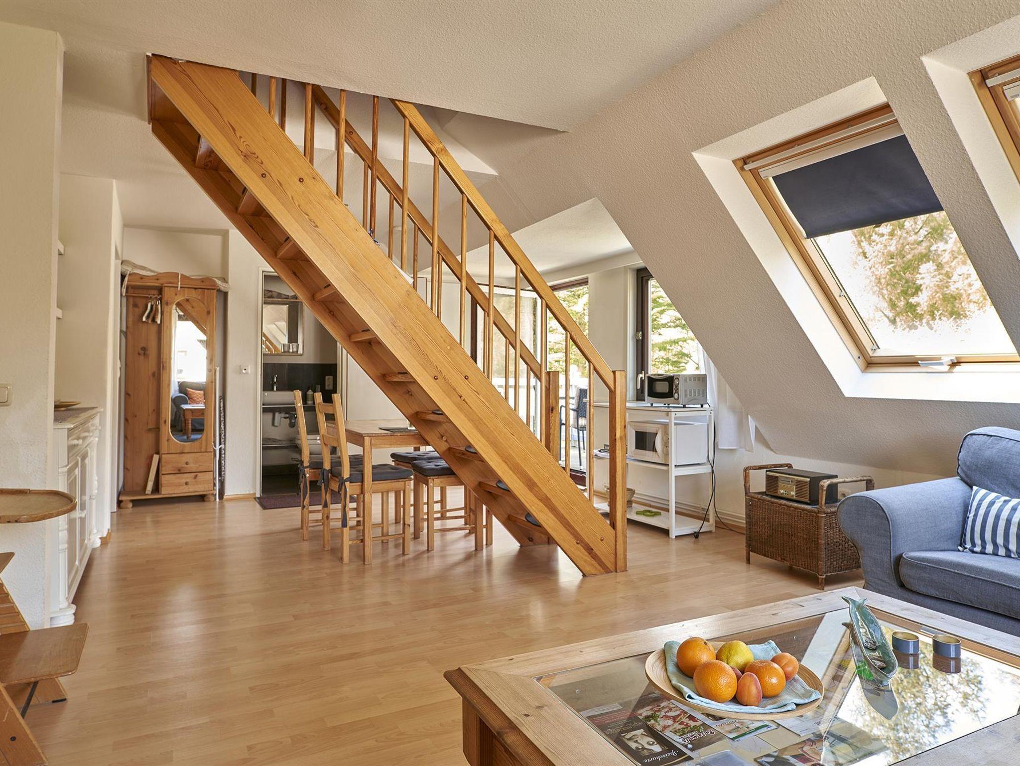 Ein grosses lichtdurchflutetes Wohnzimmer, großer West-Balkon mit Gartenmöbeln, Verdunklungsrollos an den großen Veluxfenstern, wunderschöner Blick in Garten und Wald,