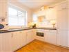 Separate Küche mit Backofen, Mikrowelle, Geschirrspüler, Kühlschrank mit Gefrierfach, Philips Senseo Kaffee-Kapselmaschine und Waschmaschine.