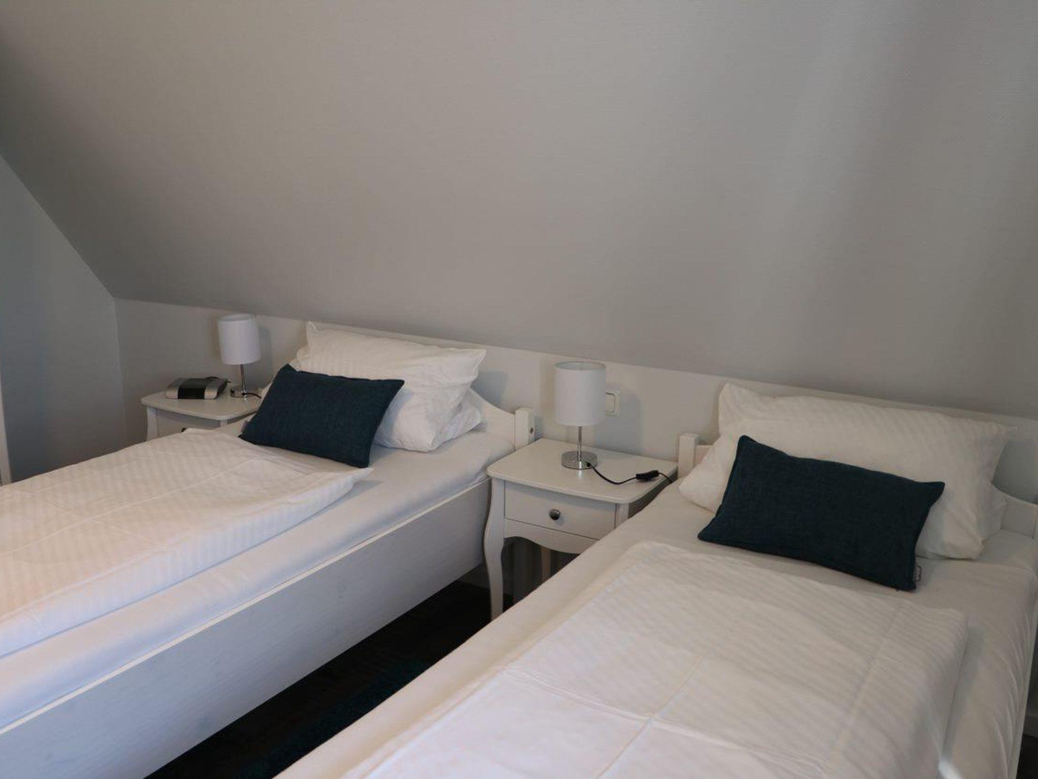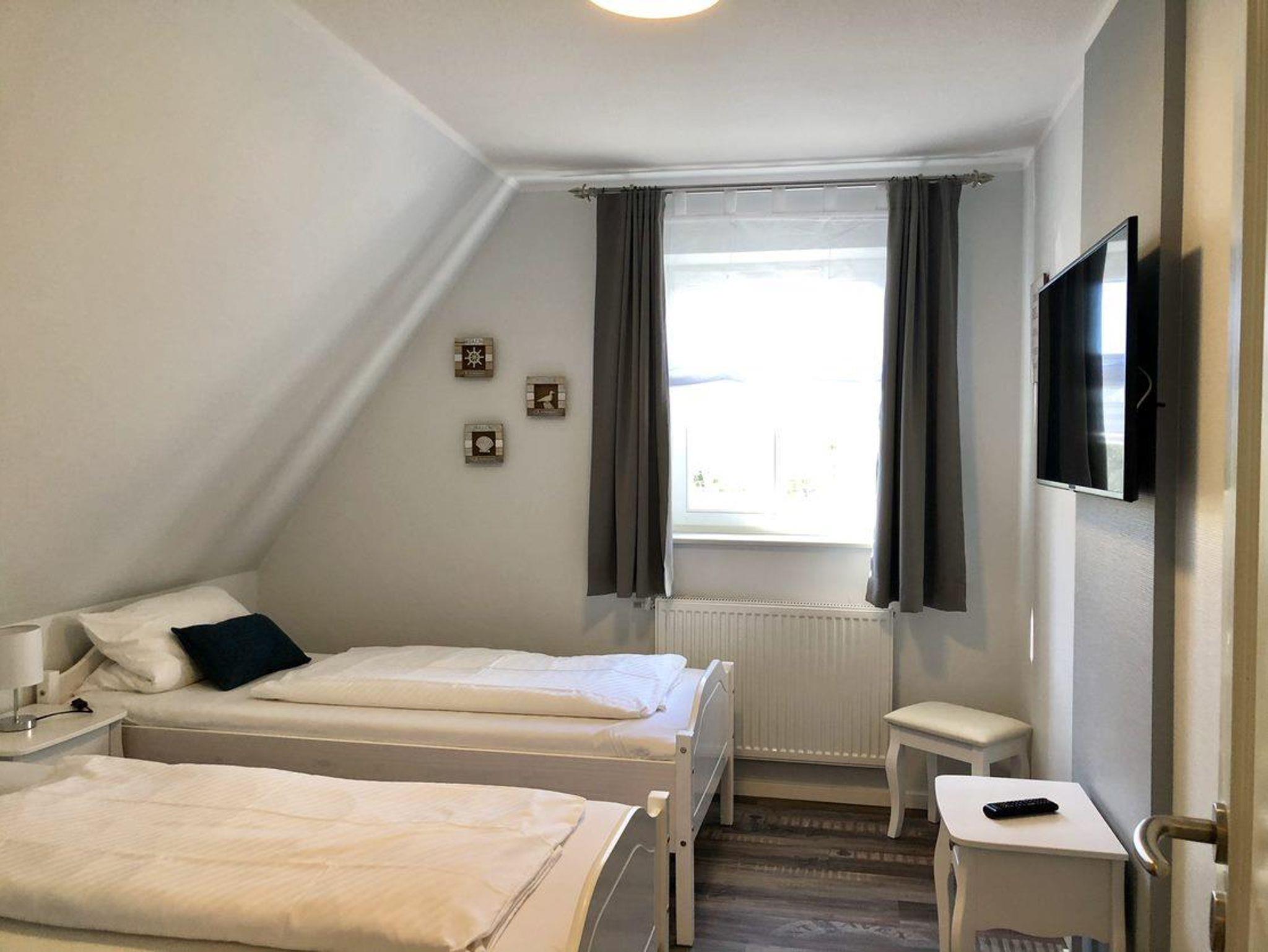 Im Obergeschoss befindet sich ein Schlafzimmer mit zwei Einzelbetten (90x200) sowie ein weiteres Schlafzimmer mit einem Doppelbett (180x200). Beide Zimmer sind mit einem Flatscreen-TV ausgestattet.