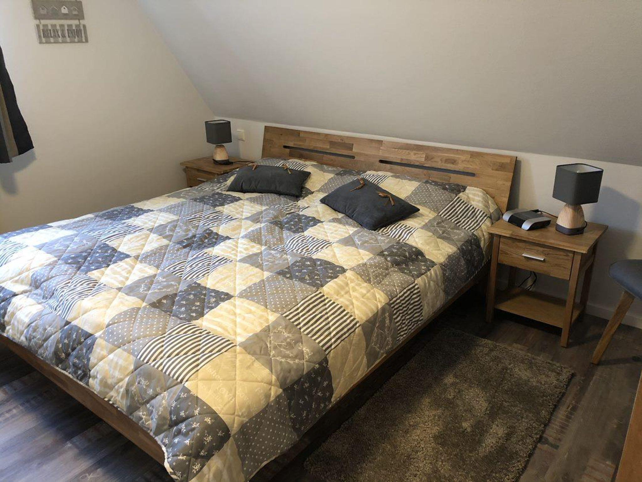 Das Schlafzimmer im Erdgeschoss ist mit einem Boxspringbett (160x200), einem Kleiderschrank, einer Schrankkommode sowie einem Nachttisch ausgestattet ist.