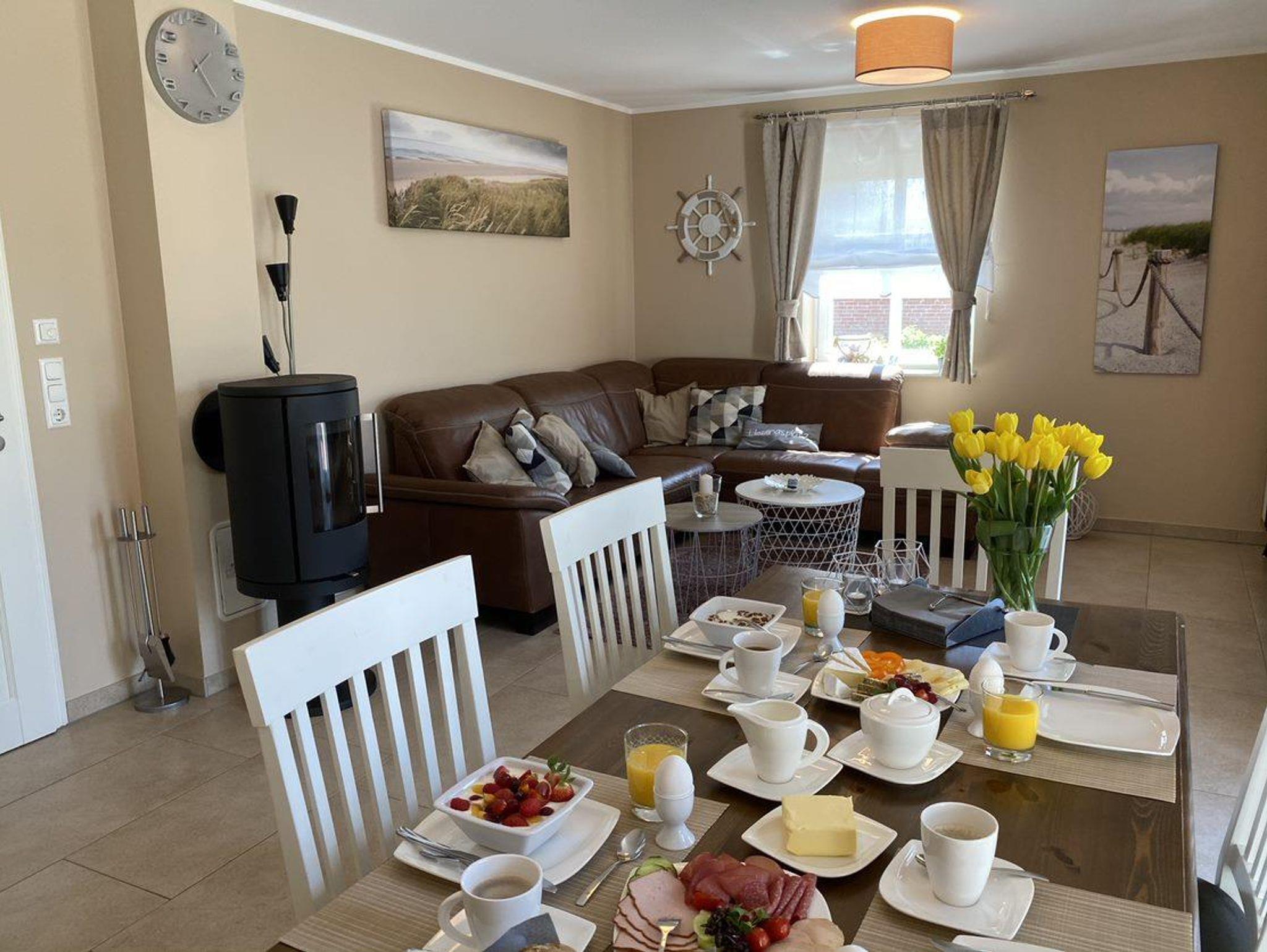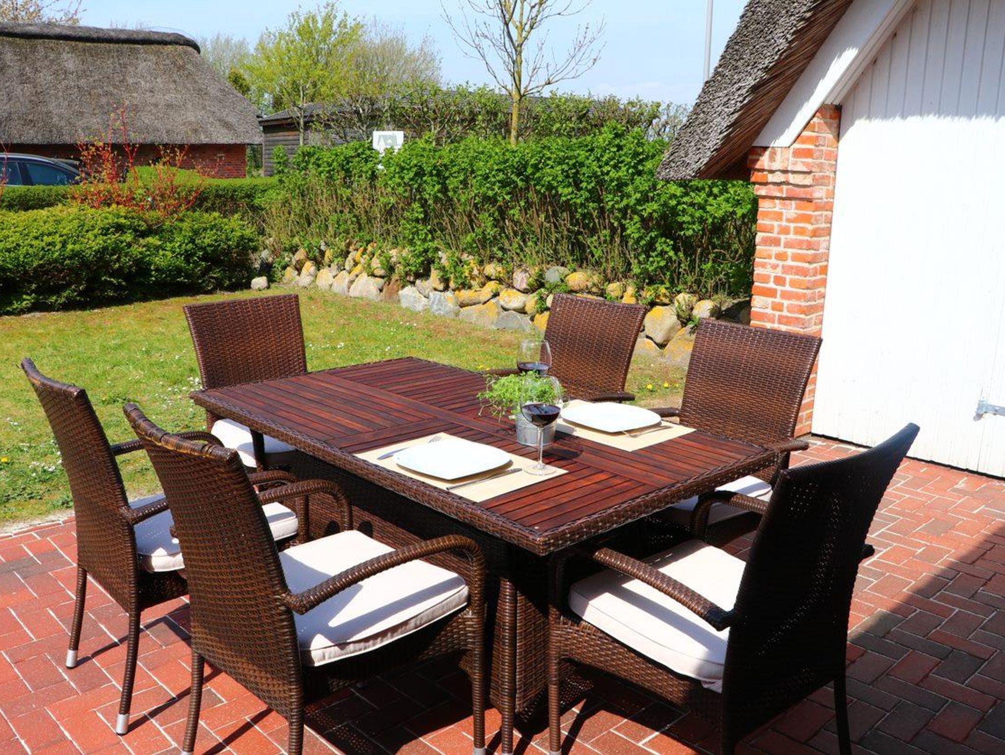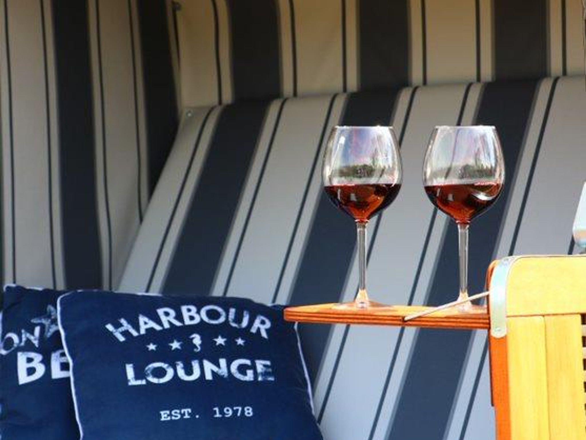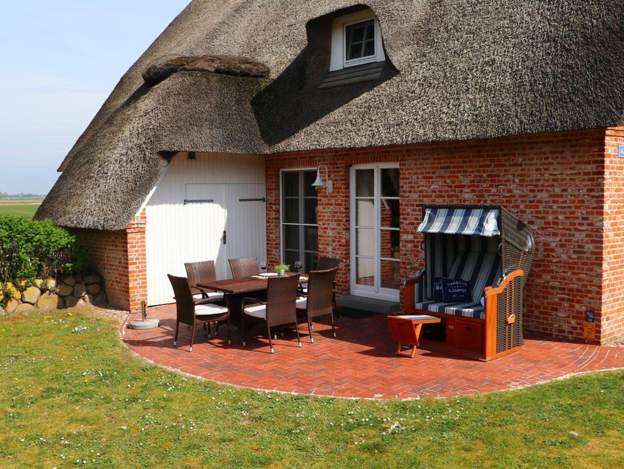 Eine möblierte Südwest-Terrasse, zwei Sonnenliegen und ein gemütlicher Strandkorb sowie ein vom Friesenwall eingebetteter Sitzplatz sind mit einer Brise „Westwind“ jederzeit für Sie reserviert.