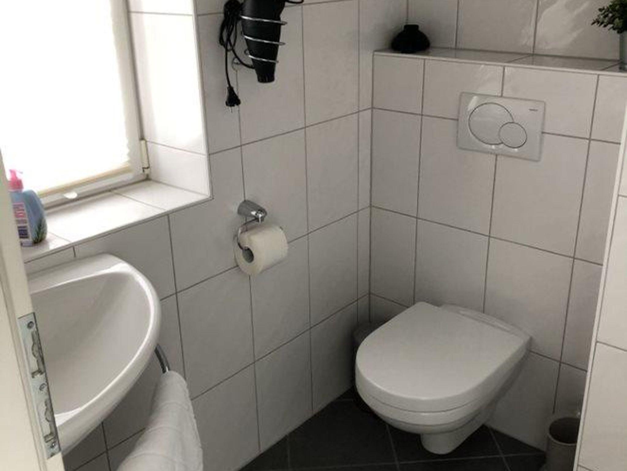 Das Duschbad wird per Handtuchheizkörper sowie einer Fußbodenerwärmung beheizt. Die Dusche verfügt über einen niedrigen Einstieg.