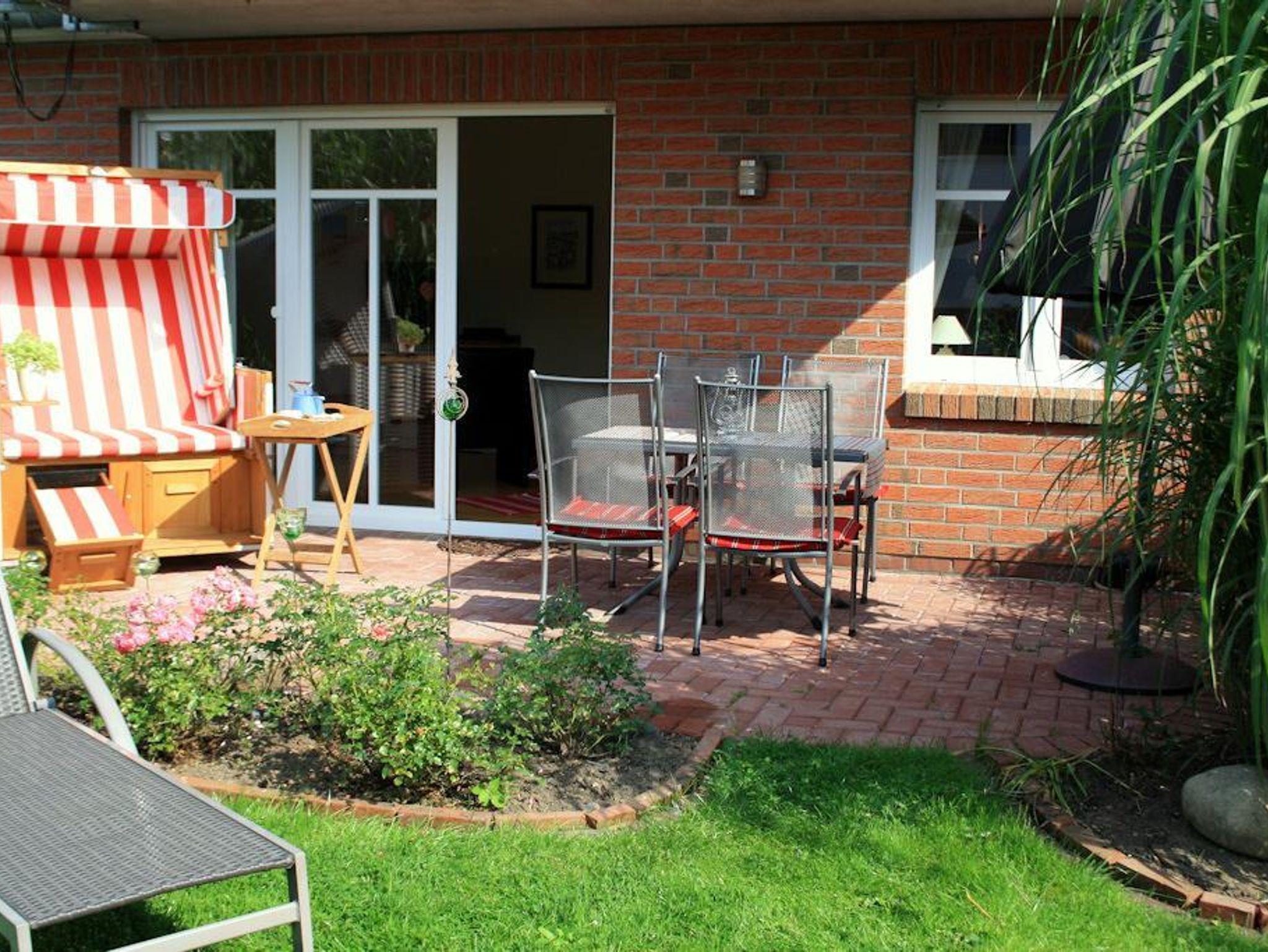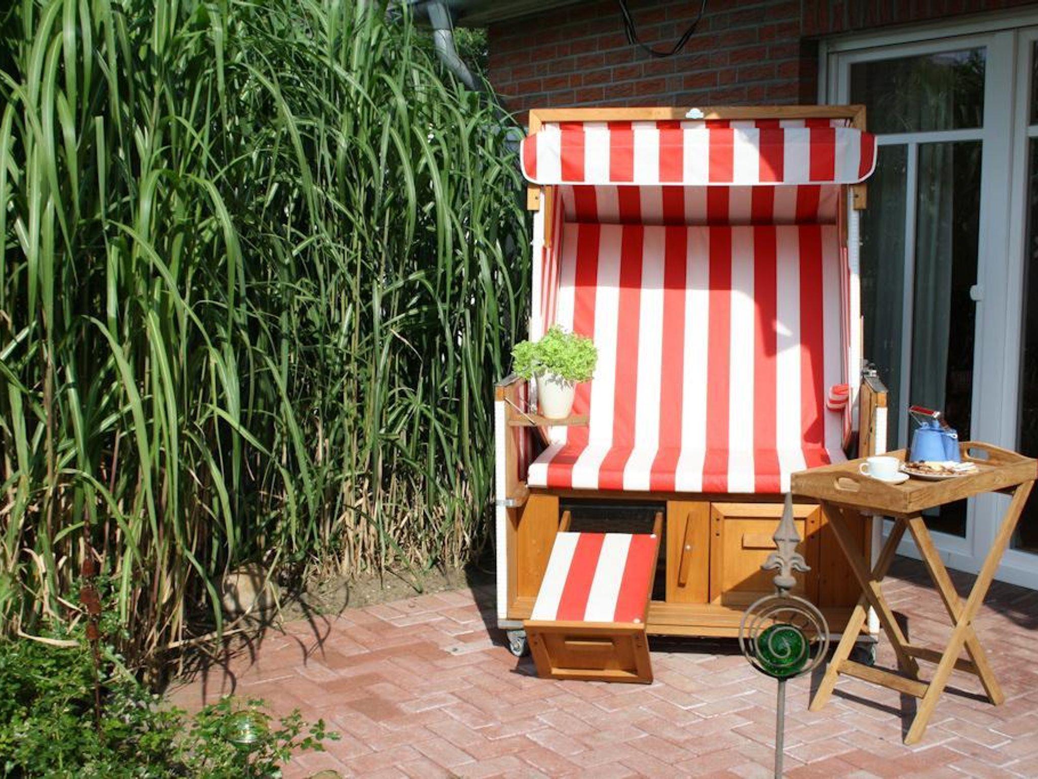 Das Grundstück der Wohnung umfasst 1600qm. Auf der nach Westen liegenden Terrasse stehen Ihnen Gartentisch mit Stühlen, Sonnenschirm, Liegestuhl, Strandkorb und ein Gartengrill zur Verfügung. Die Wohnung ist mit Rolläden ausgestattet (teilweise elektrisch). Ein Parkplatz und ein Fahrradschuppen gehören zur Wohnung.
