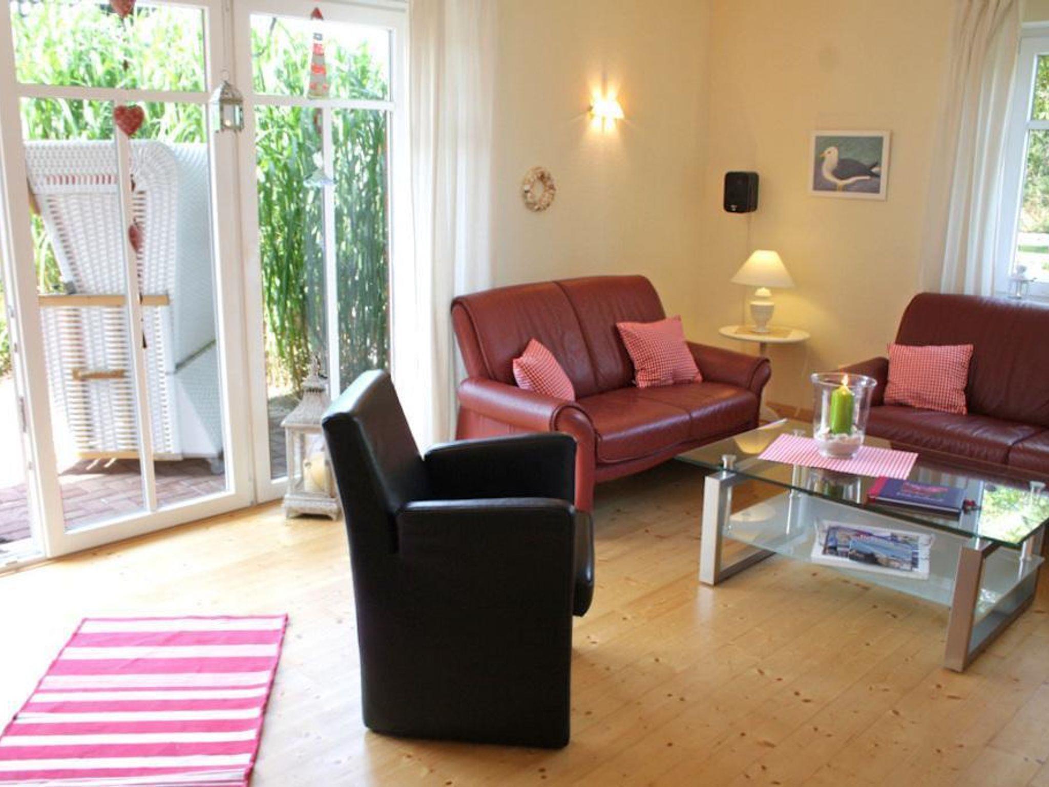 Diese 3-Zimmerwohnung mit 2 Schlafzimmern,einem Duschbad mit Sauna und WC bietet einen großzügigen Aufenthalt bis zu 4 Personen. Im 32qm großen Wohn- und Esszimmer befinden sich 2 moderne Sofas und 1 Sessel sowie ein Esstisch mit Stühlen und Einschiebebank. Designerleuchten verbreiten angenehmes Licht. Für kalte Wintertage gibt es einen Kaminofen. Die offene Markenküche hat eine großzügige Ausstattung in besonderer Qualität. Mikrowelle, Geschirrspüler, Umluftherd, Ceranfeld, Gefrierkombination, eine komplette Küchenaustattung und hochwertiges Geschirr sind Standard. In den Schlafräumen befinden sich 1 nobles Doppelbett im Retro-Look und zum anderen 2 Einzelbetten. Die Fenster in den Schlafräumen sind mit Fliegengittern ausgestattet. Das hochmoderne Bad verfügt über Dusche mit Glasschiebetür, Waschtisch, Fön, WC, Handtuchwärmer sowie Fußbodenheizung.