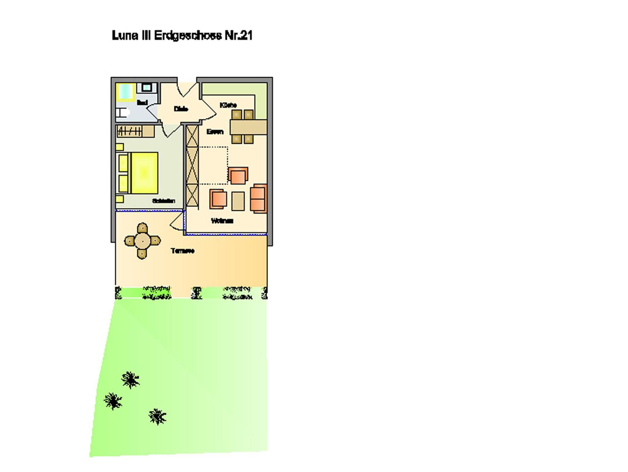 Eingangsbereich mit Garderobe, offener Wohnraum mit Essbereich und integrierten Einbauküche, Einzelschrankbett (90x200cm, Matratze ), direkter Zugang zur Südterrasse mit Gartenmöbeln und Strandkorb, von hier direkt in den Garten, Schlafzimmer mit Doppelbett (180x200cm,getrennte Matratzen), 1 Duschbad mit WC und Waschbecken.