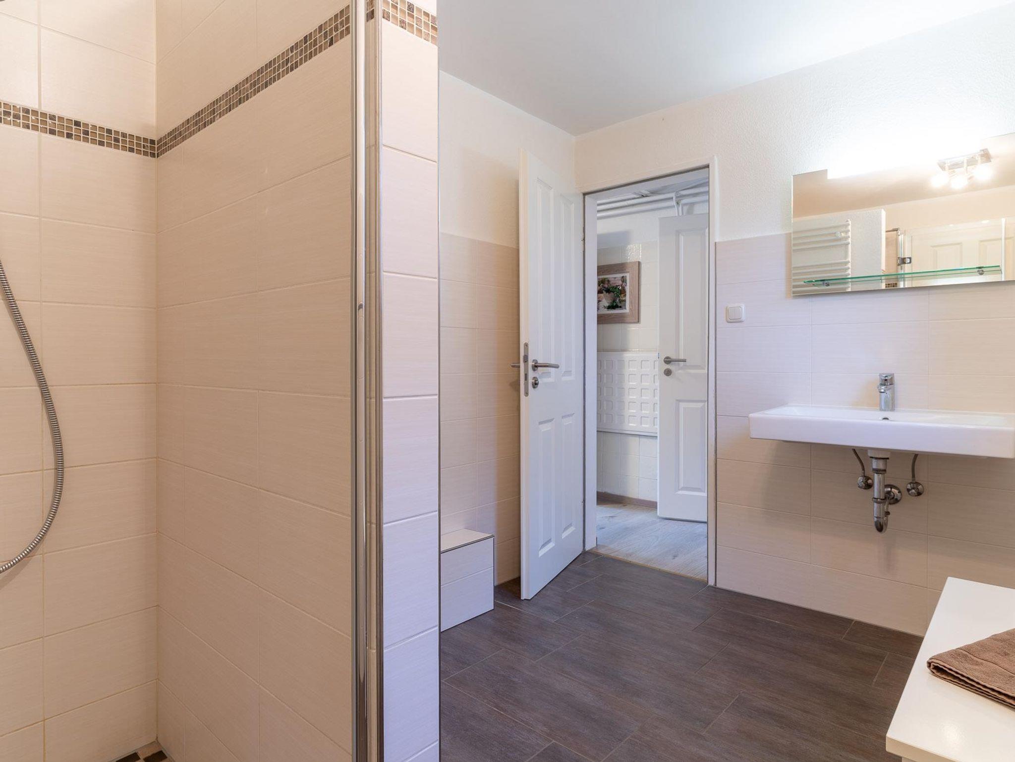 Im Tageslicht-Duschbad finden sie reichlich Ablagefläche. Das WC ist separat.