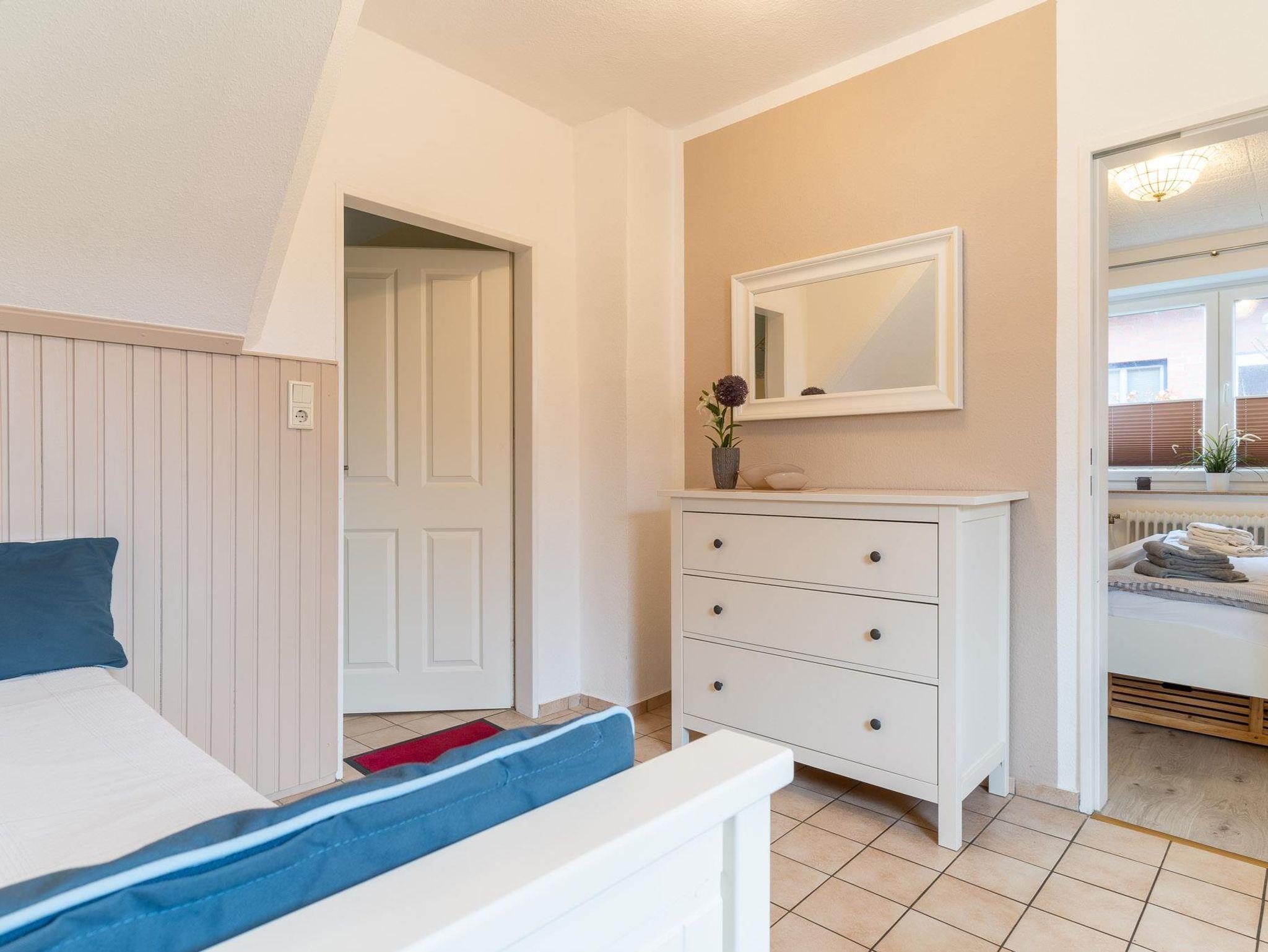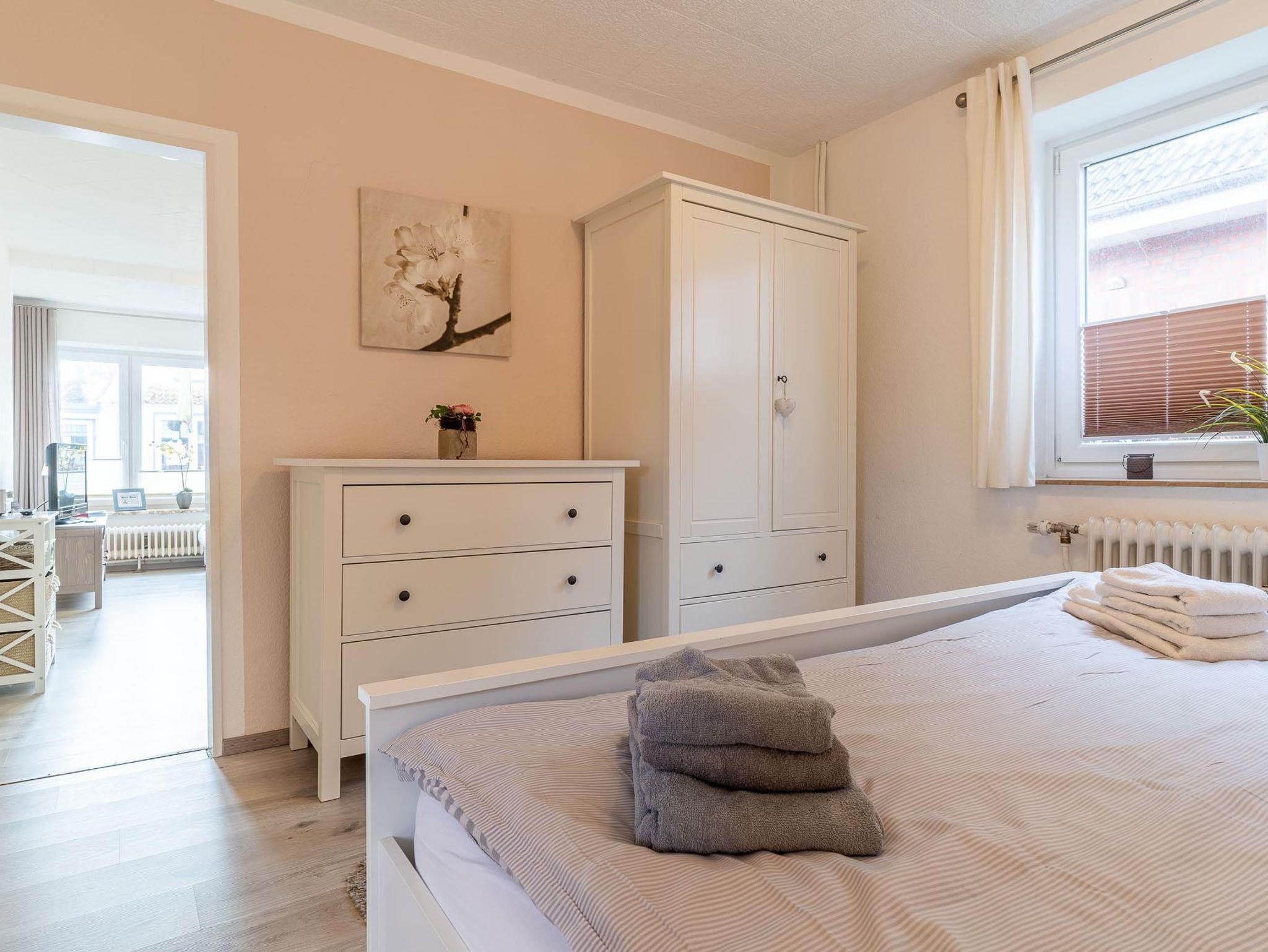 Ein Schlafzimmer für 2 Personen mit einem Doppelbett und das Einzelbett im Durchgangszimmer, bieten mit den kuscheligen Betten die besten Voraussetzungen für einen erholsamen Schlaf. An den Fenstern befinden sich Plissee´s.