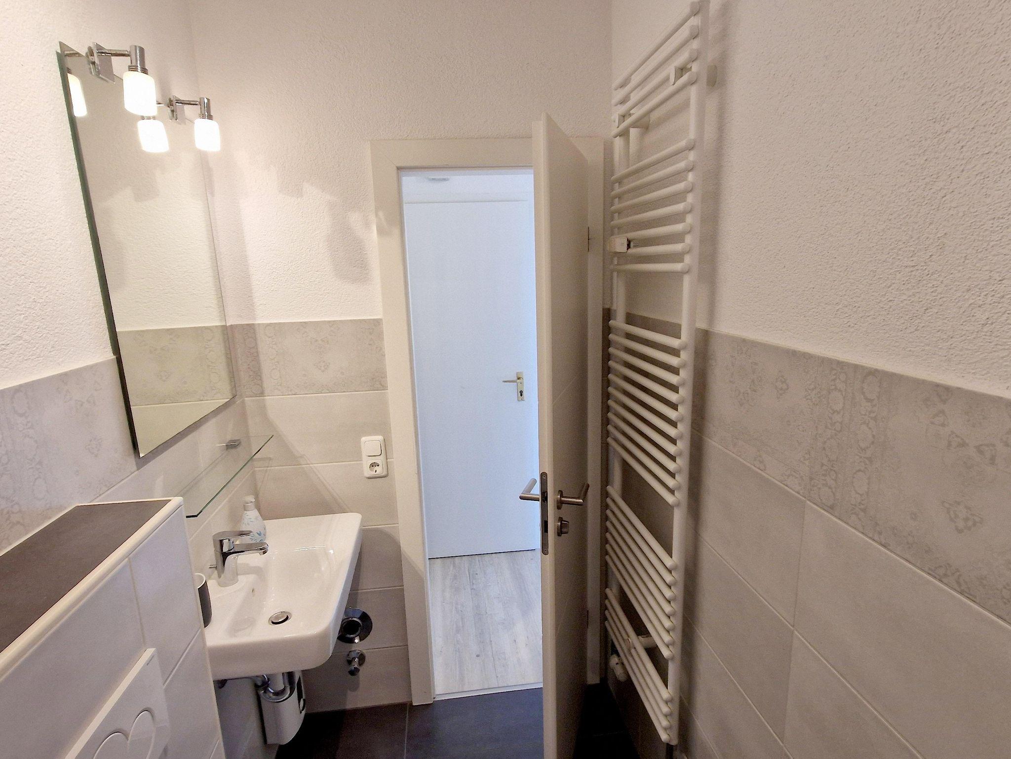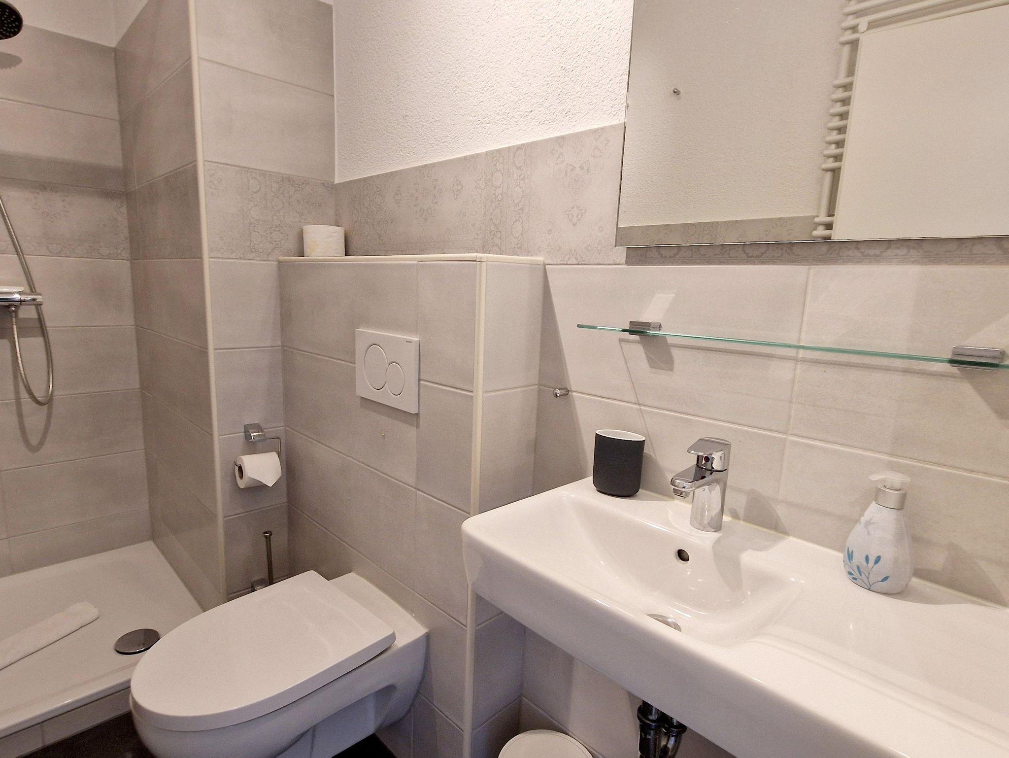 Bad: Dusche, Waschbecken, WC, Spiegel